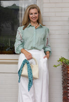 STYLE TIP: A timeless cotton blouse featuring a soft rounded collar and relaxed, voluminous sleeves accented with delicate lace detailing. The structured yet graceful silhouette works beautifully with neutral bottoms like our Hayley Linen Pant in White or Stella Trouser in Ecru for an effortlessly polished look.