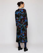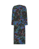 This midi dress in blue features a brushstroke print with a straight neckline and draped shoulders and waist. It has long sleeves, a central back opening, and an invisible zip at the back. The dress is fully lined and offers a semi-fitted silhouette.