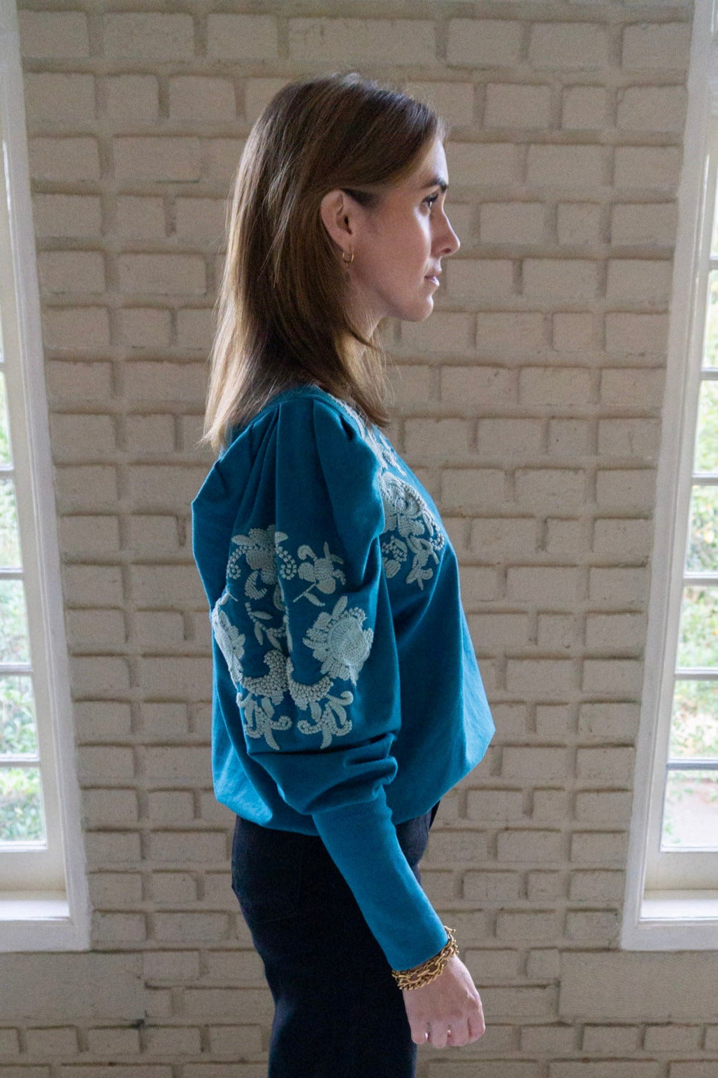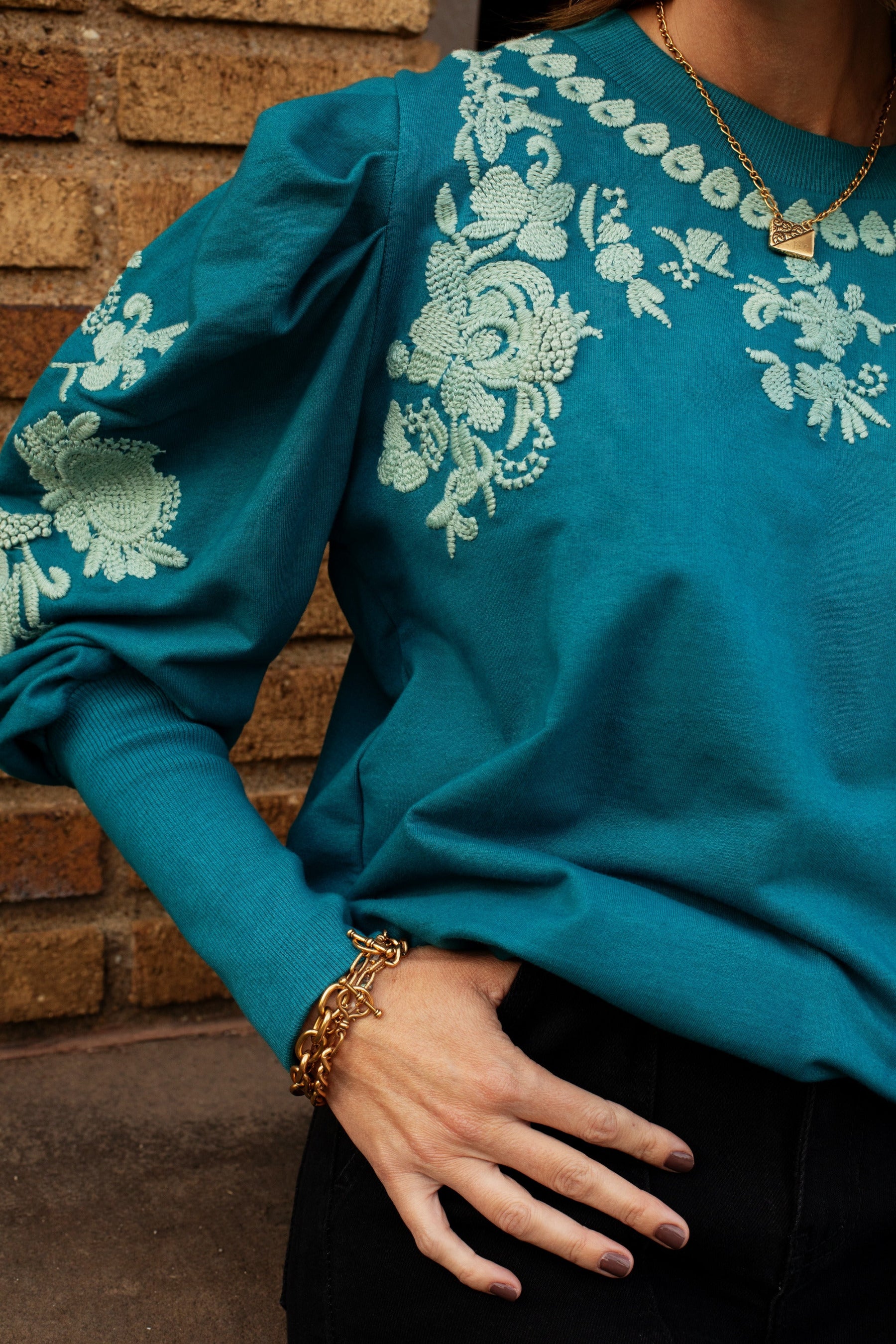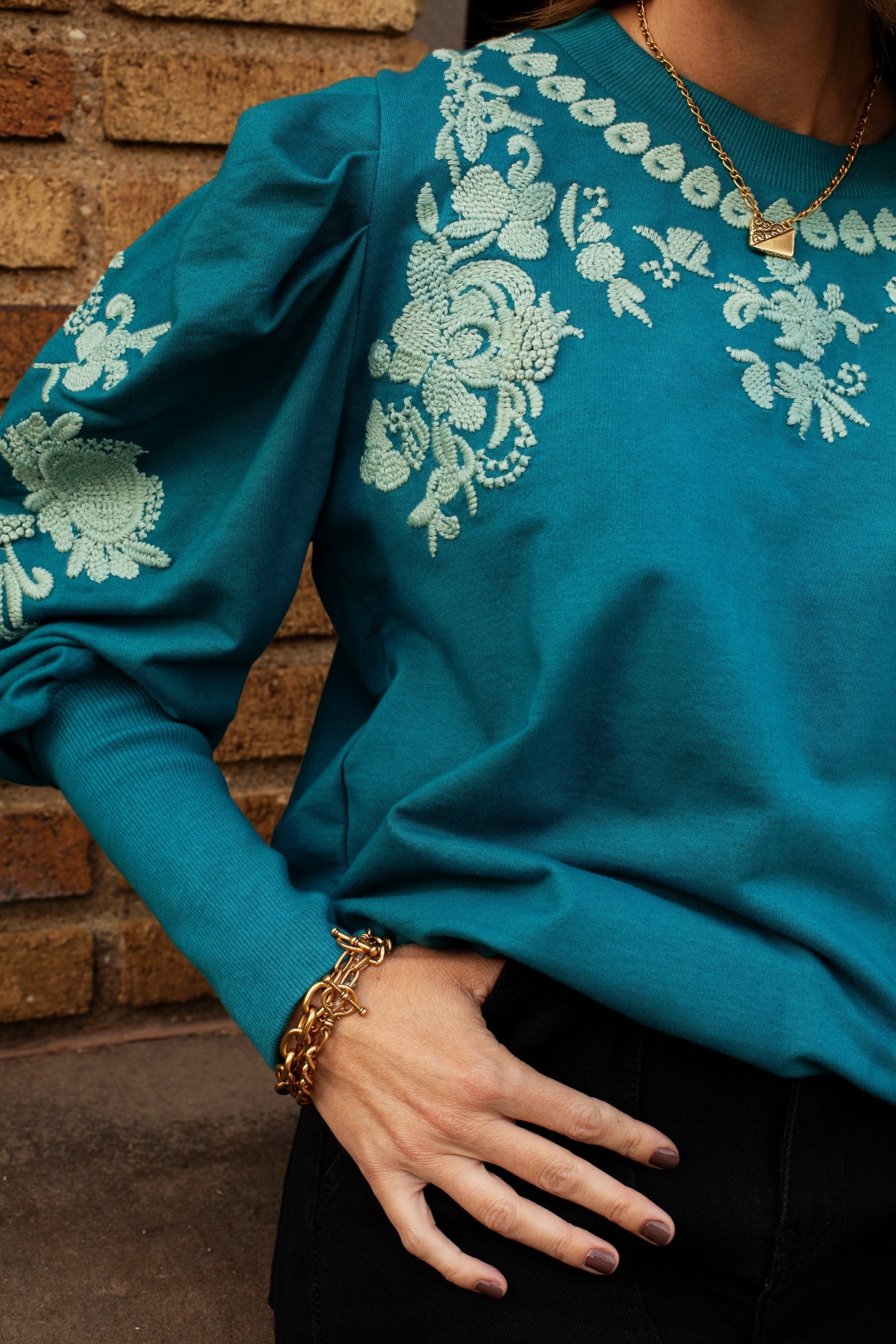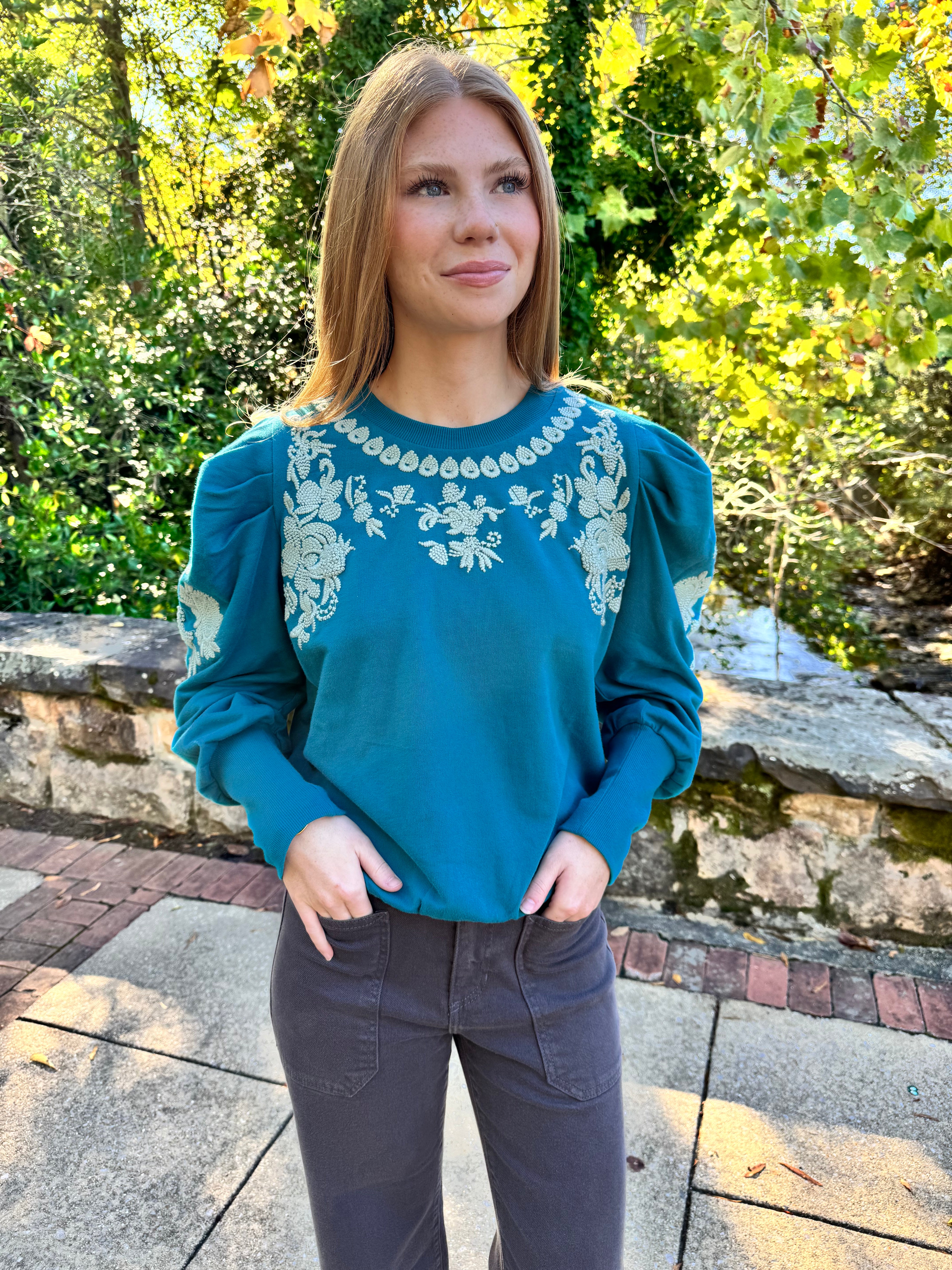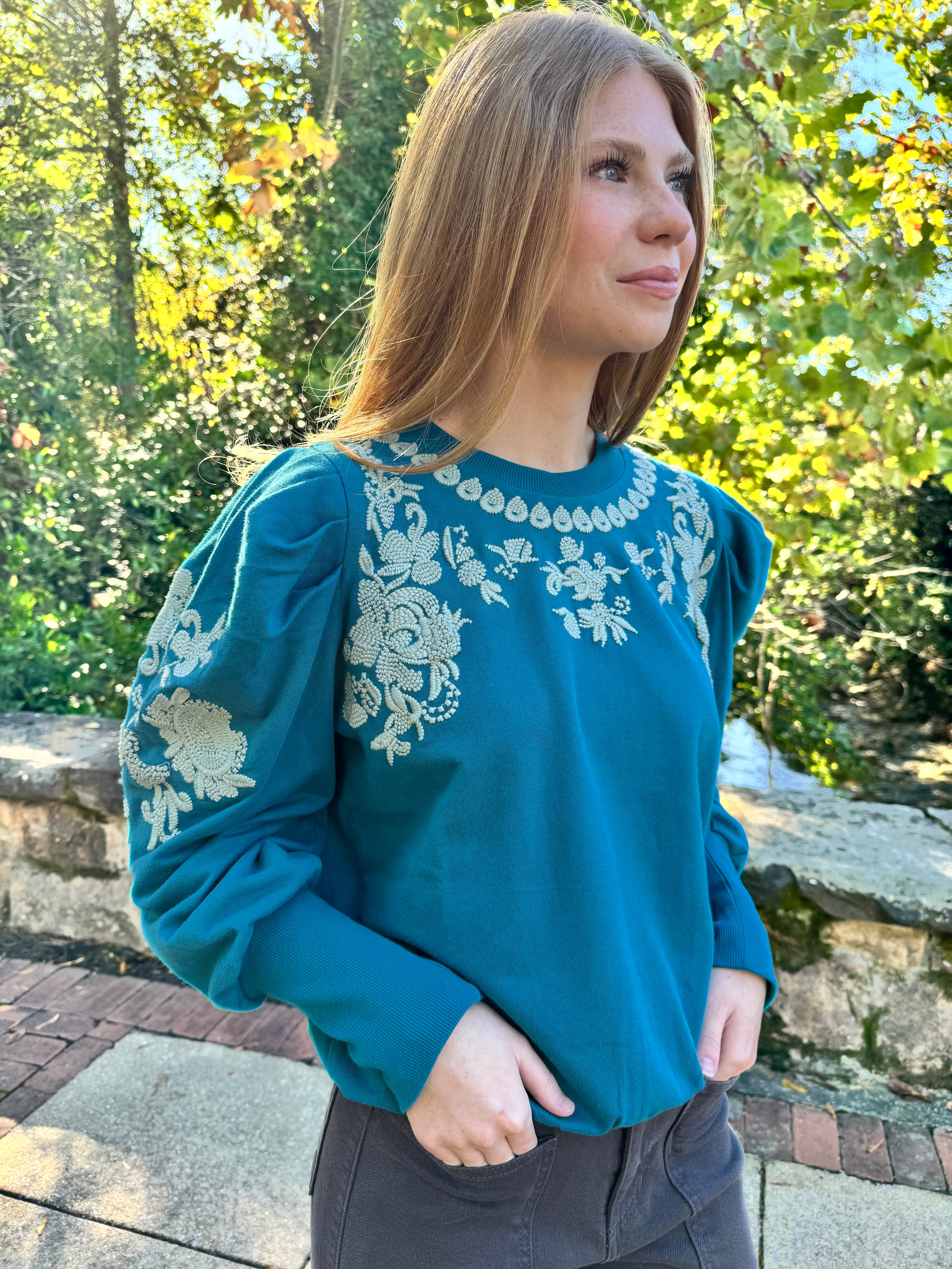 Ruthie Embroidered Sweatshirt in Teal by ExVoto