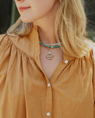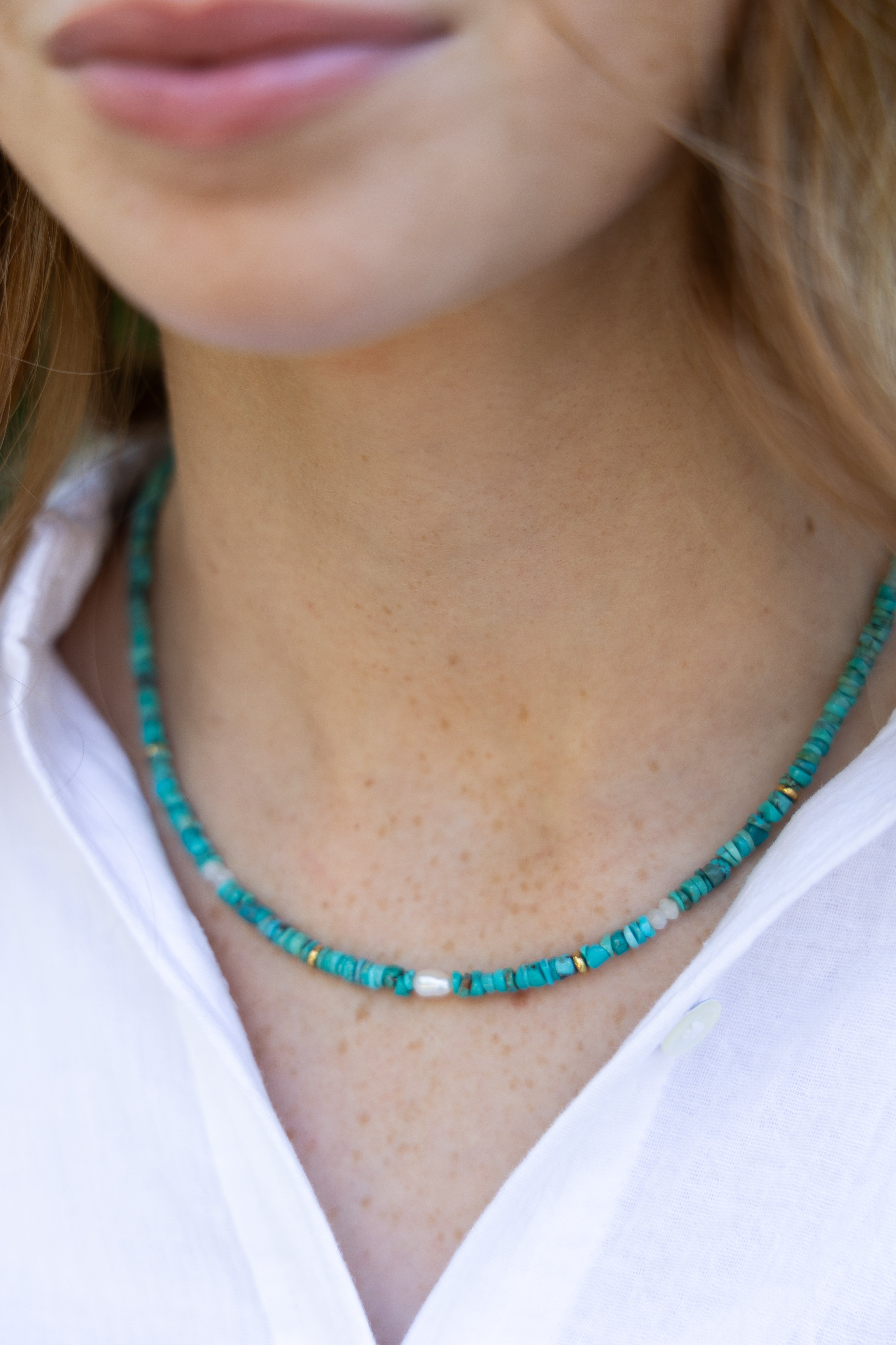 18" necklace made of genuine turquoise, pearl, moonstone, and brass beads. Adjustable from 16"-18" with a lobster clasp closure.