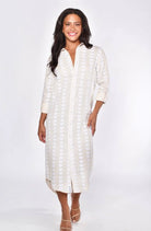 A timeless midi shirtdress featuring cream cotton with scattered white hearts throughout. Emily Phillips design offers versatile styling—wear it casually with sneakers for everyday comfort or elevate it with heels for evening occasions. The relaxed fit and soft fabric make it an easy go-to piece for any season.