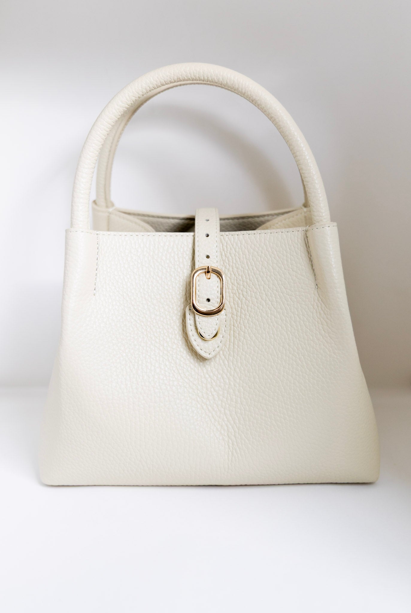 This box shaped bag is a unique and versatile style. Wear as a hand-held or elbow bag, then add the cross body strap for a hands-free option. The ecru color can be paired with any shoe color, and works across all seasons.