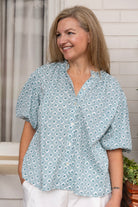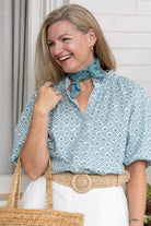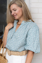 STYLE TIP: The popular Daisy Blouse in a lightweight cotton with a blue lattice print. Designed with a universally flattering fit, it suits women of all ages and body types. Style it effortlessly with denim for a casual look or elevate it with ecru trousers for a polished ensemble. Your go-to blouse this Spring!