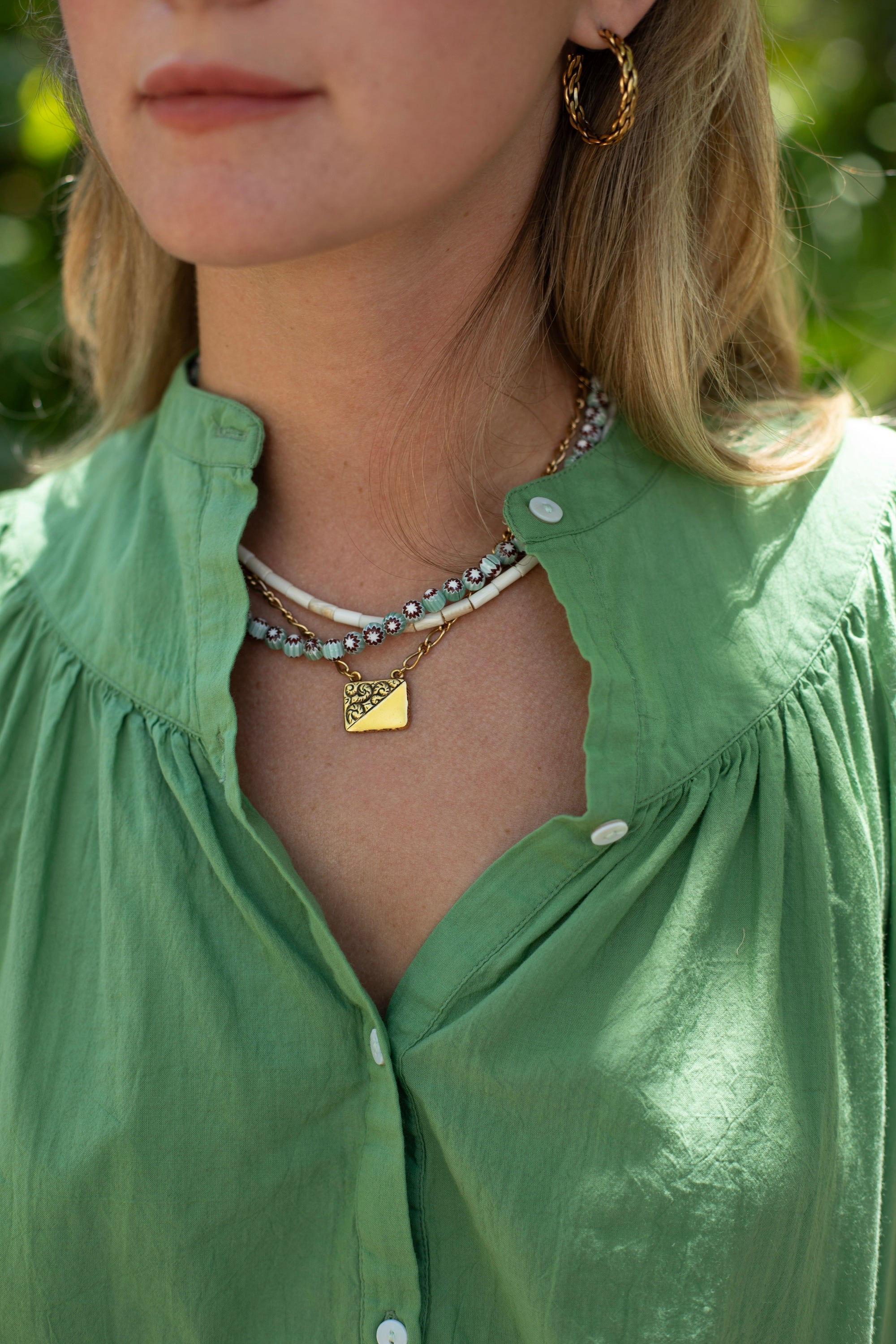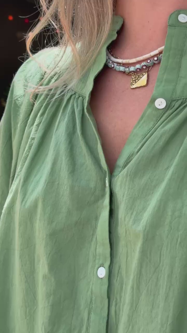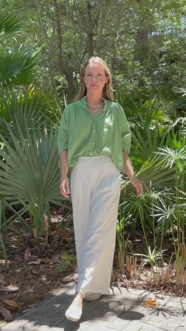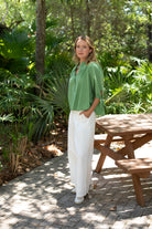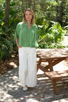 STYLE TIP: The Fleur Blouse in Turf Green is made from soft breathable cotton with a relaxed, boxy silhouette that flatters all body types. Wear it loose or tucked—pairs beautifully with the Hayley White Trouser, denim, or shorts.