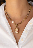 - 18" necklace features plated 18k gold chain with a protective matte finish, a freshwater pearl, and our Exclusive ExVoto Vintage toggle closure at front