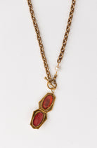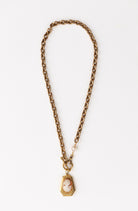 - 18" necklace features plated 18k gold chain with a protective matte finish, a freshwater pearl, and our Exclusive ExVoto Vintage toggle closure at front