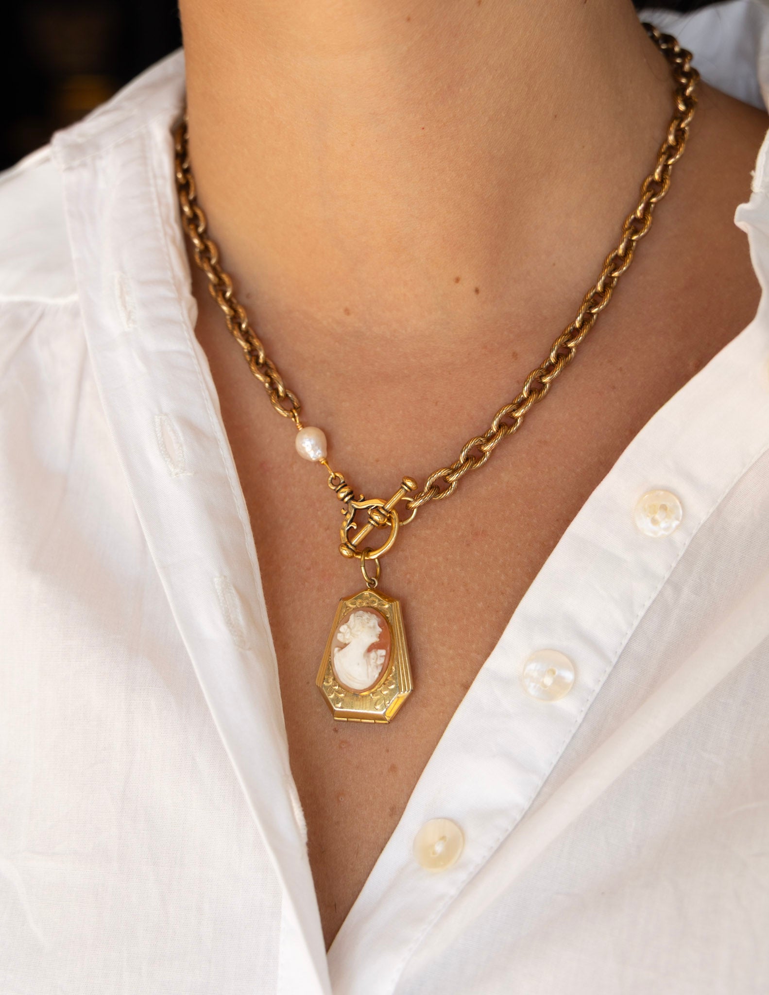 - This necklace features a one of a kind, antique, gold filled cameo locket that is 100 years old or more