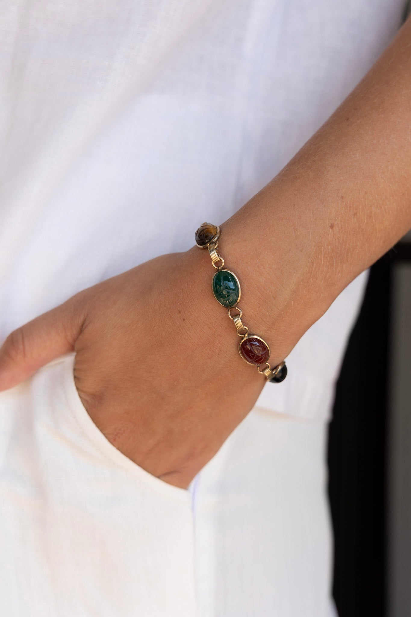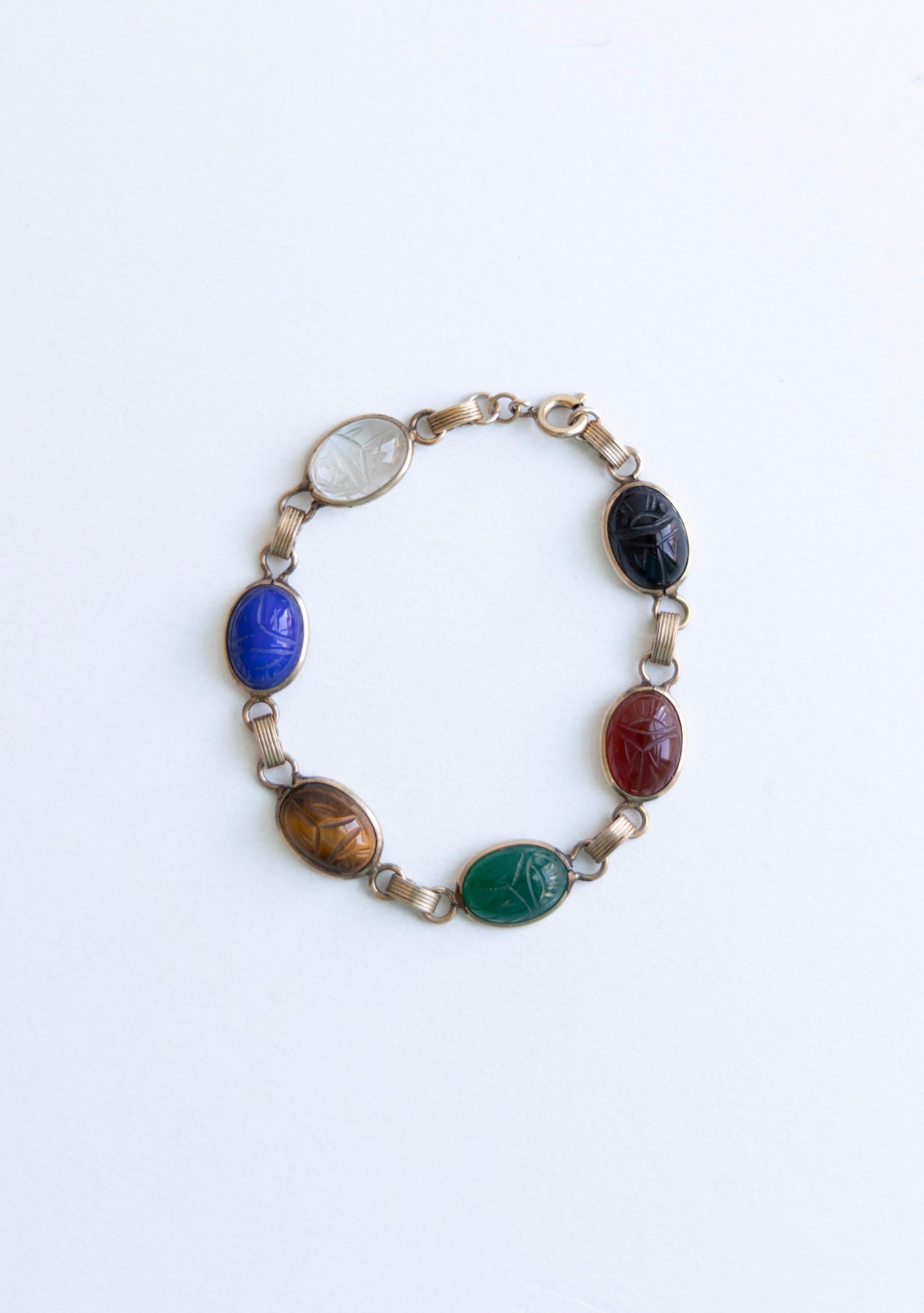 This 1950s vintage gold-filled bracelet features natural semi-precious stones shaped like scarabs and secures with a lobster clasp. Each piece is unique, making every bracelet in this limited series truly one-of-a-kind.
