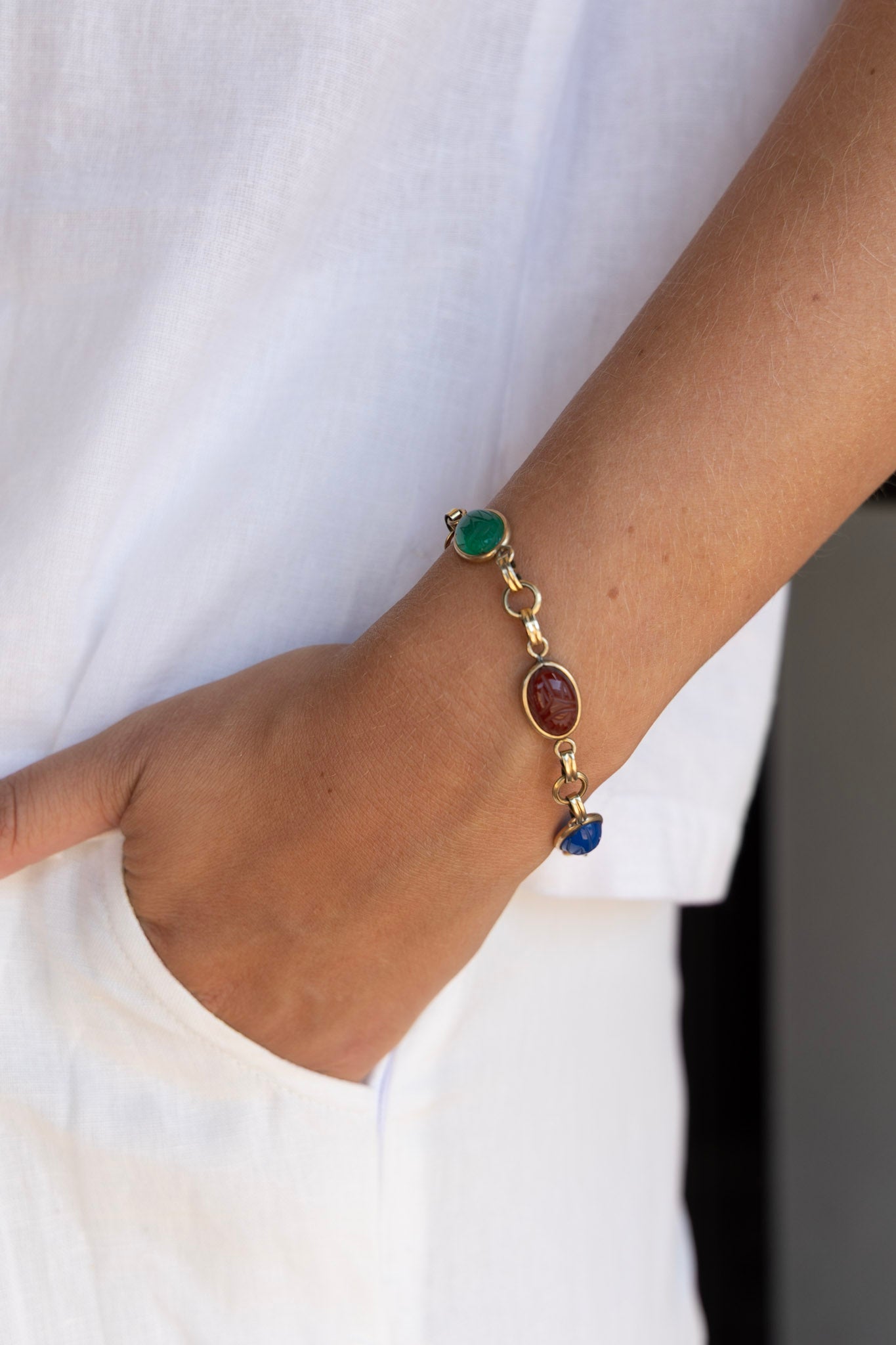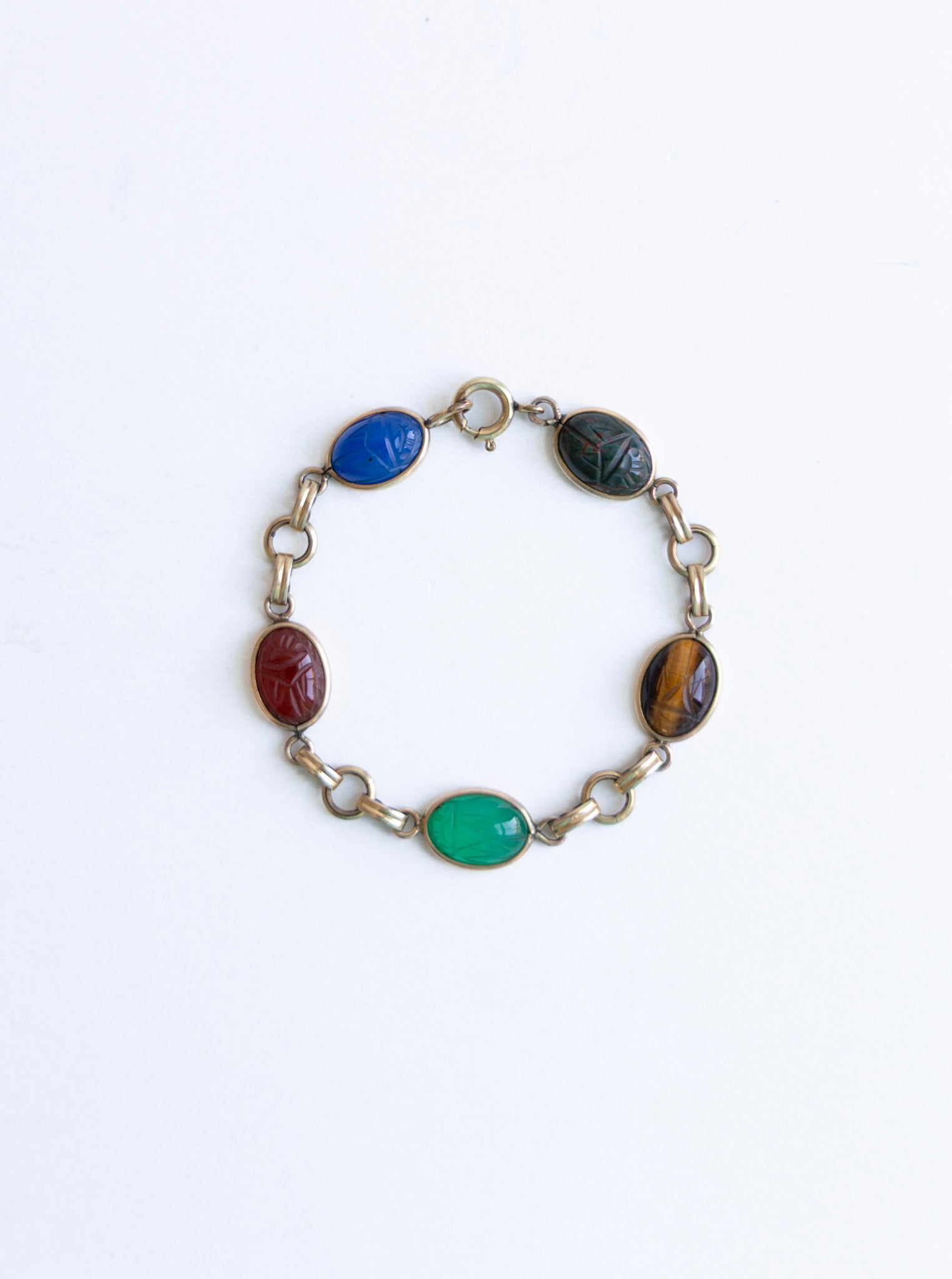 This 1950s vintage gold-filled bracelet features natural semi-precious stones shaped like scarabs and secures with a lobster clasp. Each piece is unique, making every bracelet in this limited series truly one-of-a-kind.