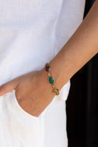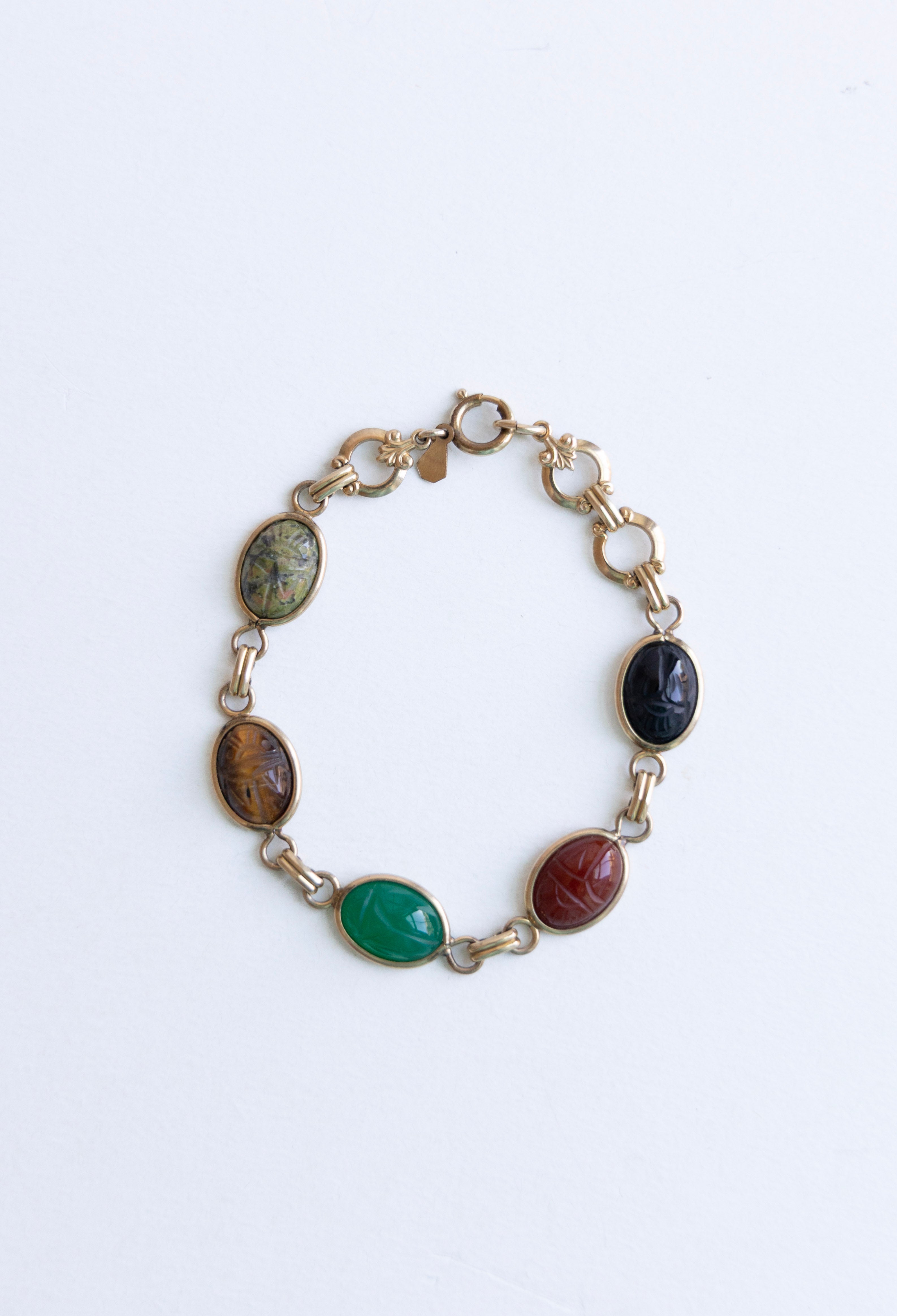 This 1950s vintage gold-filled bracelet features natural semi-precious stones shaped like scarabs and secures with a lobster clasp. Each piece is unique, making every bracelet in this limited series truly one-of-a-kind.