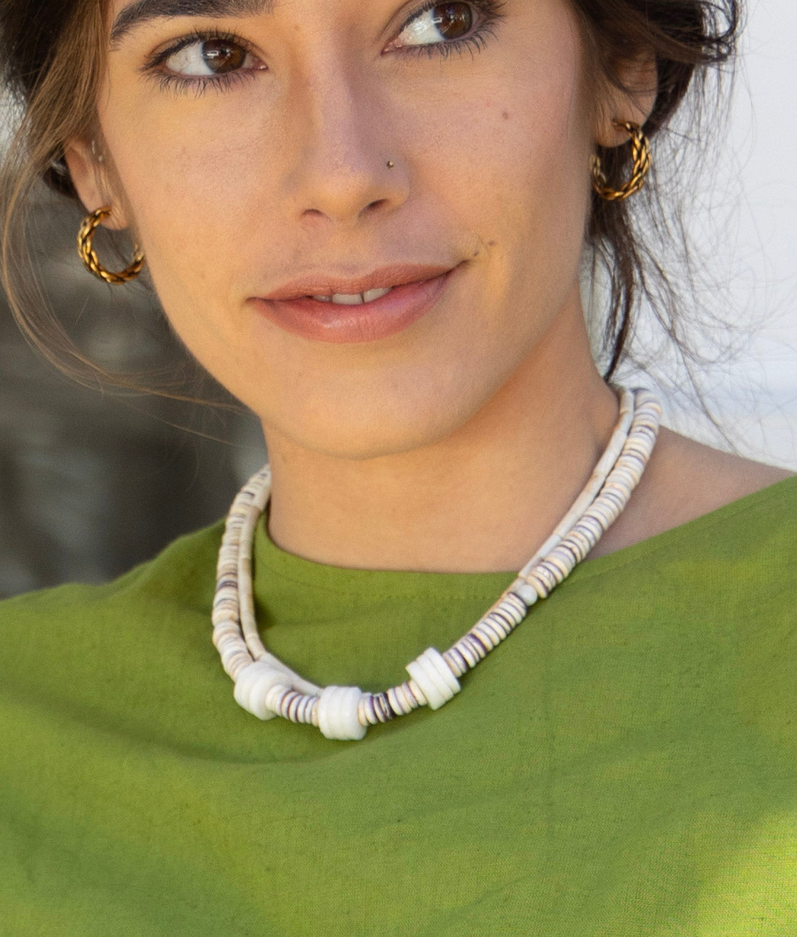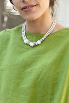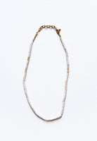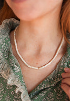 This necklace features genuine oyster shell beads and is adjustable from 16"-18" with a lobster clasp closure.
