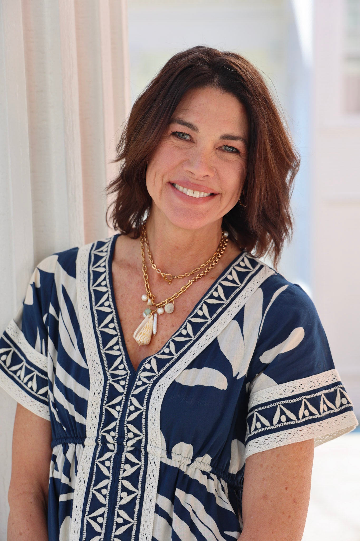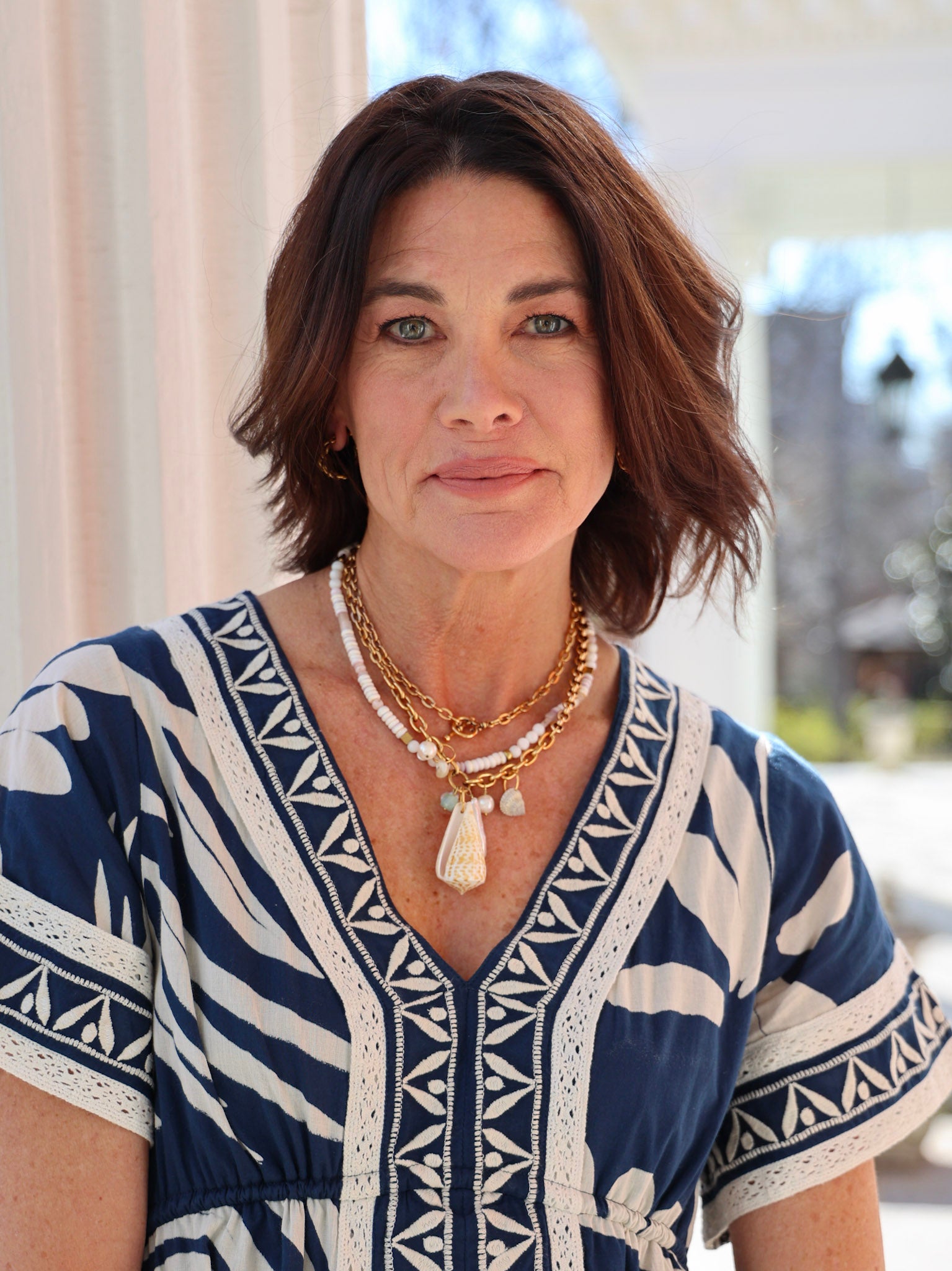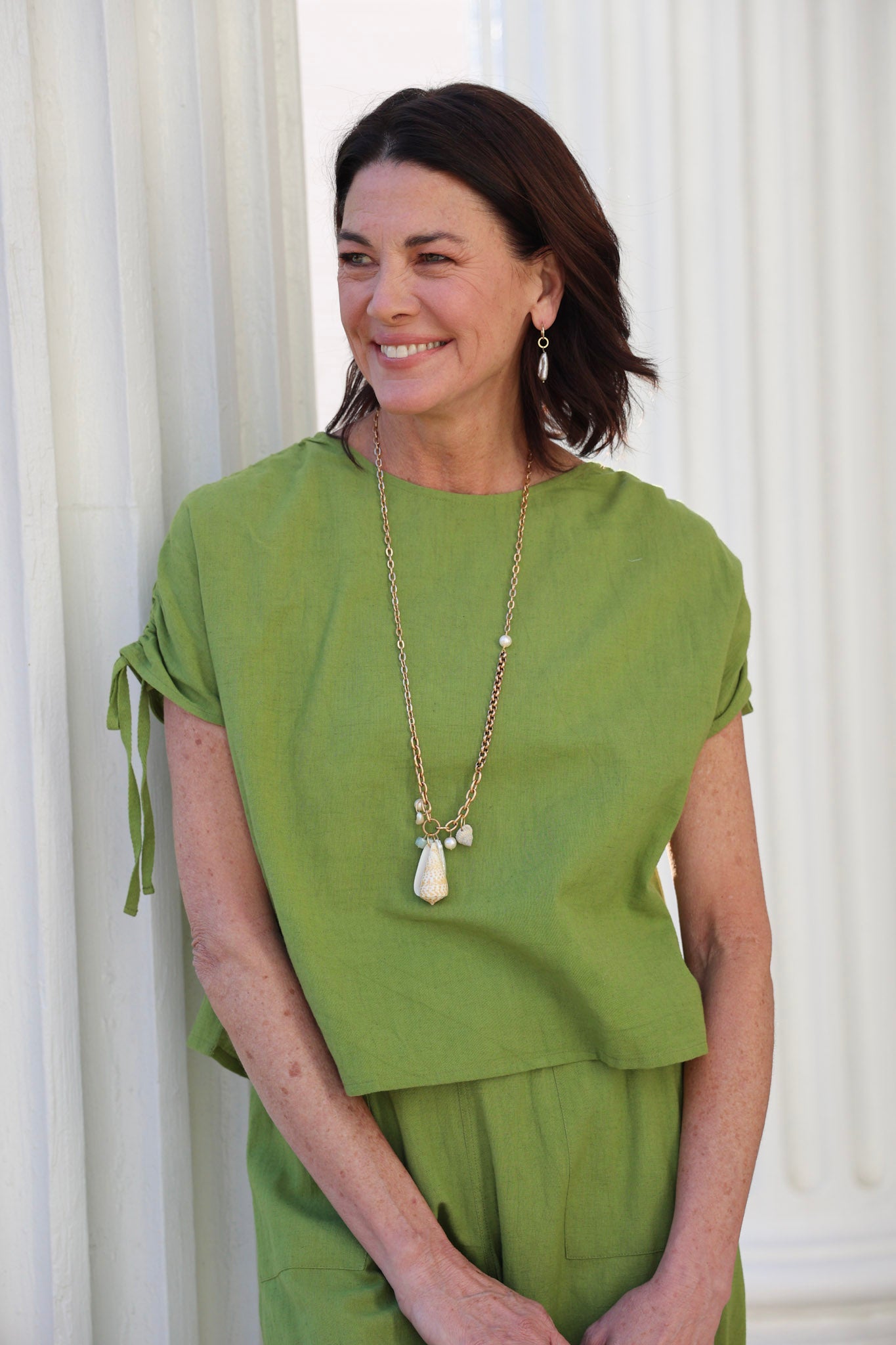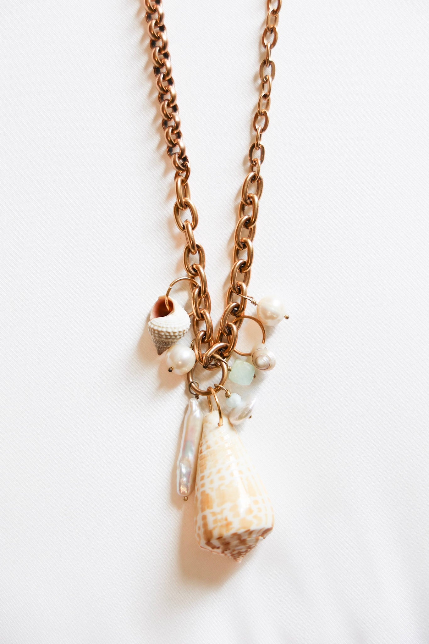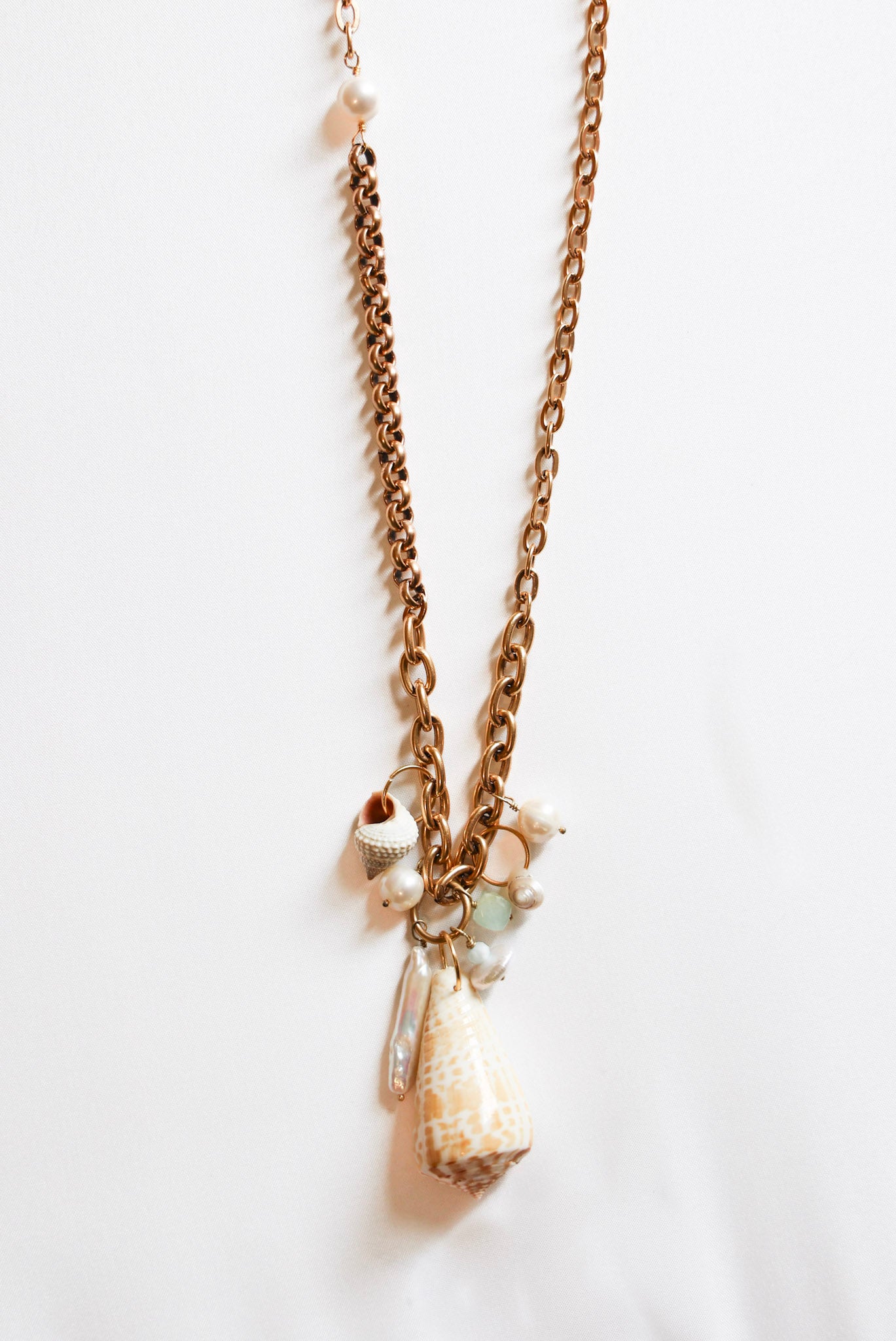 34" necklace featuring freshwater pearls, various shells, and 18k gold plated chain with our Exclusive ExVoto Vintage Toggle Closure at back. Wear it long or style it doubled as a short layered necklace look!