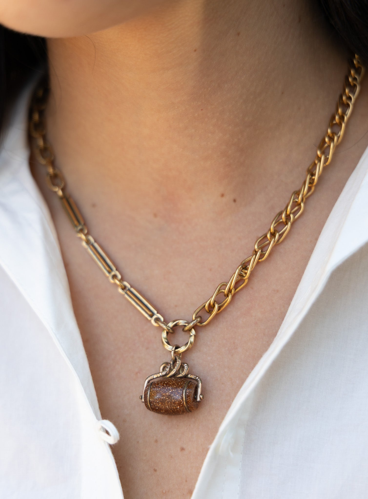 - This necklace features a one of a kind, antique, gold stone barrel fob that is 100 years old or more