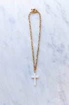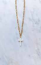 This 18" necklace features plated 18k gold chain with a protective matte finish and our Exclusive ExVoto Vintage toggle closure at the back. The necklace features a genuine antique ivory cross pendant discovered in Paris by our owner and founder Elizabeth Adams.