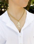 This 18" necklace features gold filled chain and a lobster clasp closure at the back. The necklace features a genuine antique ivory cross pendant discovered in Paris by our owner and founder Elizabeth Adams.