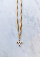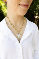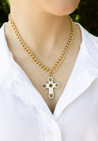 This 18" necklace features gold filled chain and a lobster clasp closure at the back. The necklace features a genuine antique ivory cross pendant discovered in Paris by our owner and founder Elizabeth Adams.