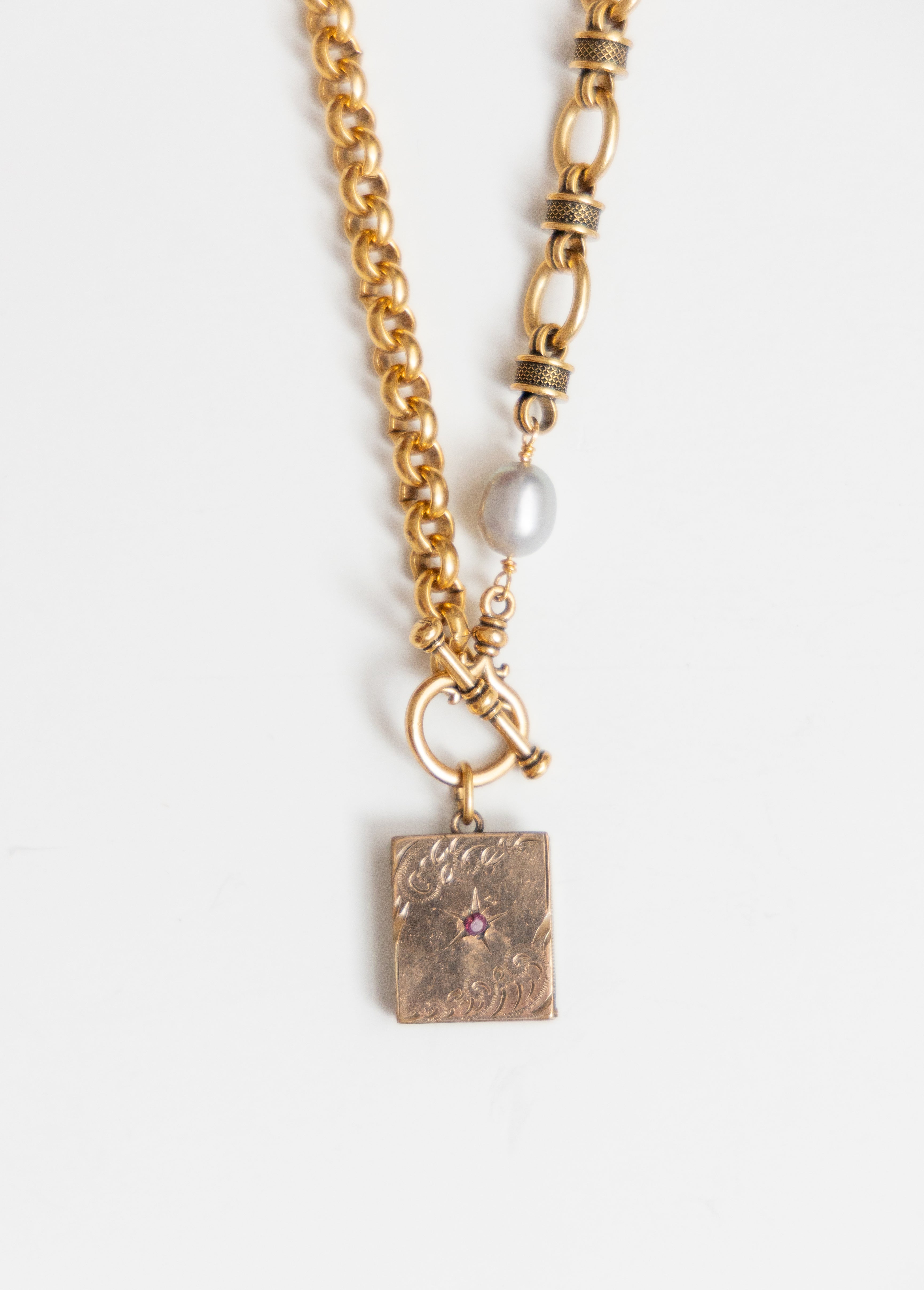 One of One #1387 :: 18" Vintage Chain Necklace with Grey Pearl and Garnet Book Locket