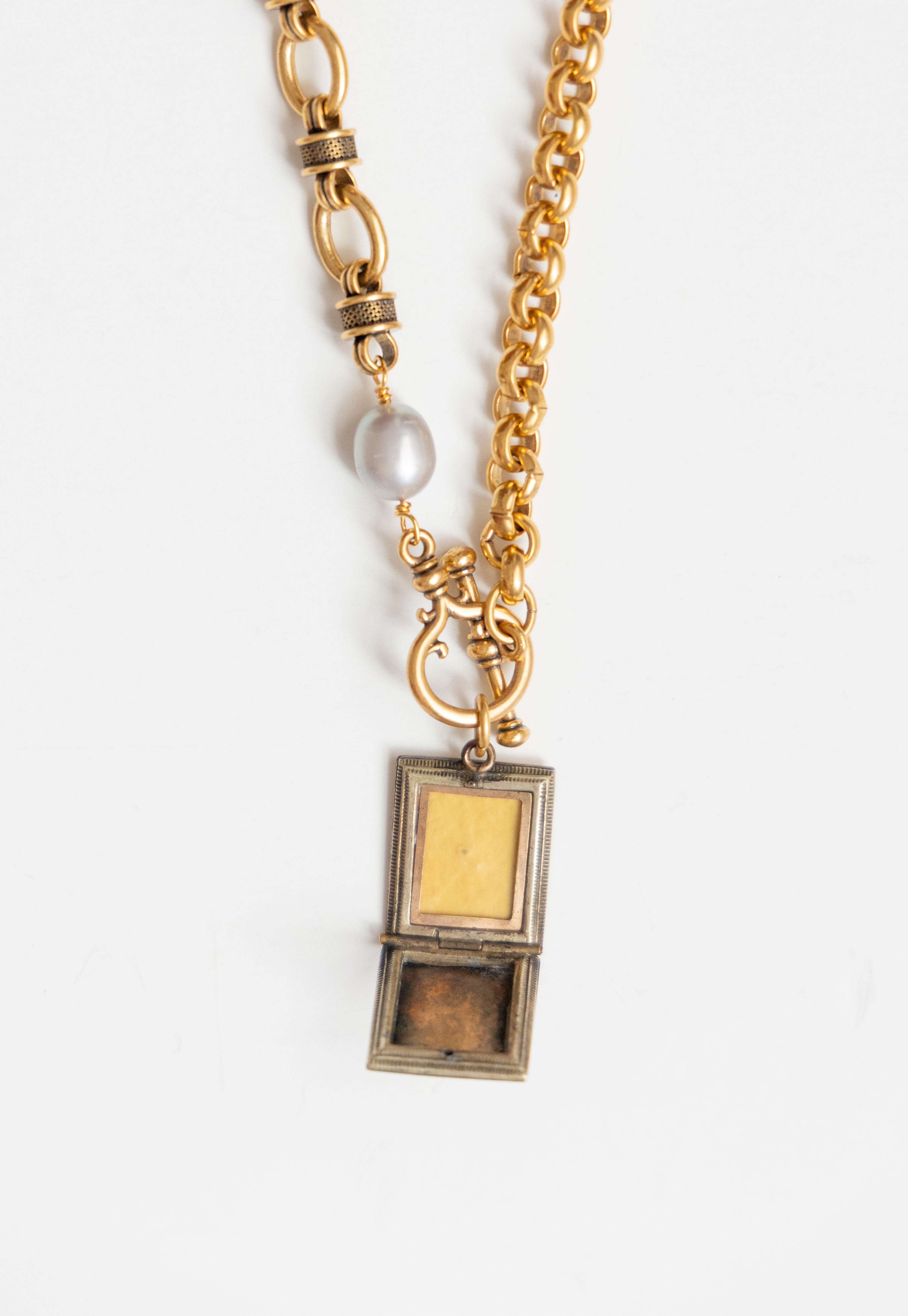 18" Vintage Chain Necklace featuring a book locket, grey pearl, and our exclusive ExVoto Vintage toggle closure at front. This necklace features a one of a kind, antique, gold filled locket that is 100 years old or more.