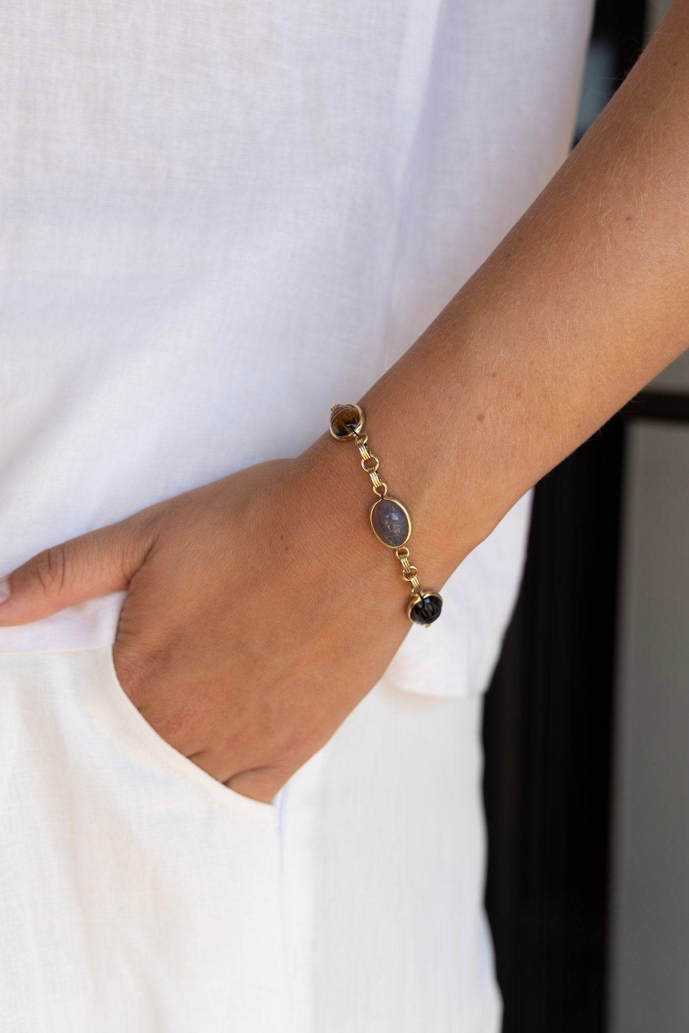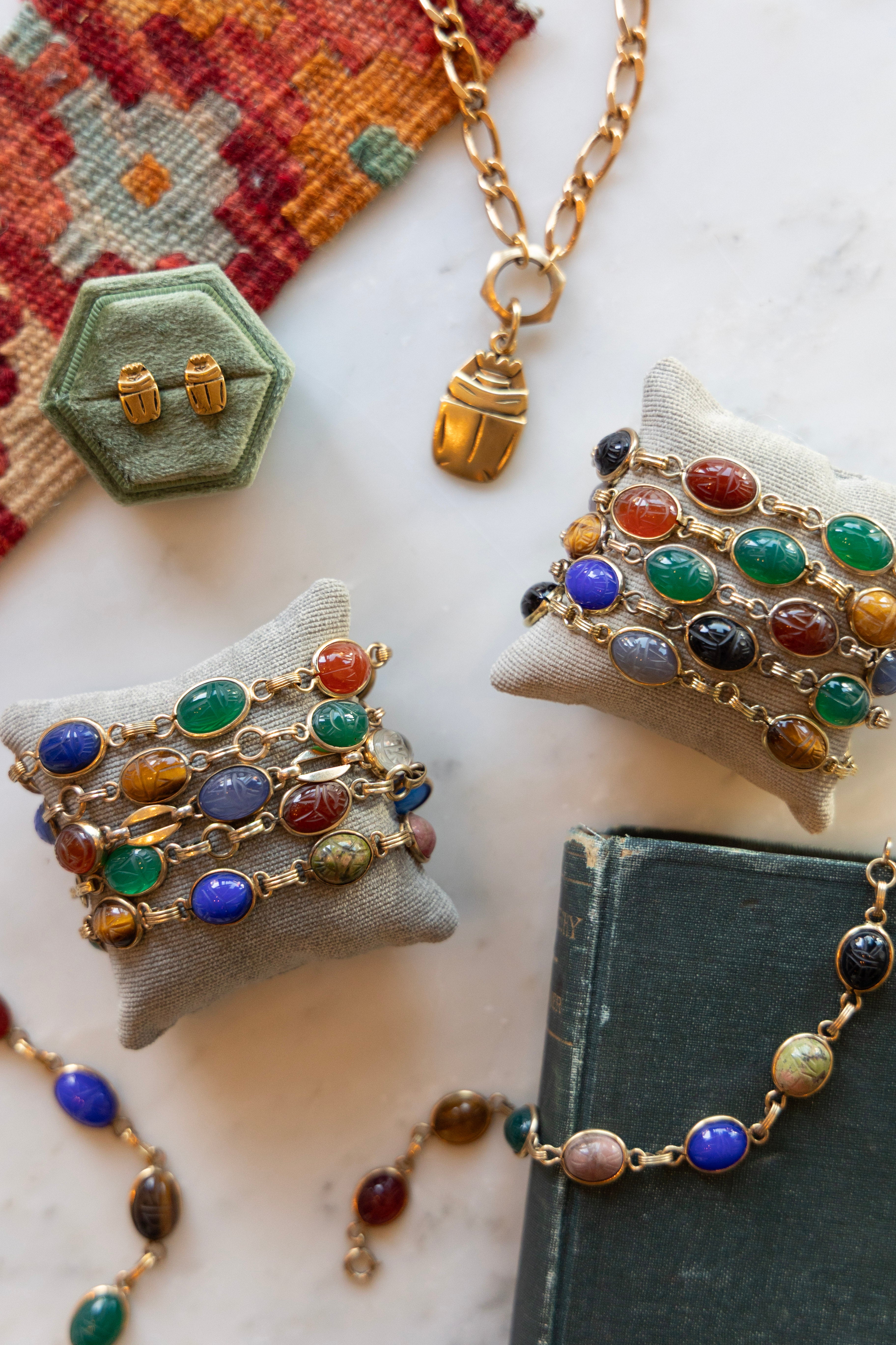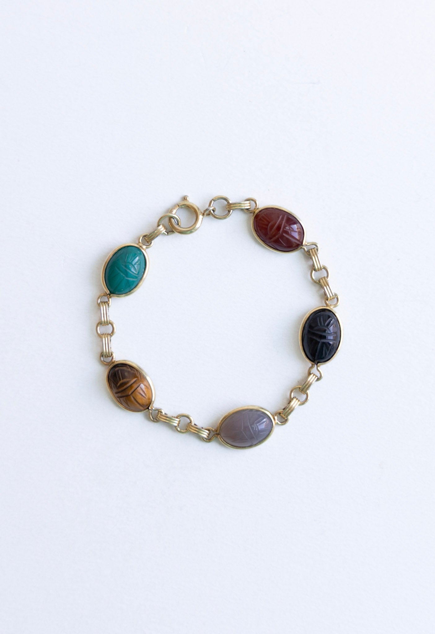 This 1950s vintage gold-filled bracelet features natural semi-precious stones shaped like scarabs and secures with a lobster clasp. Each piece is unique, making every bracelet in this limited series truly one-of-a-kind.