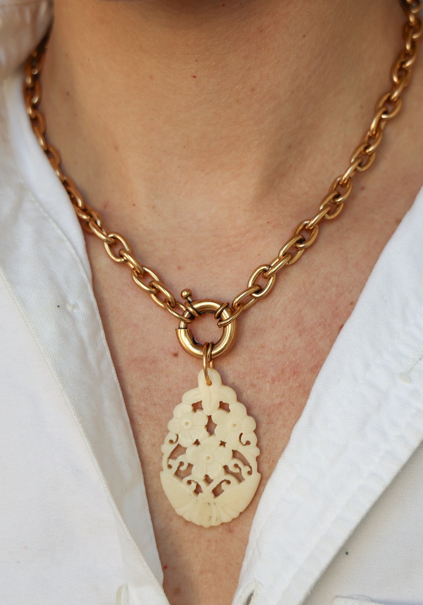 This vintage carved bone lace charm measures 1 7/8" tall and 1 1/4" wide.