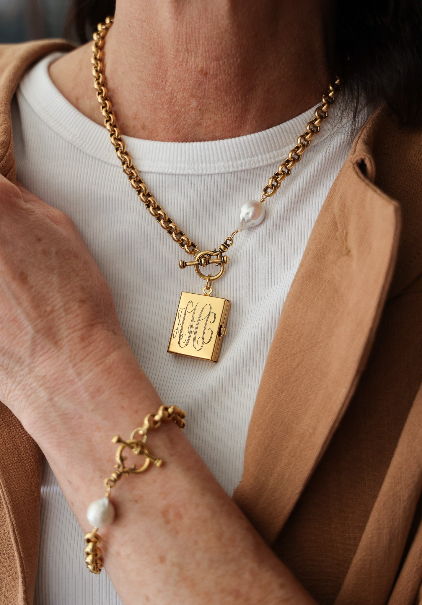 • 18" necklace featuring plated 18k gold chain with forever finish, a freshwater baroque pearl, and a book locket pendant.