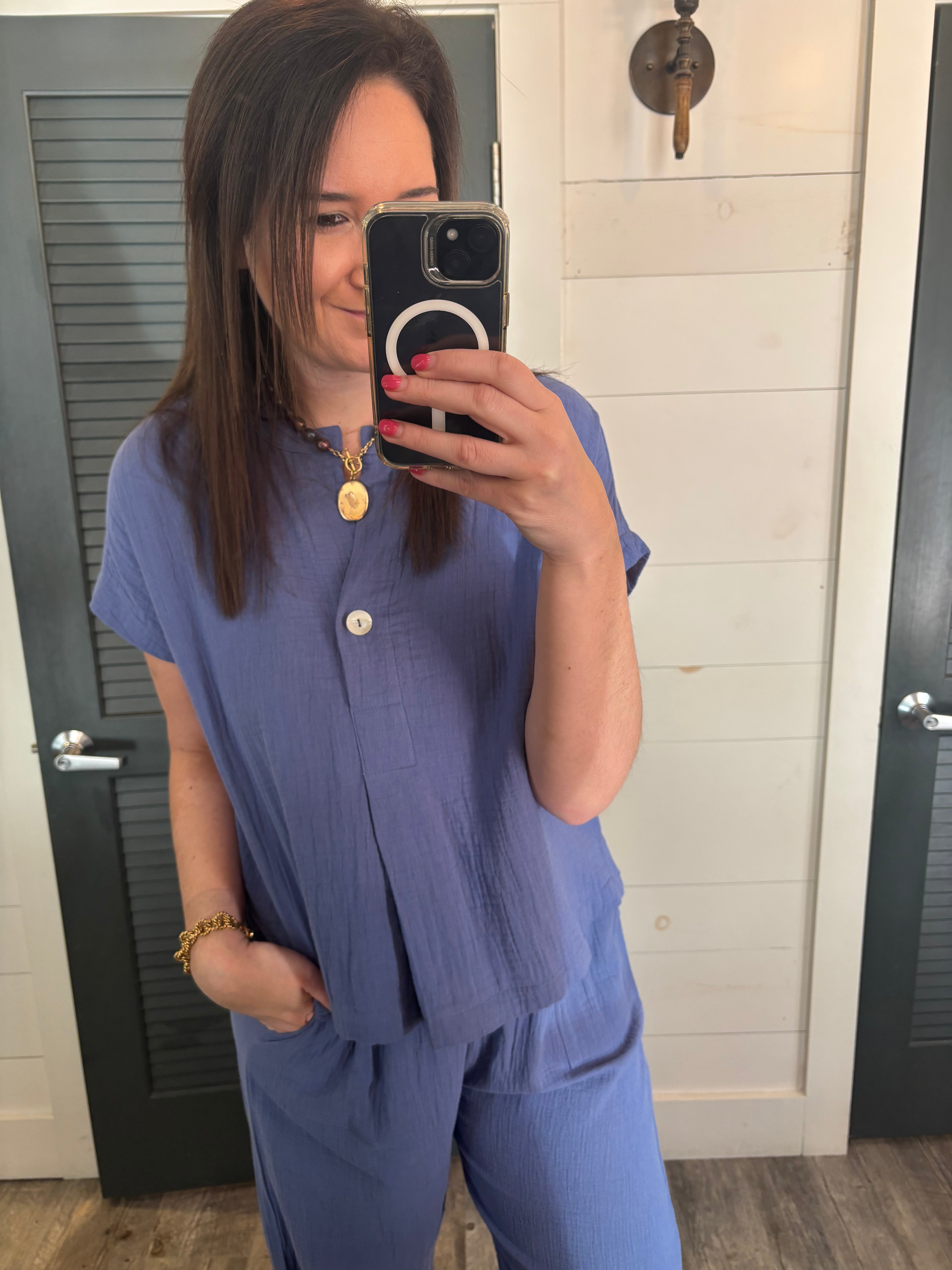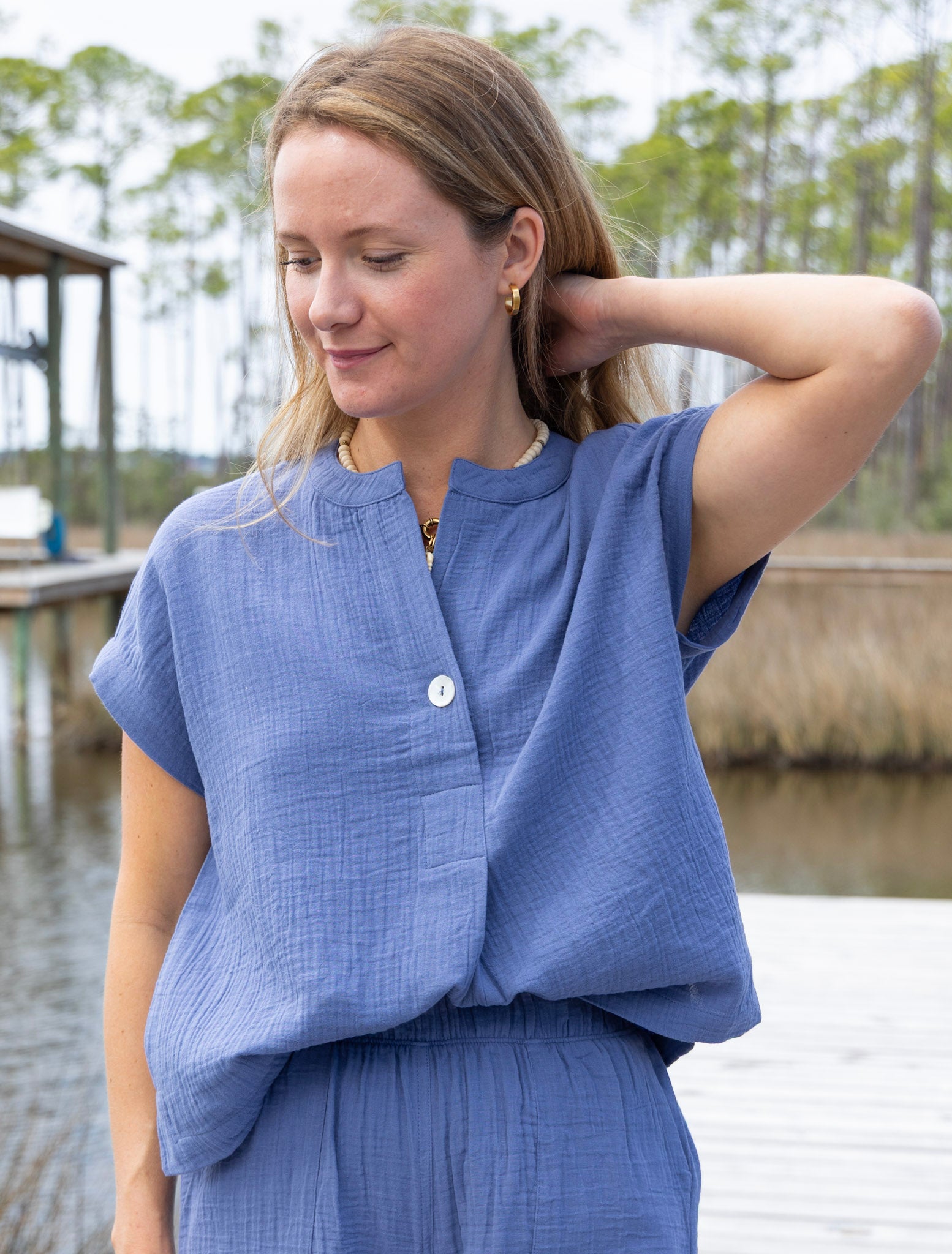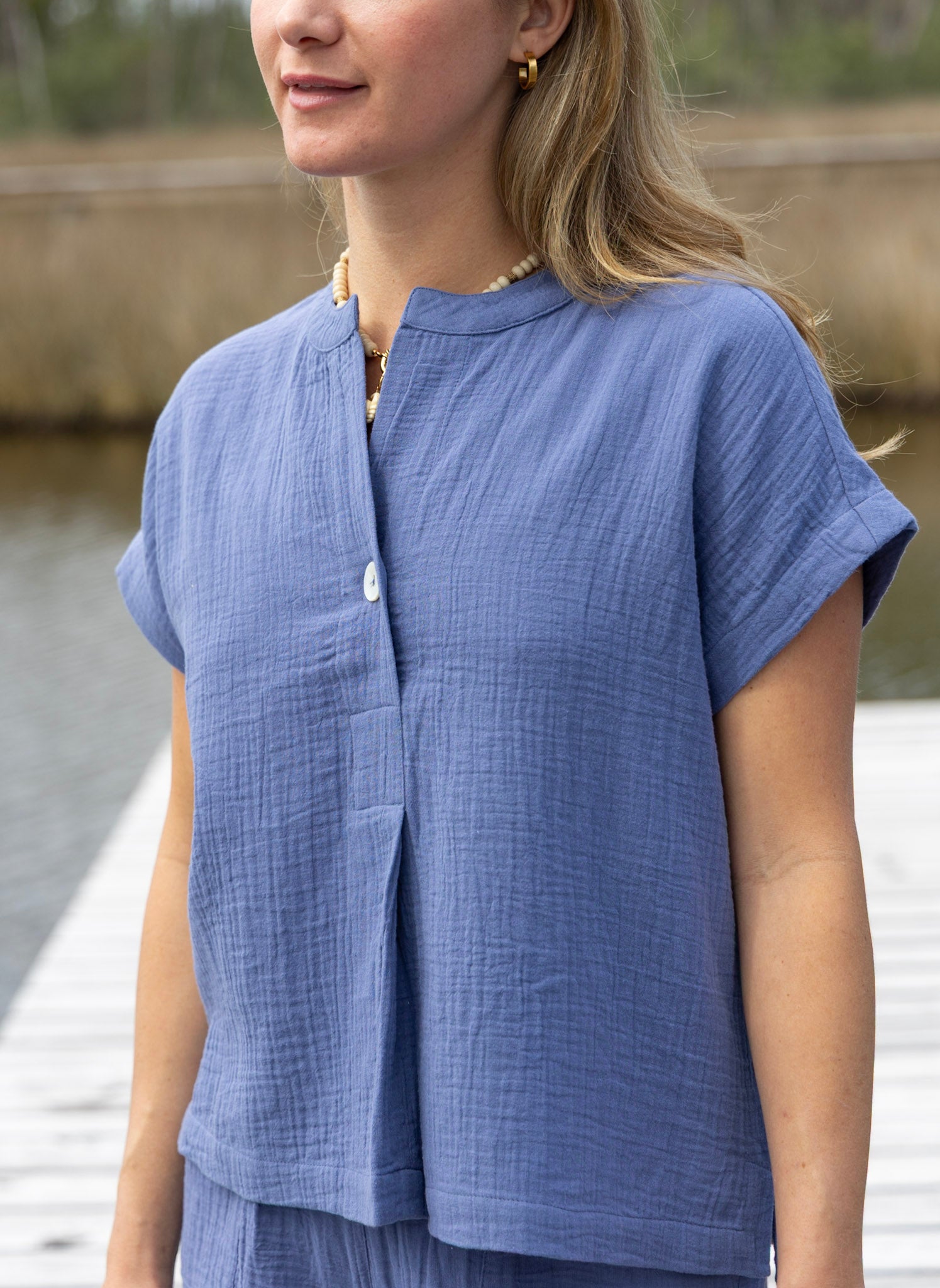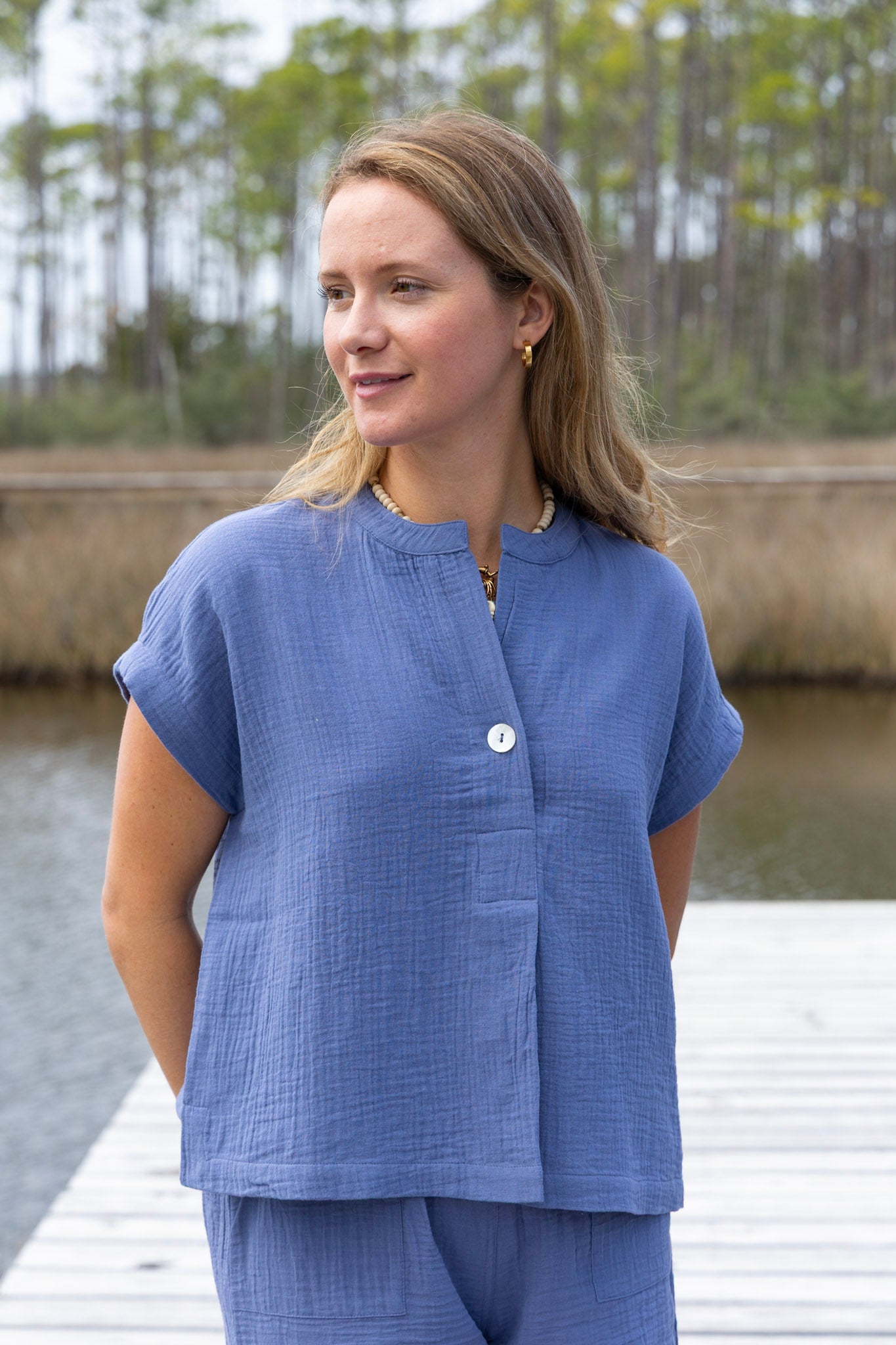 STYLE TIP: The Anna Blouse is the perfect Spring and Summer top, made from a soft cotton gauze, making it breathable and perfect for the warmer temps. The top features a flattering neckline with shell button detail.