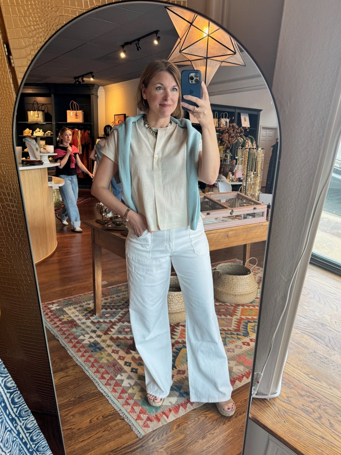 STYLE TIP: The Anna Blouse is the perfect Spring and Summer top, made from a blend of cotton and linen, making it breathable and perfect for the warmer temps. The top features a flattering neckline with shell button detail.