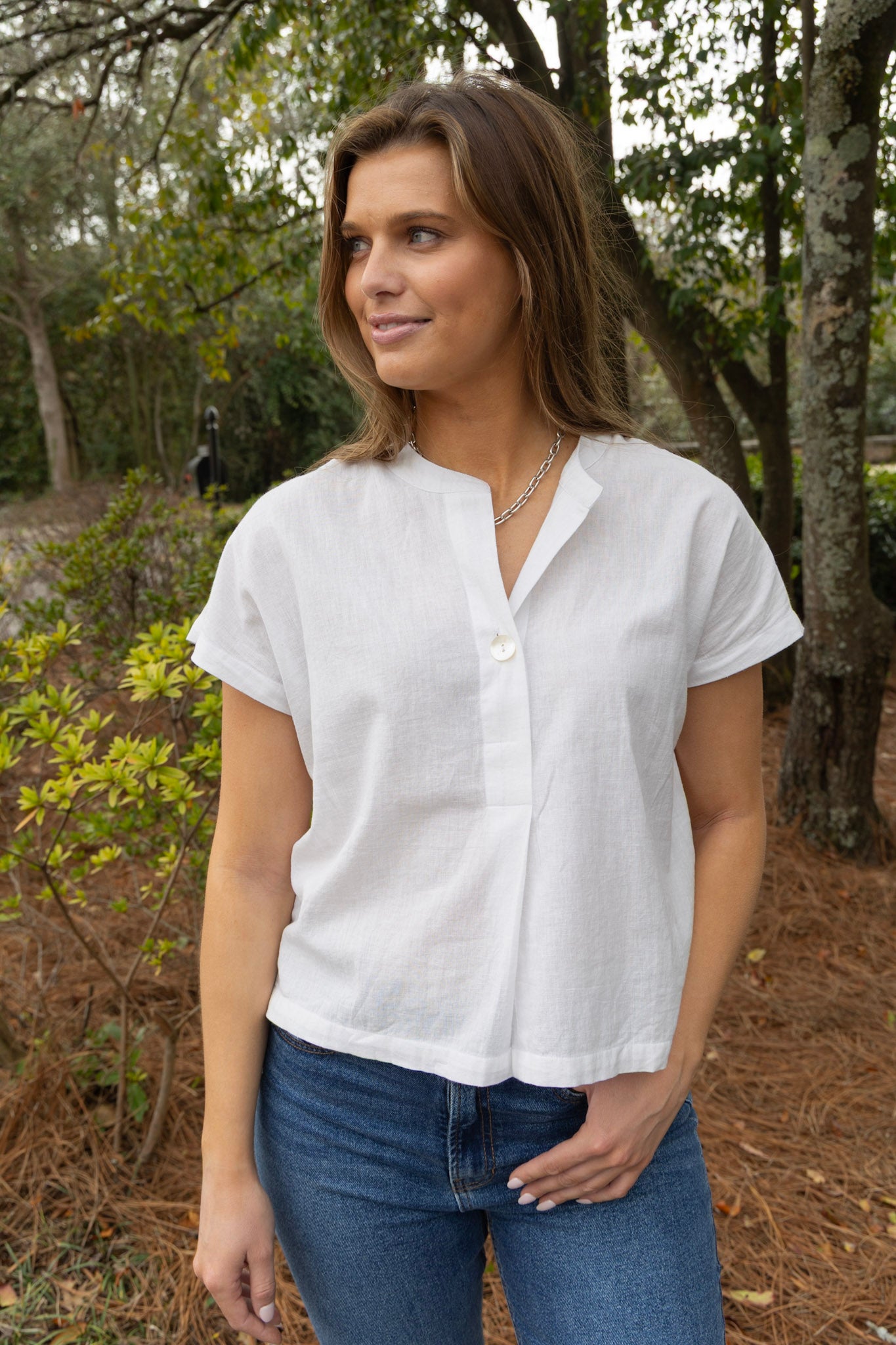 STYLE TIP: The Anna Blouse is the perfect Spring and Summer top, made from a blend of cotton and linen, making it breathable and perfect for the warmer temps. The top features a flattering neckline with shell button detail.