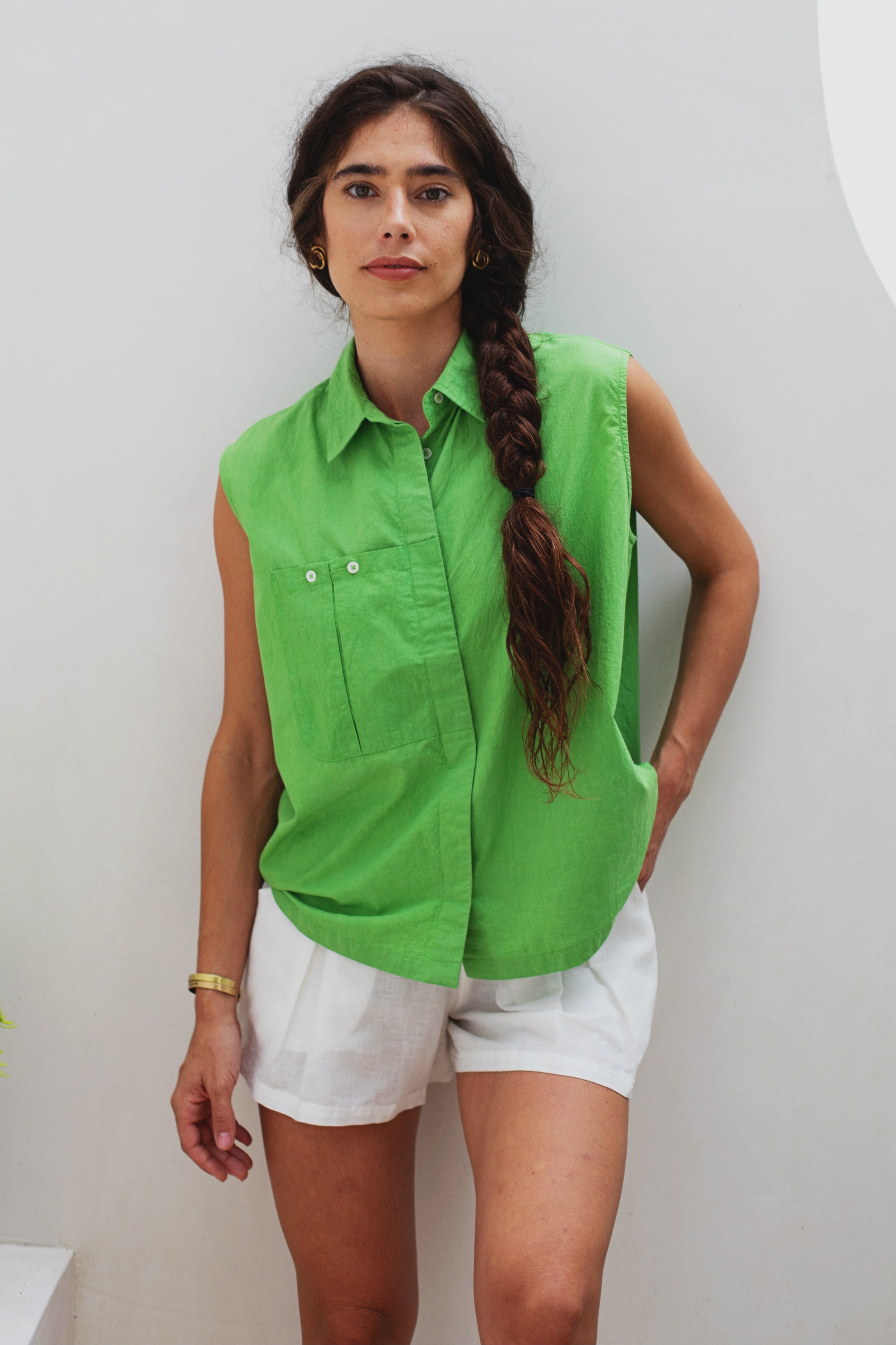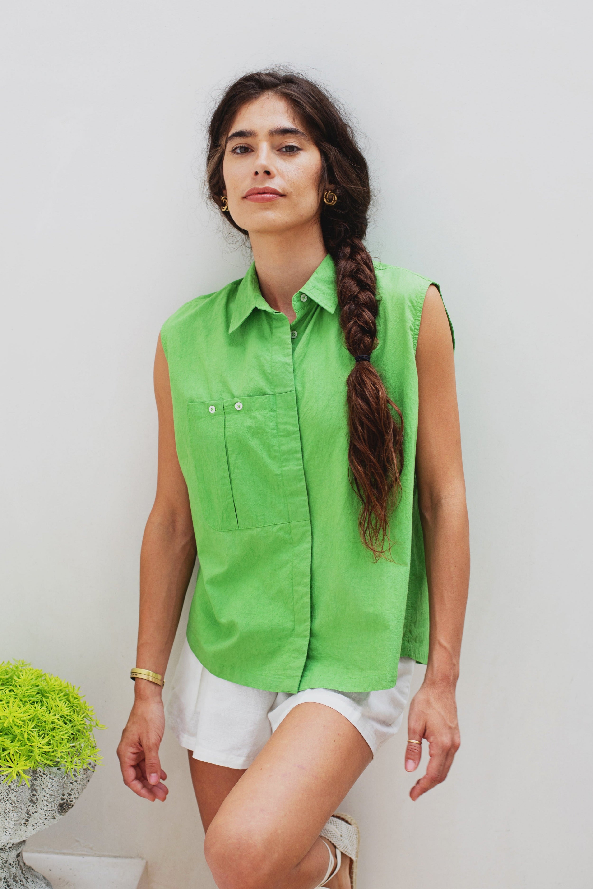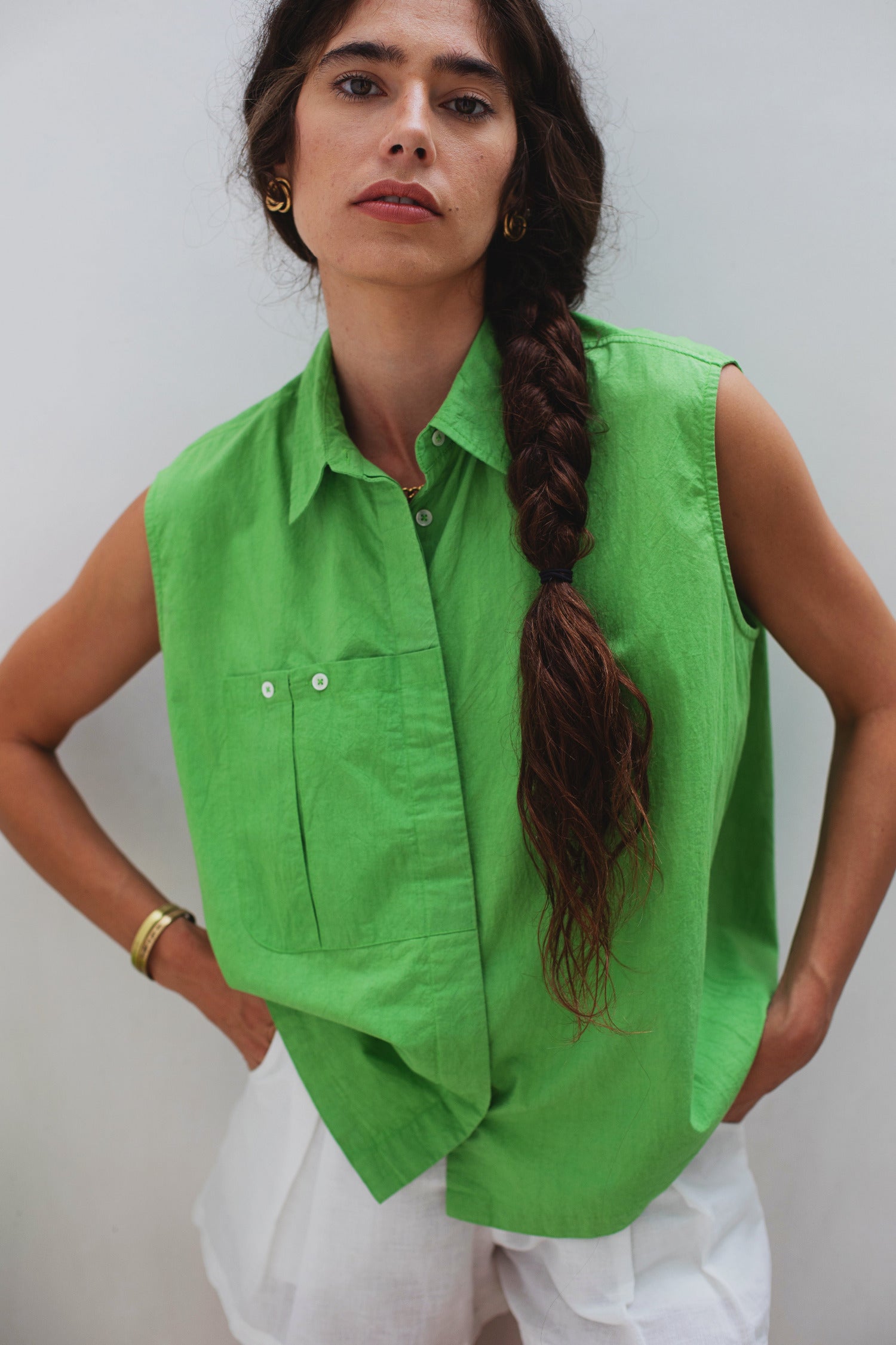 STYLE TIP: Crafted from a crisp, classic cotton fabric, this sleeveless top features a button-up collared design and a playful button pocket detail. The vibrant meadow green hue adds a fun pop of color to your Spring and Summer wardrobe.