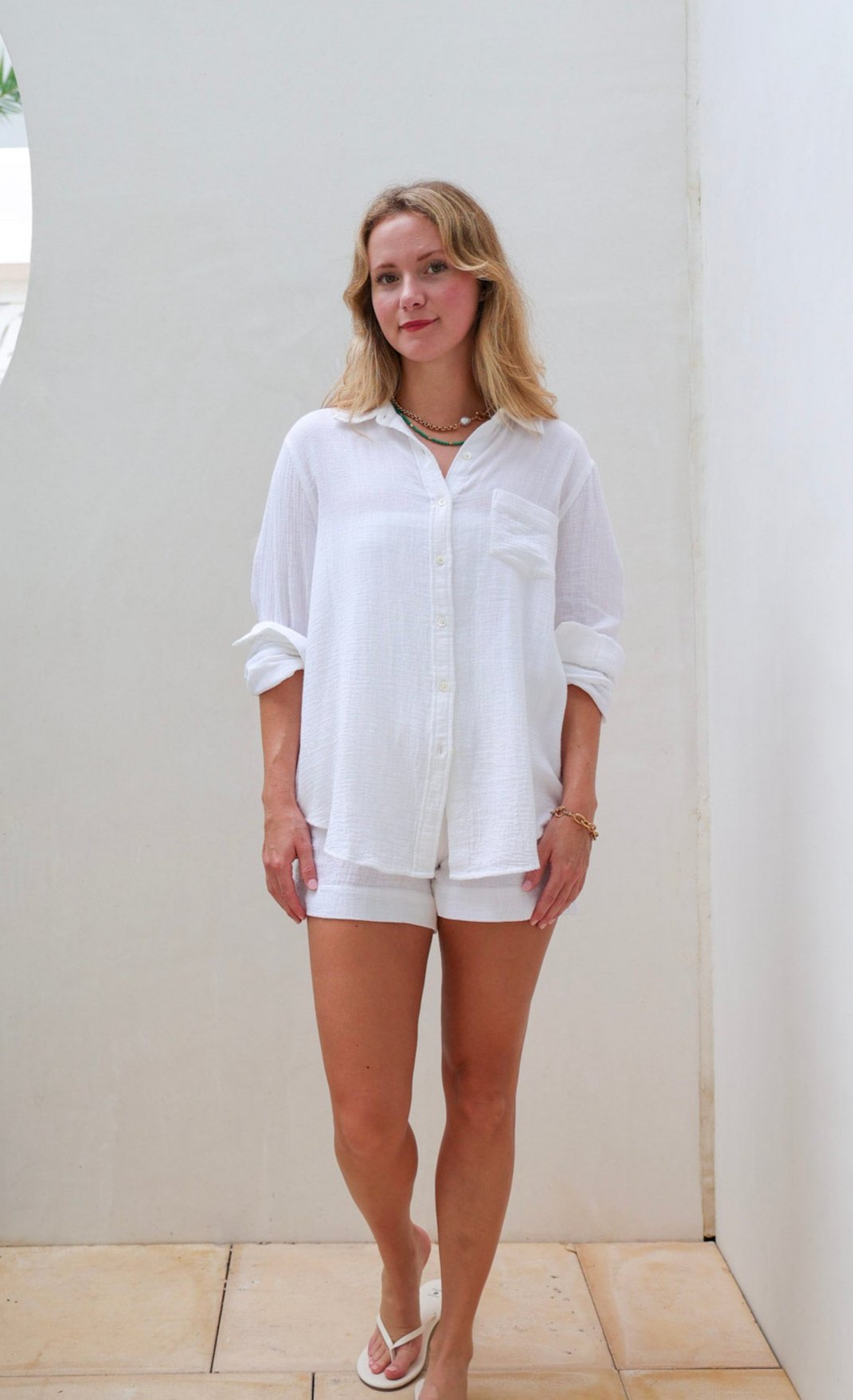 Complete the look: Rosie Short in White + Green Beaded Necklace