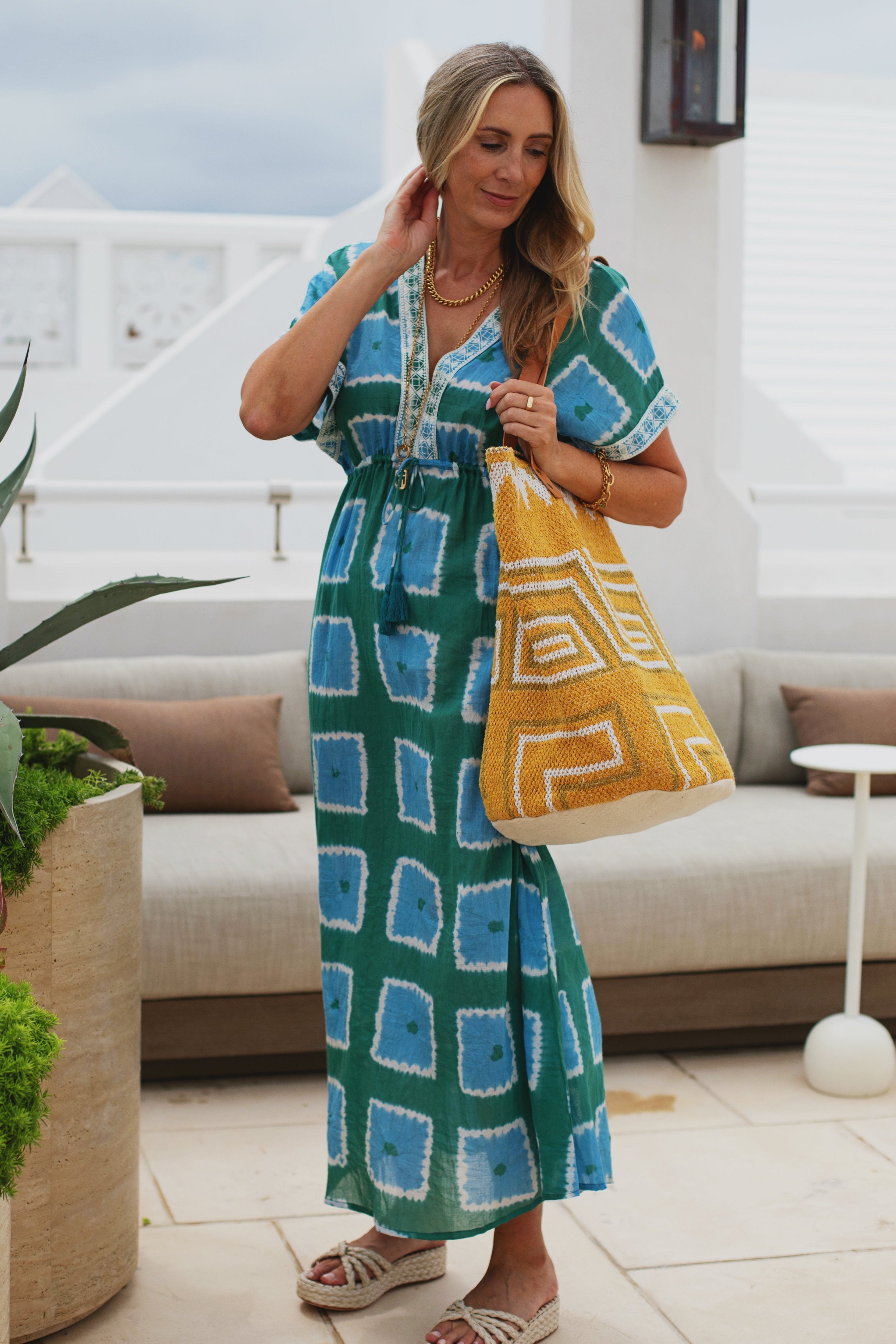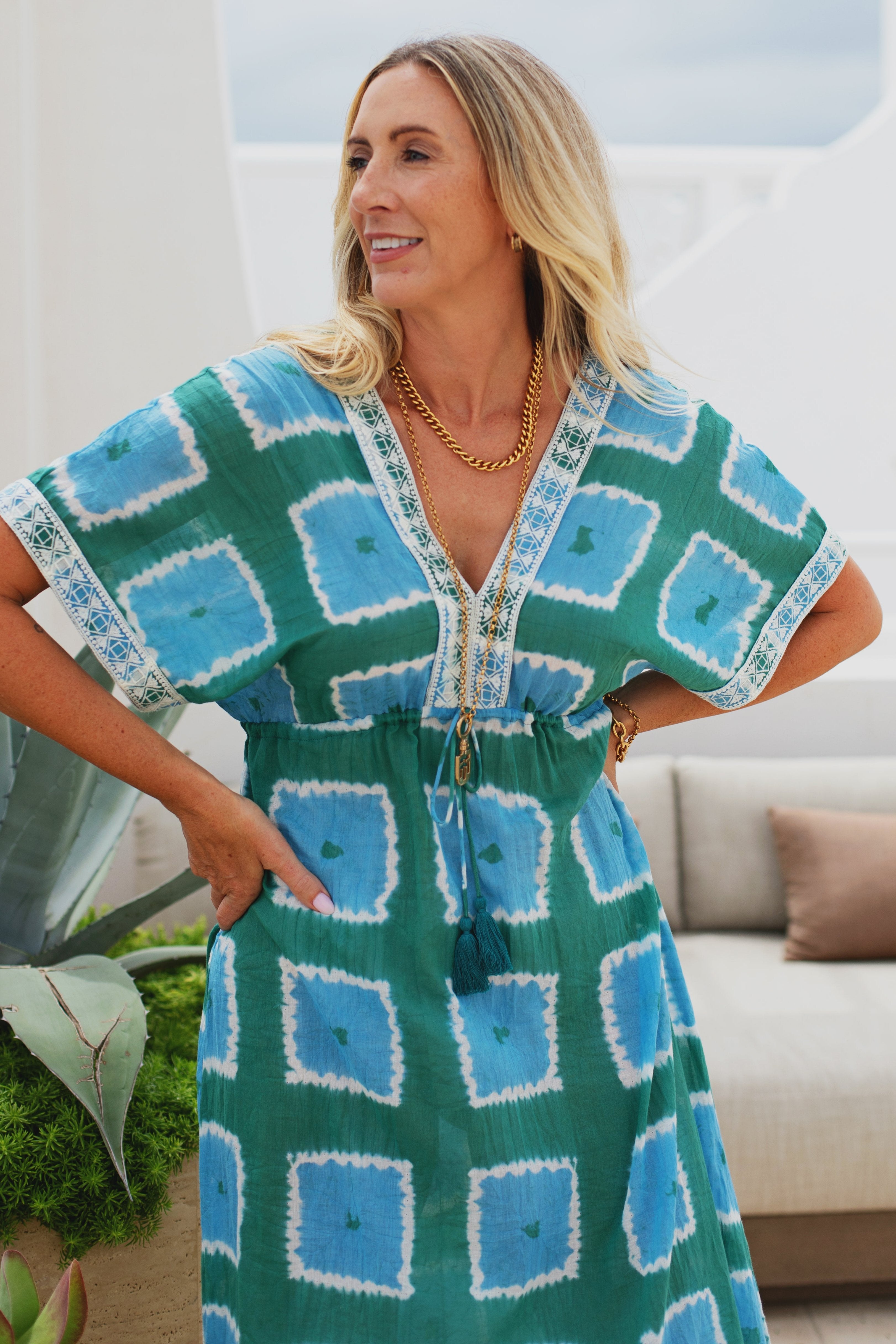 RESORT WEAR :: Kate Maxi Caftan with Embroidery in Blue/Green Tie Dye by ExVoto