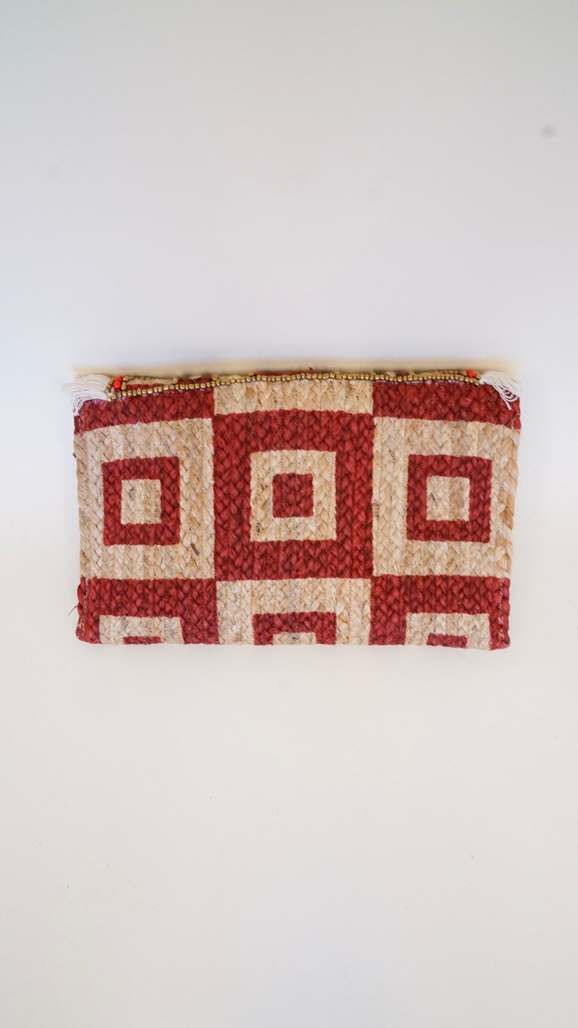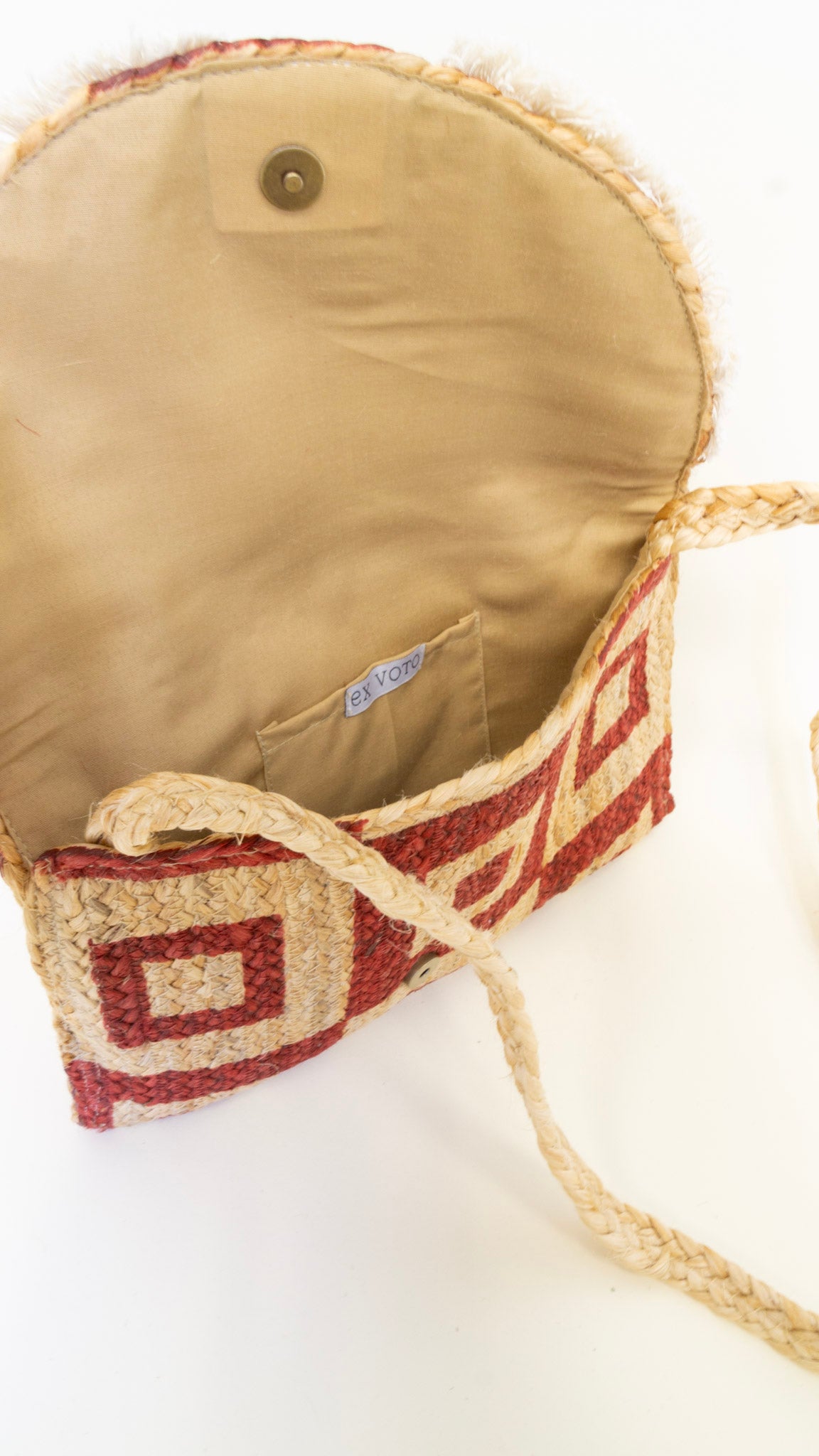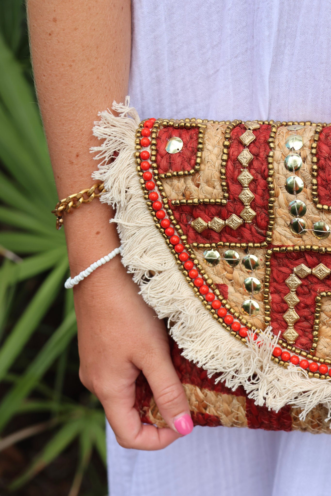 STYLE TIP: This clutch has an elegant blend of soft structure and bohemian vibe. The front flap is embellished with brass, adding an interesting statement piece to any outfit. This versatile bag can be converted from a clutch to a crossbody thanks to its braided jute strap. It is large enough to carry all your essentials and comes in natural jute and jute red colors with matte gold metal embellishments.