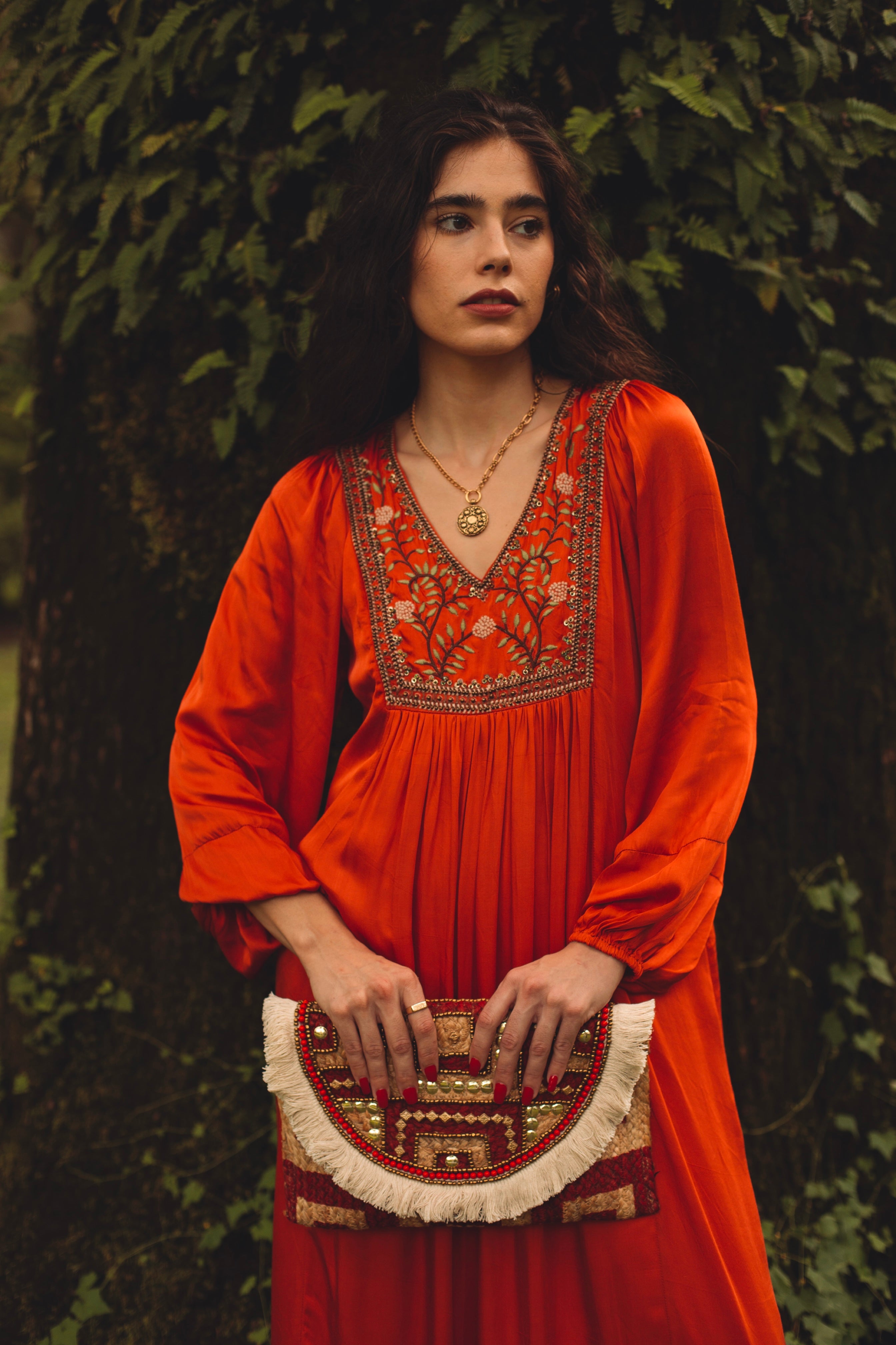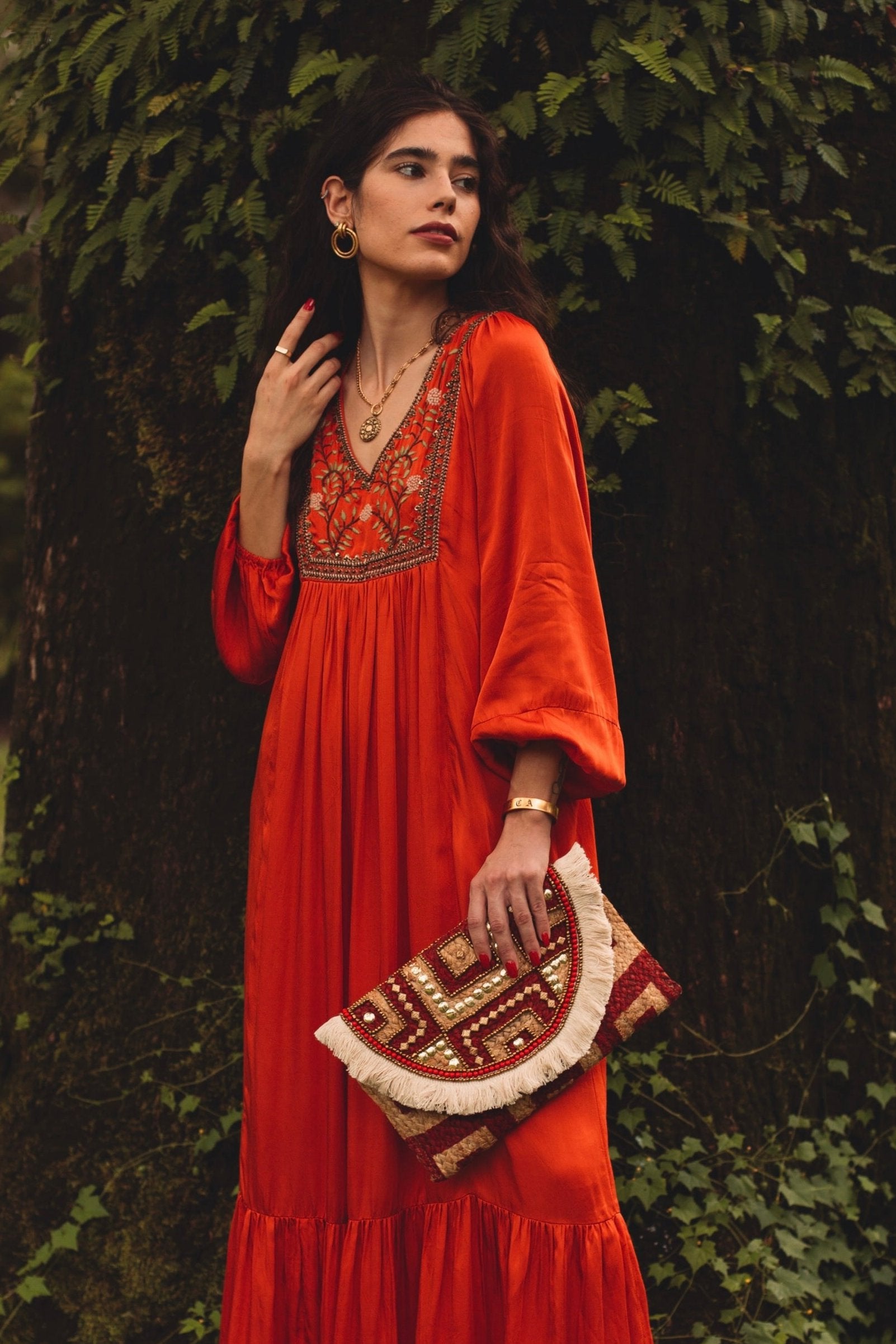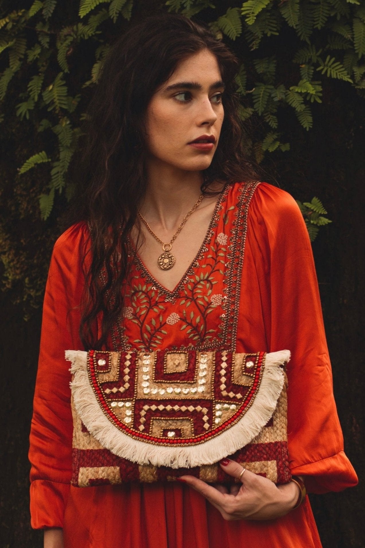 STYLE TIP: This clutch has an elegant blend of soft structure and bohemian vibe. The front flap is embellished with brass, adding an interesting statement piece to any outfit. This versatile bag can be converted from a clutch to a crossbody thanks to its braided jute strap. It is large enough to carry all your essentials and comes in natural jute and jute red colors with matte gold metal embellishments.