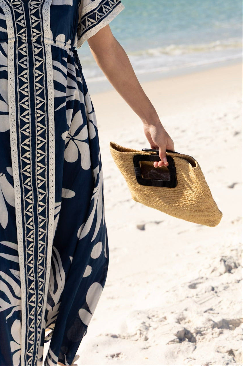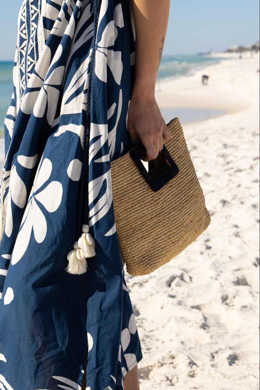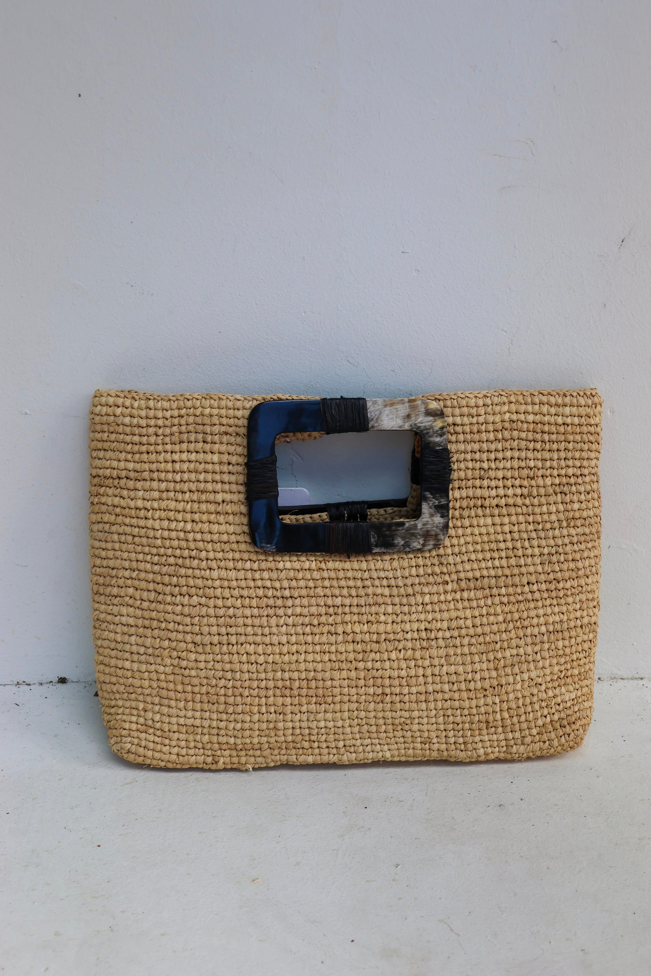 This handmade raffia bag is a perfect blend of fashion and function. Featuring a horn handle and open top design, this convenient piece is sure to become your new go-to accessory.