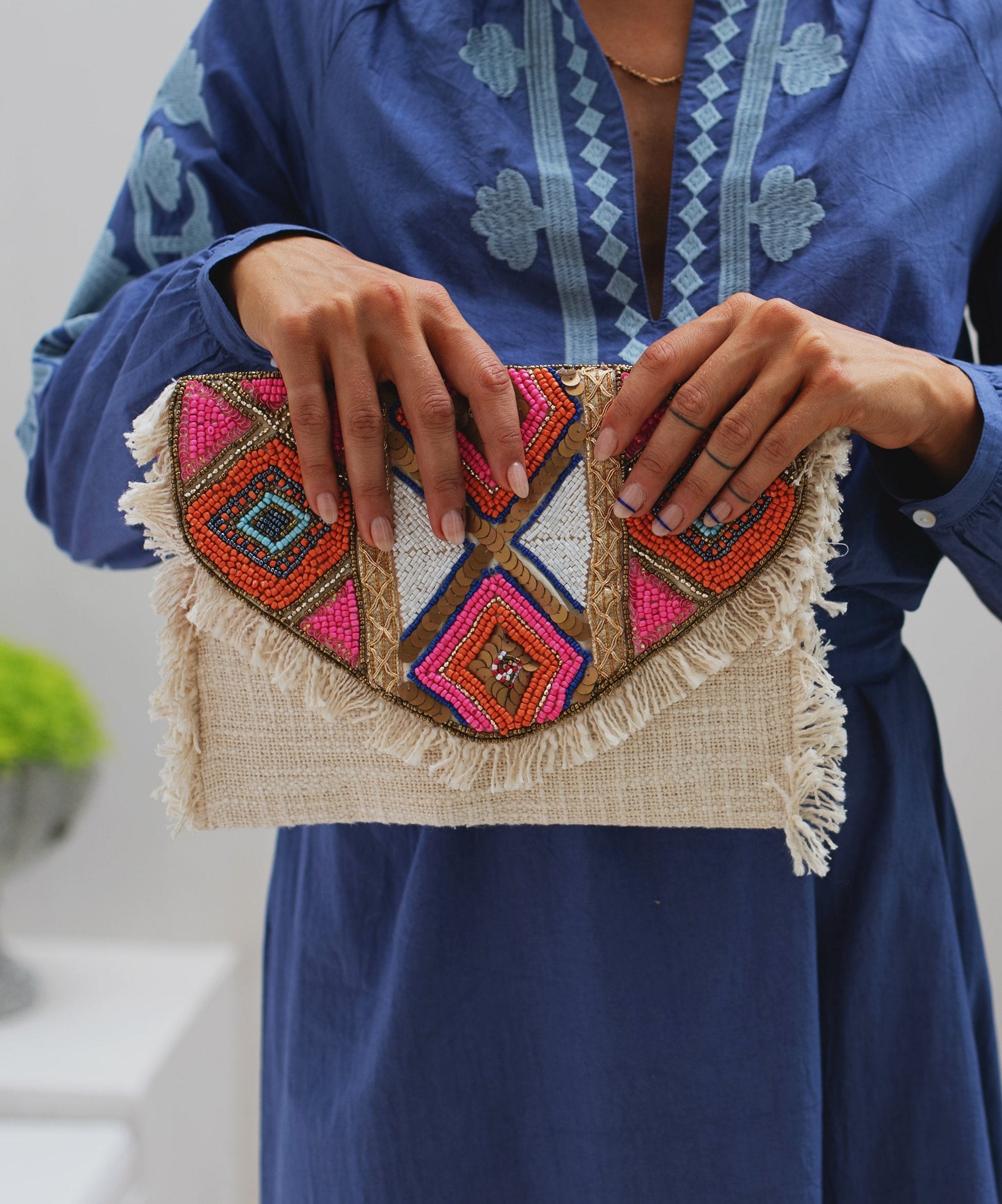 This hand-embellished fabric clutch is exploding with summer's energy in vibrant pink and orange hues. The bead work creates a beautiful mosaic, evoking the season's joy and warmth. The bag features a removable wristlet strap for added versatility.