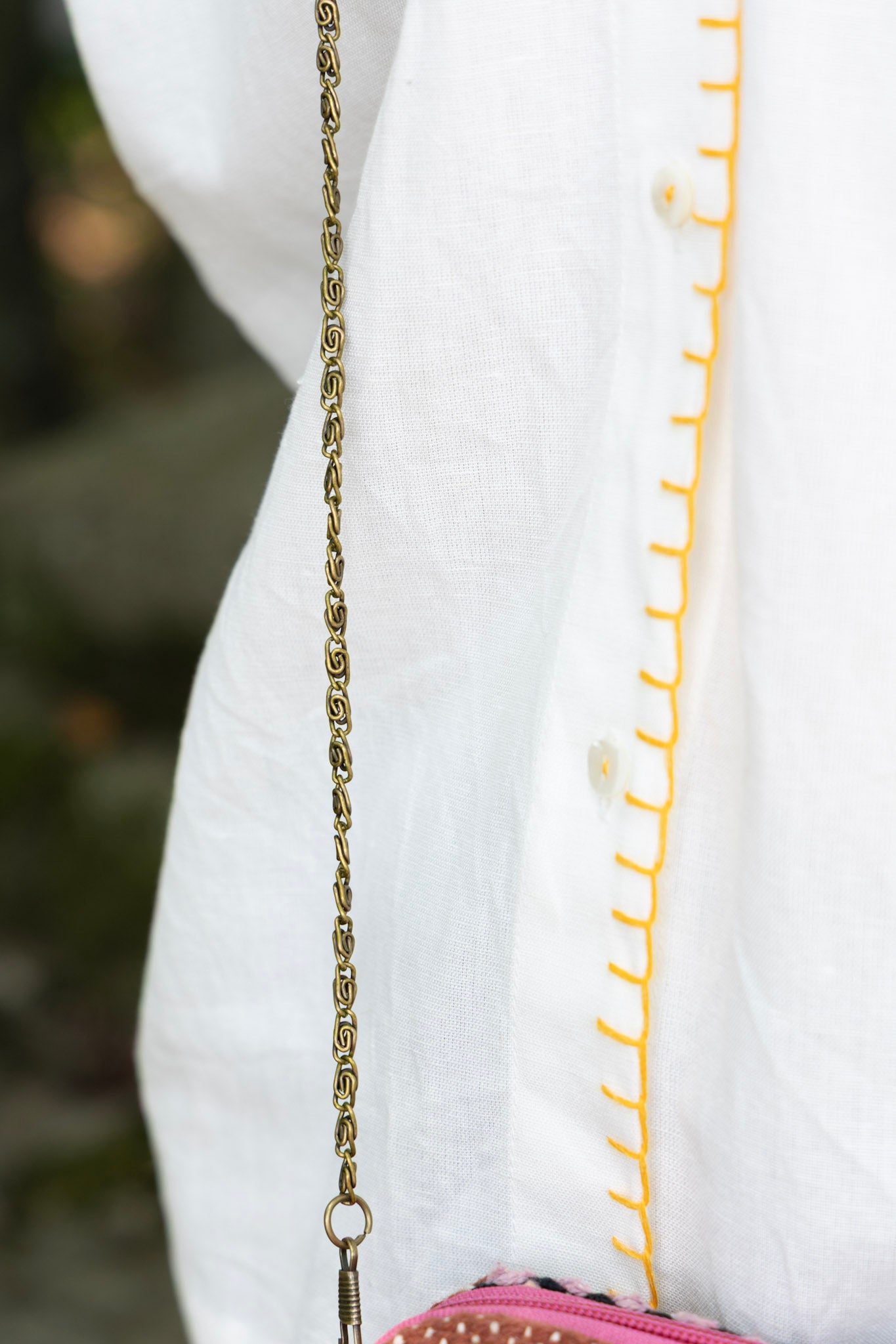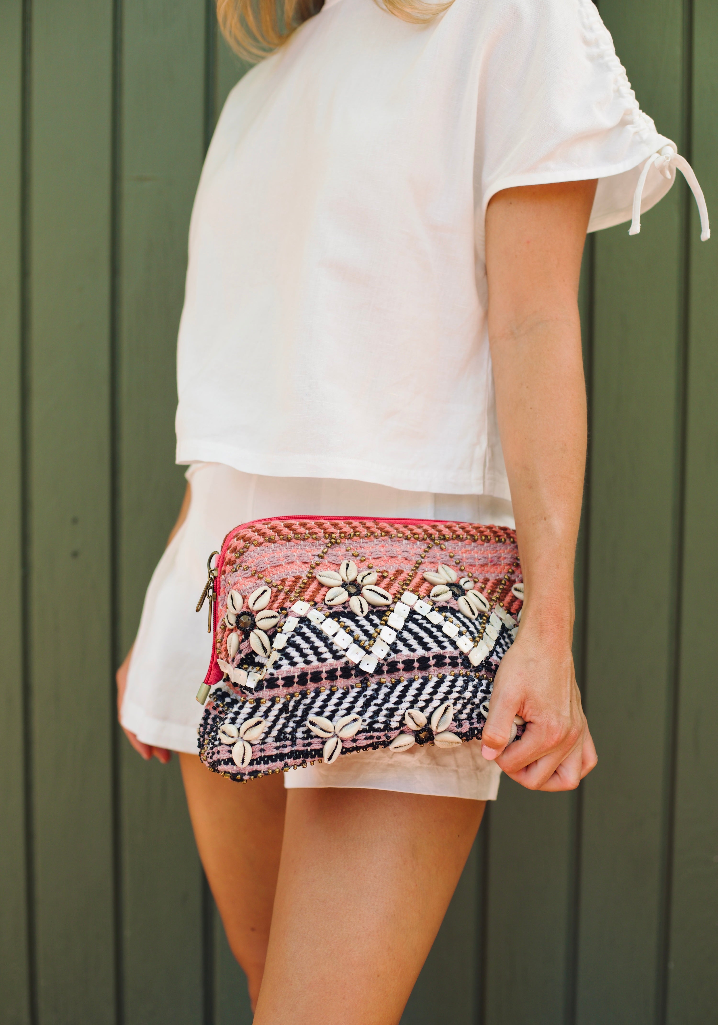 This playful bag combines beads and shells with a splash of pink for the ultimate beach vibe. Surprisingly spacious inside with a handy inner pocket to keep your essentials organized. The sturdy design stands upright on its own, while the detachable chain strap lets you switch between handheld and shoulder wear. Your perfect sunshine companion awaits!