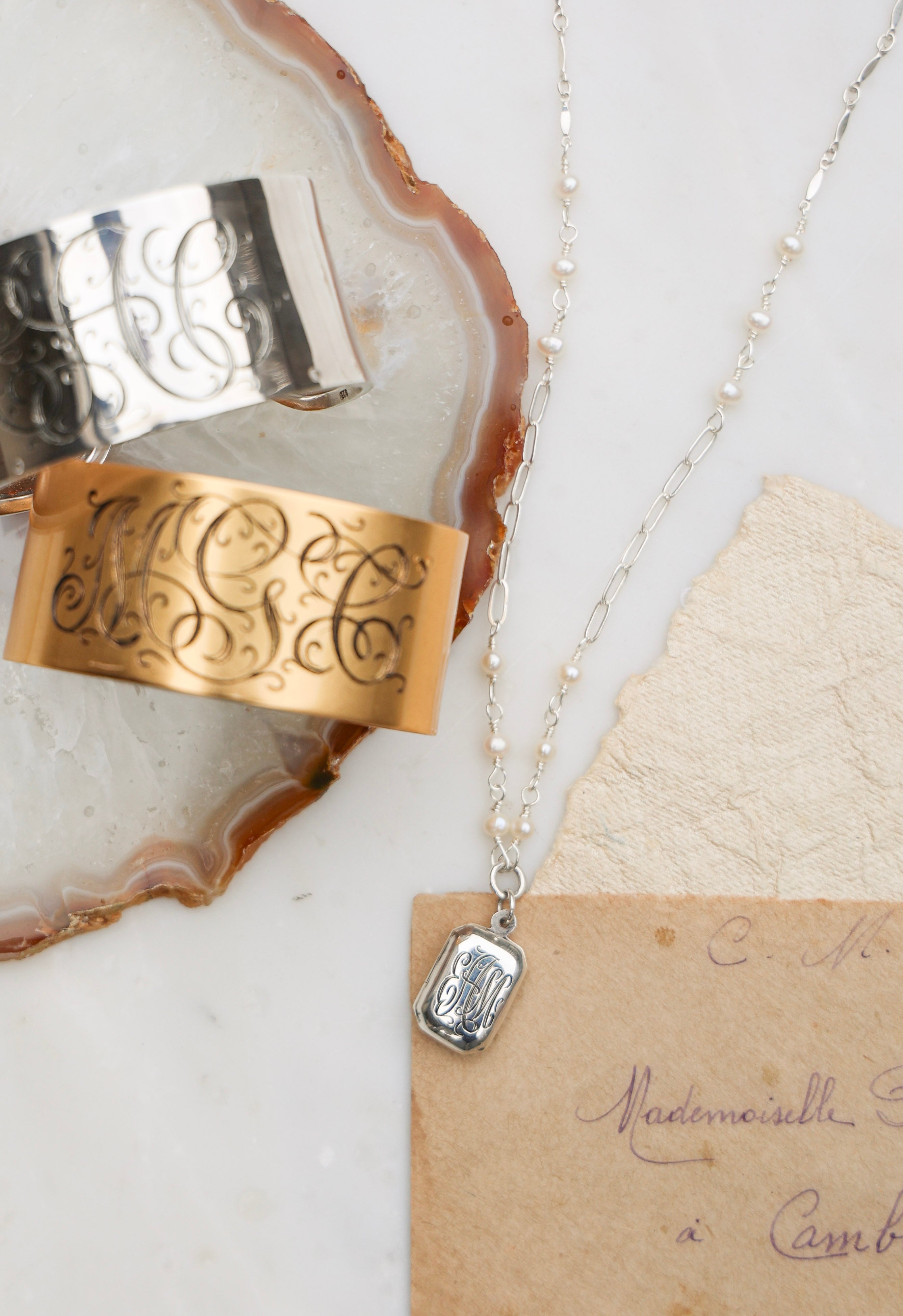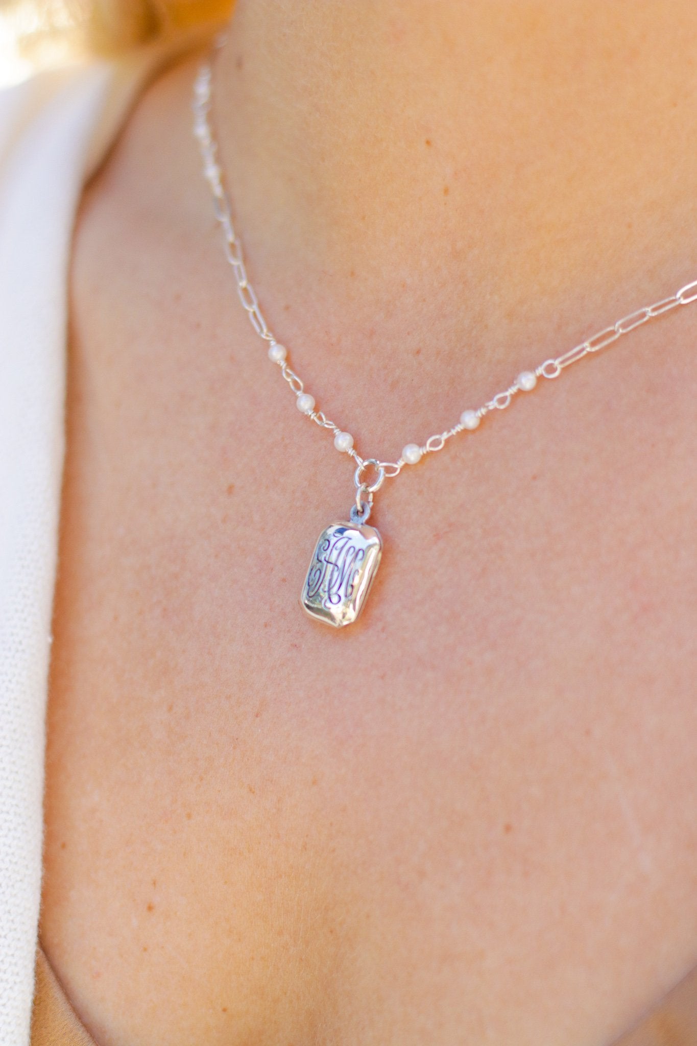 - This necklace features our sterling silver Ramsay locket, measuring .90 of an inch tall and .5 of an inch wide, with your monogram engraved in a script font.