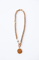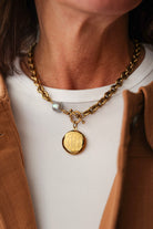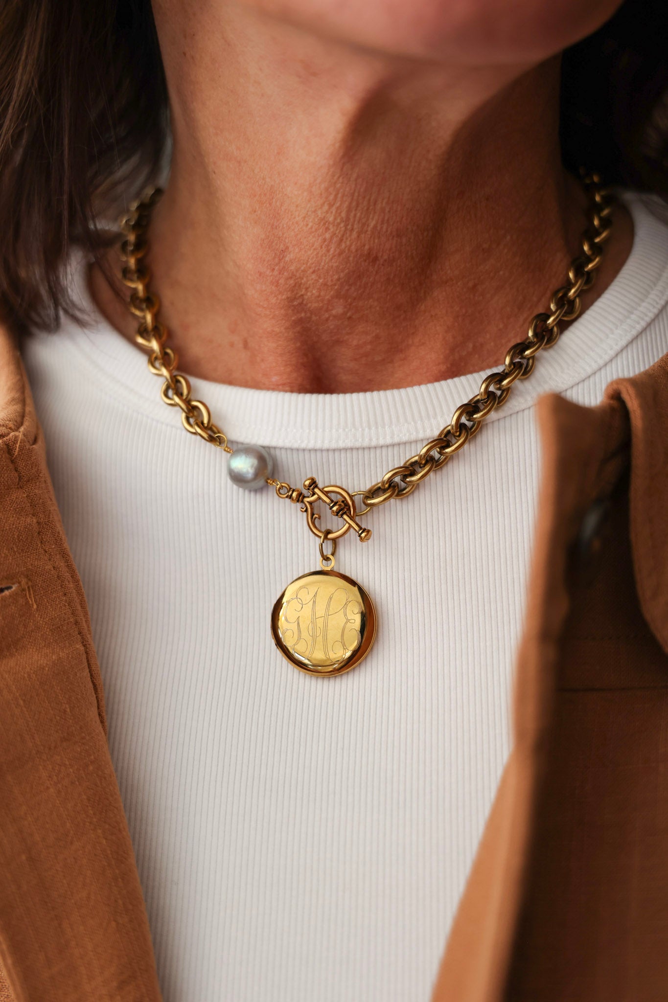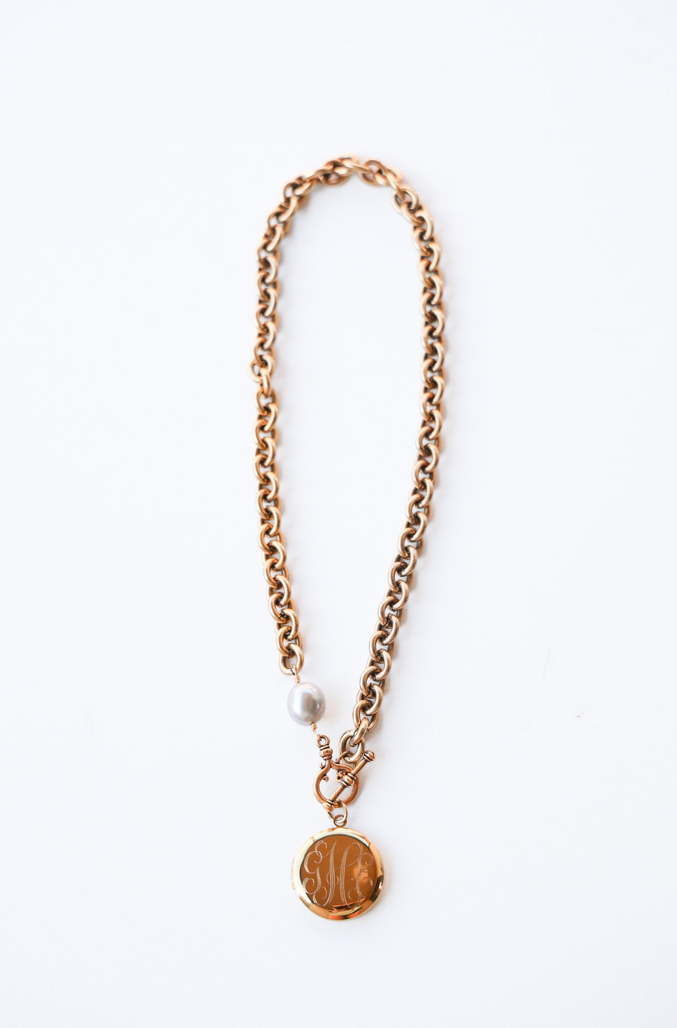 - 18" necklace featuring plated 18k gold chain with a grey freshwater pearl and our exclusive ExVoto Vintage toggle closure at front.