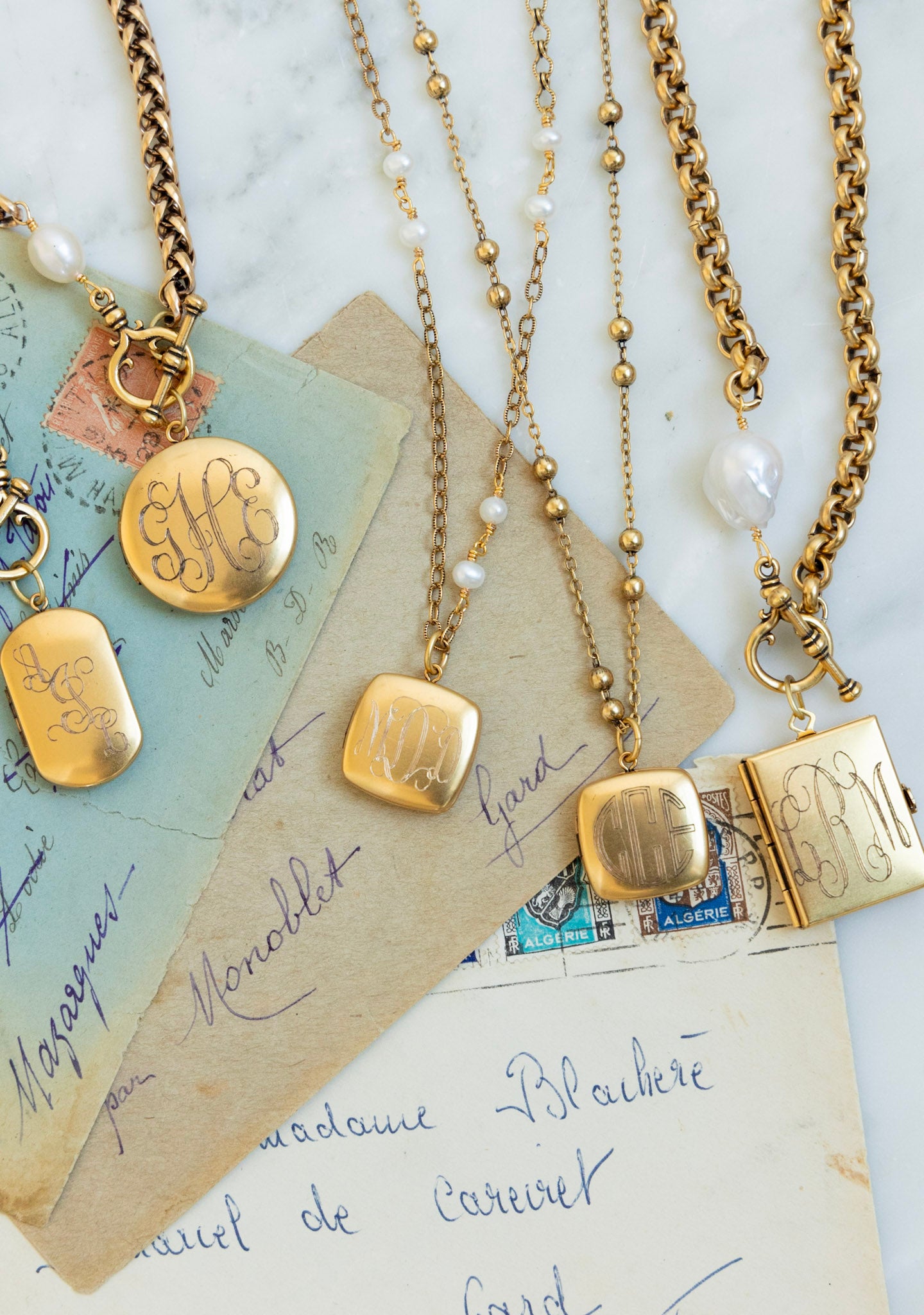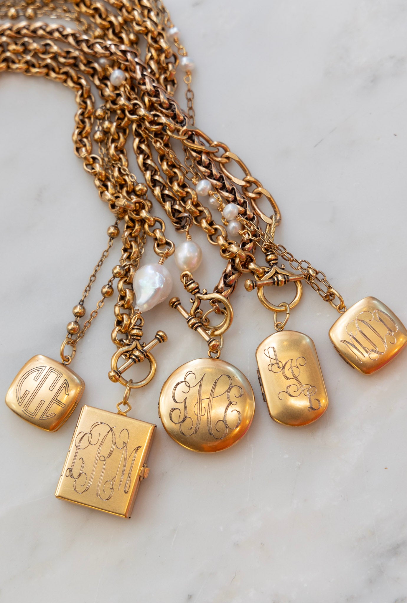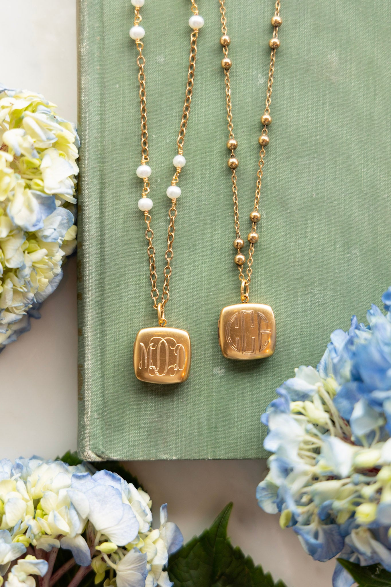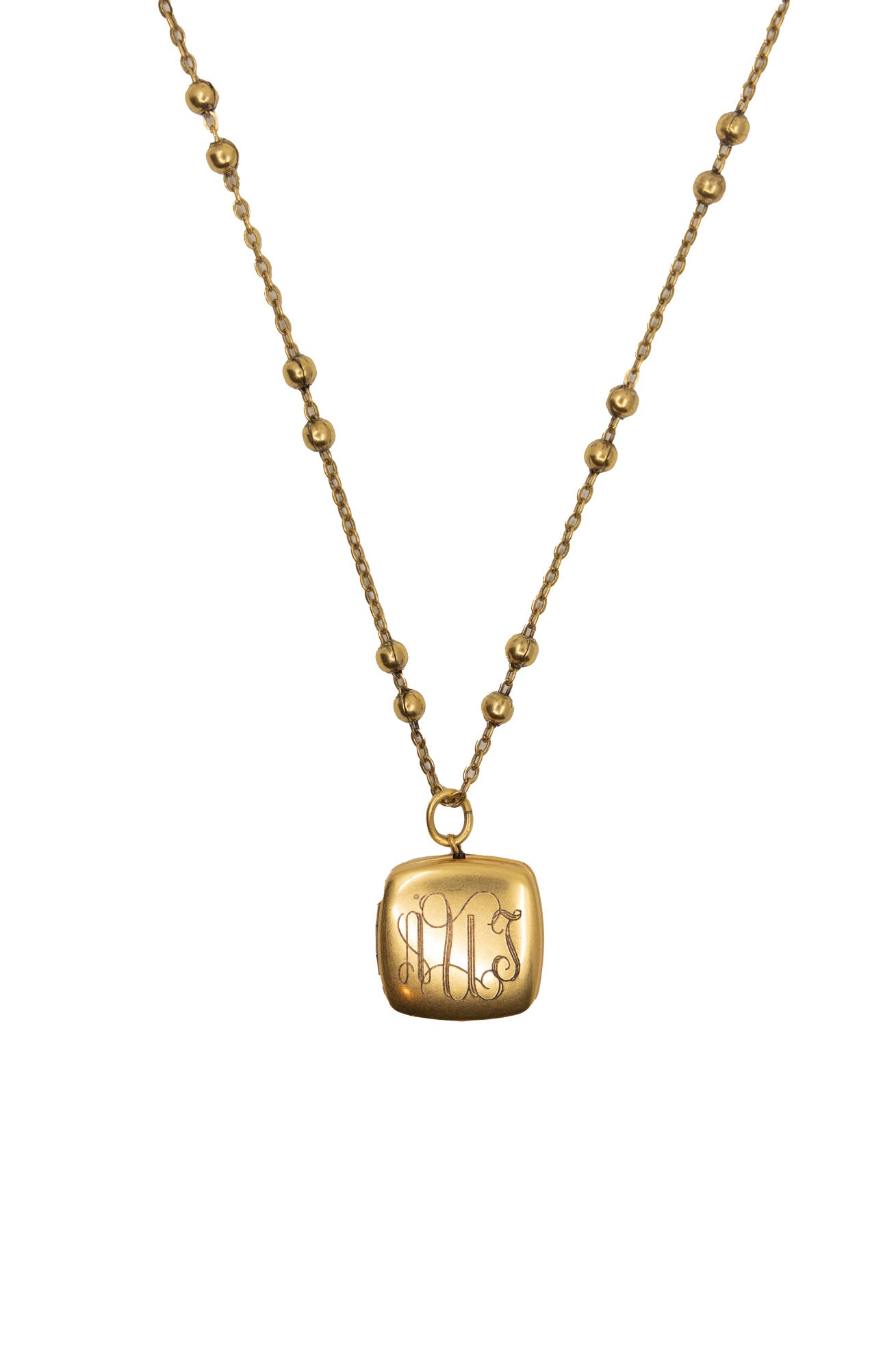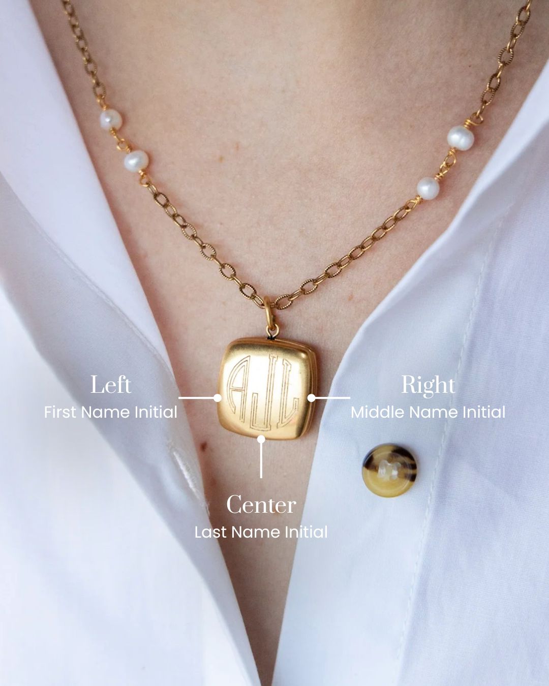 • 18" necklace featuring a gold chain with a protective matte finish and your choice of plain gold chain or with fresh water pearls and a square locket.