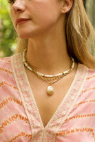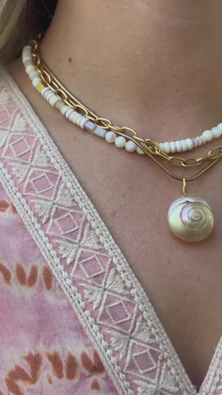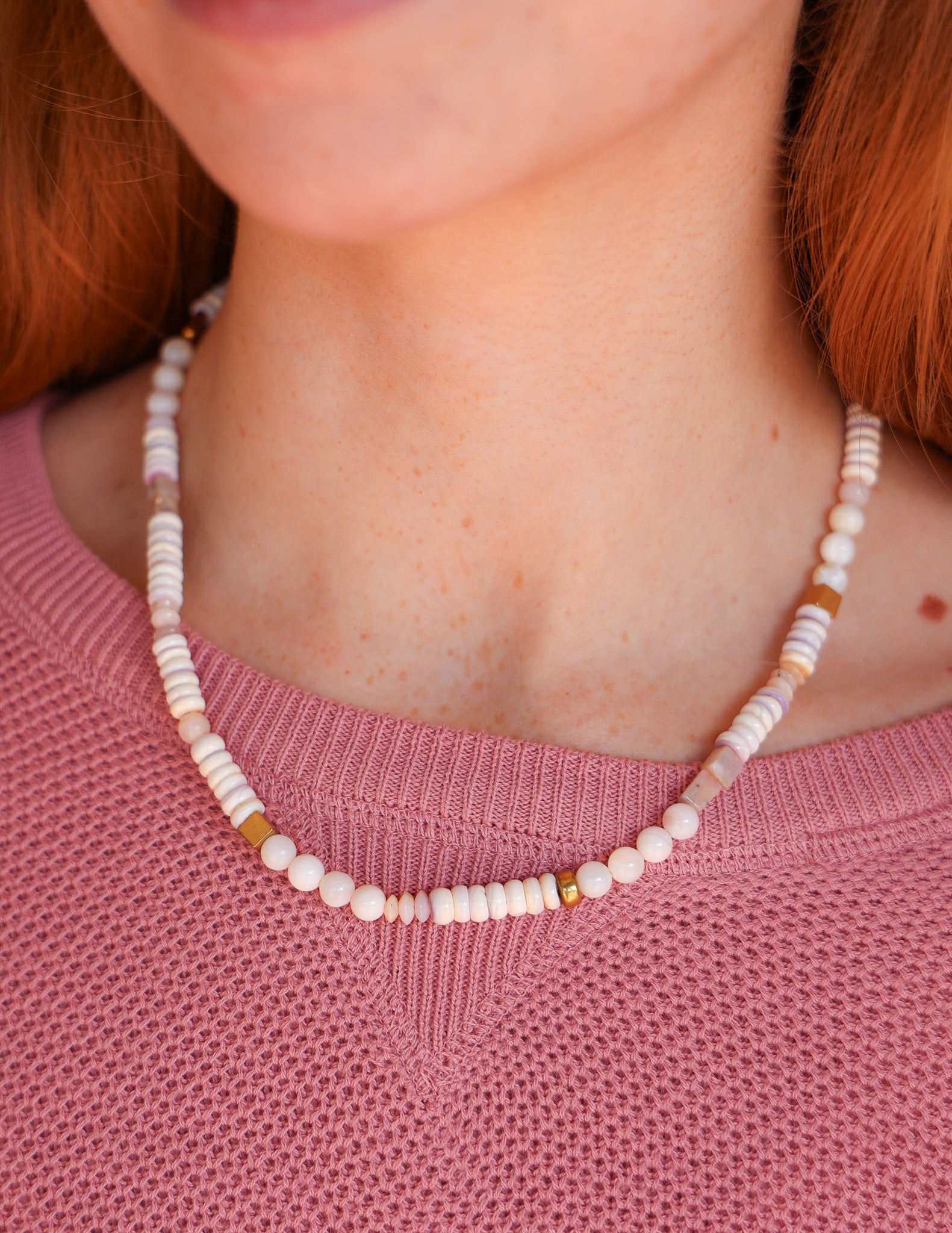 18" Esther Opal Necklace - Features genuine mother of pearl, pink opal, brass beads, and our exclusive ExVoto Vintage toggle closure in the back.