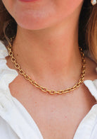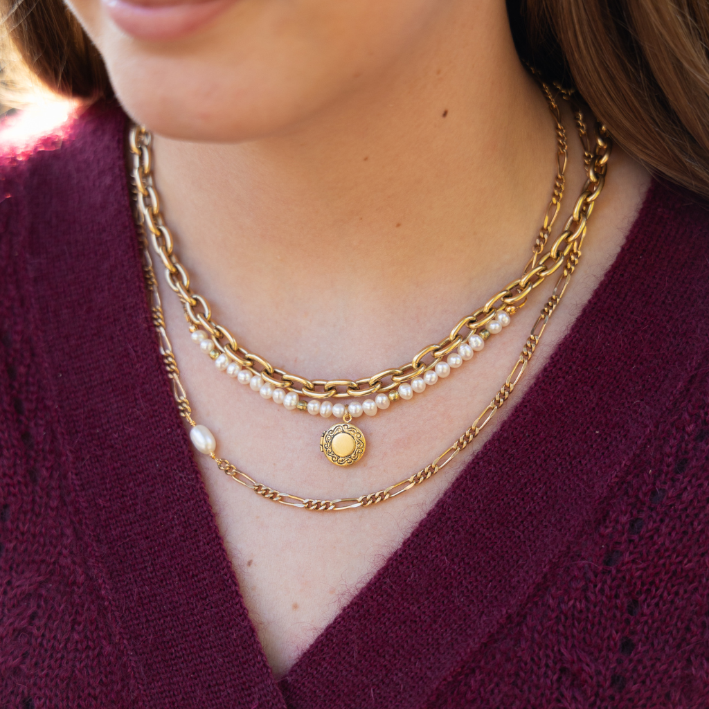 Plated in premium 18K gold and coated in our Forever Finish, which is resistant to tarnishing with proper care, allows for extended wear. Our gold plating is a special formula with a matte luster for a look of vintage patina, as opposed to a high-shine surface. Each piece of ExVoto is plated in the same gold plating formula so that they can be worn together, however the depth of the patina may vary slightly between chain styles.