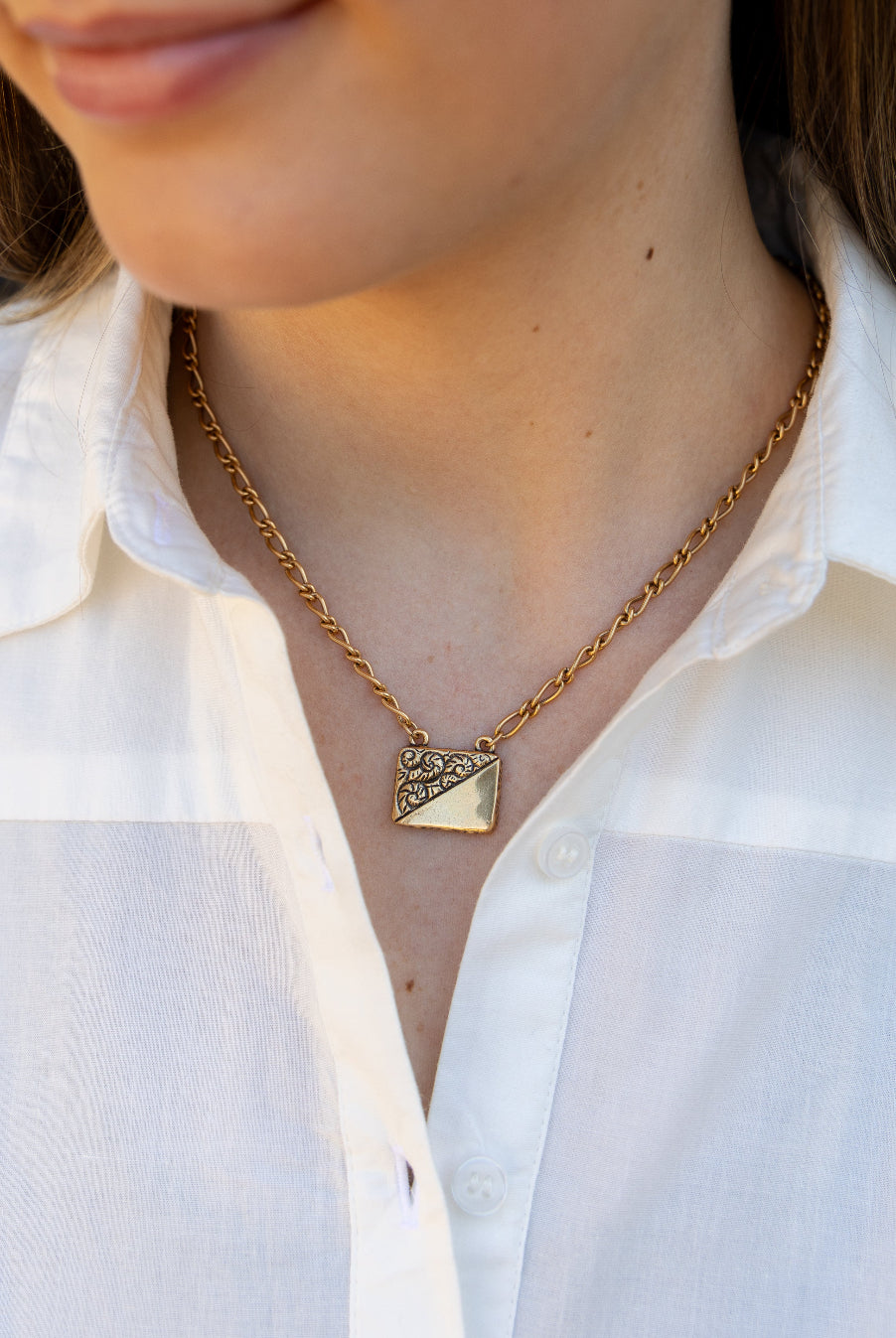 "I’ve been wearing my monogrammed shield necklace incessantly and gotten many compliments! It’s a strong piece and looks great layered. I also love it’s on trend but feels unique."