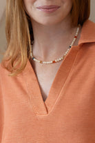 - 18” Esther Necklace featuring genuine mother of pearl, rose quartz, apatite, carnelian, citrine, and our exclusive toggle closure.