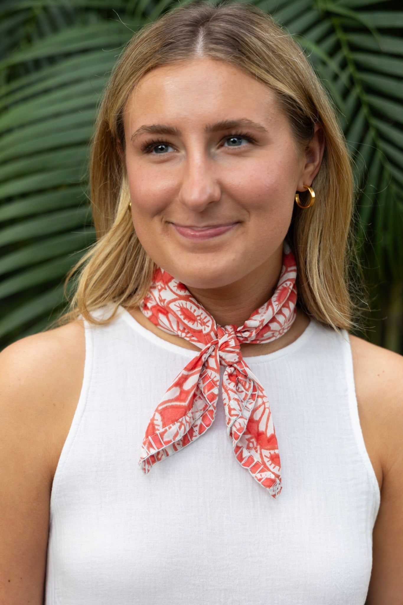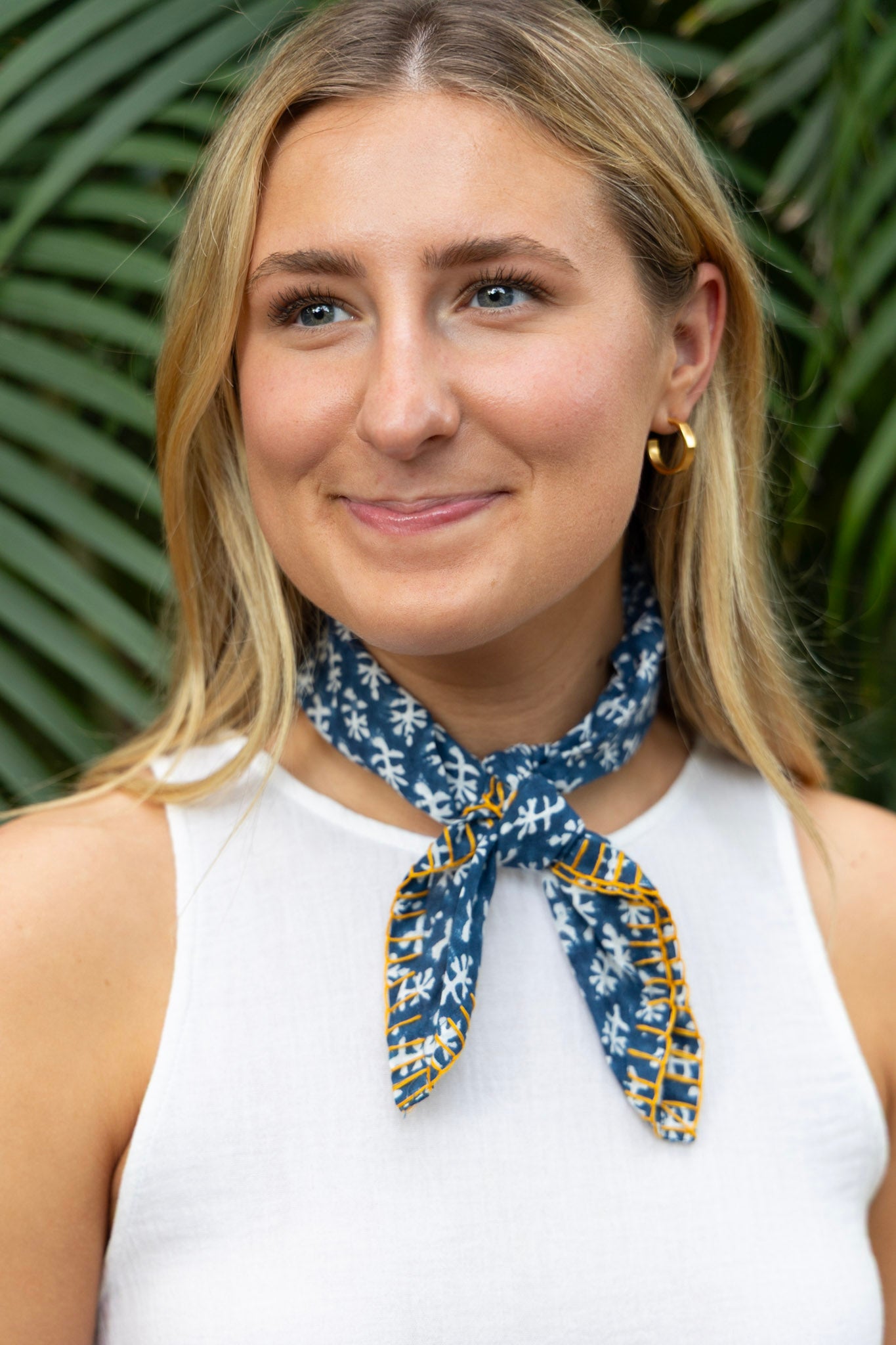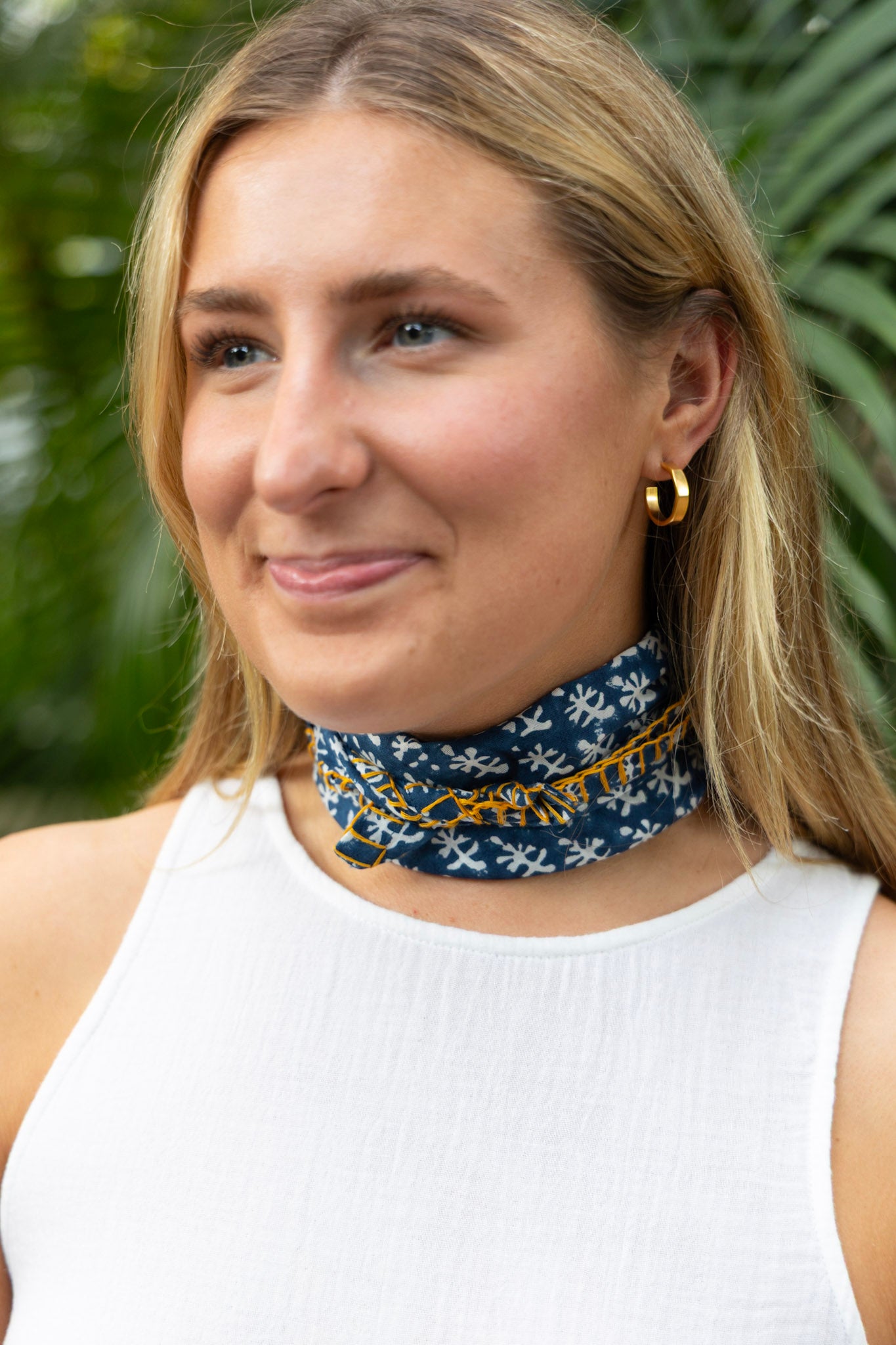 This cotton hand block print bandana features a blanket stitch detail. Can be worn around the neck or tied to a tote bag to add a pop of color!