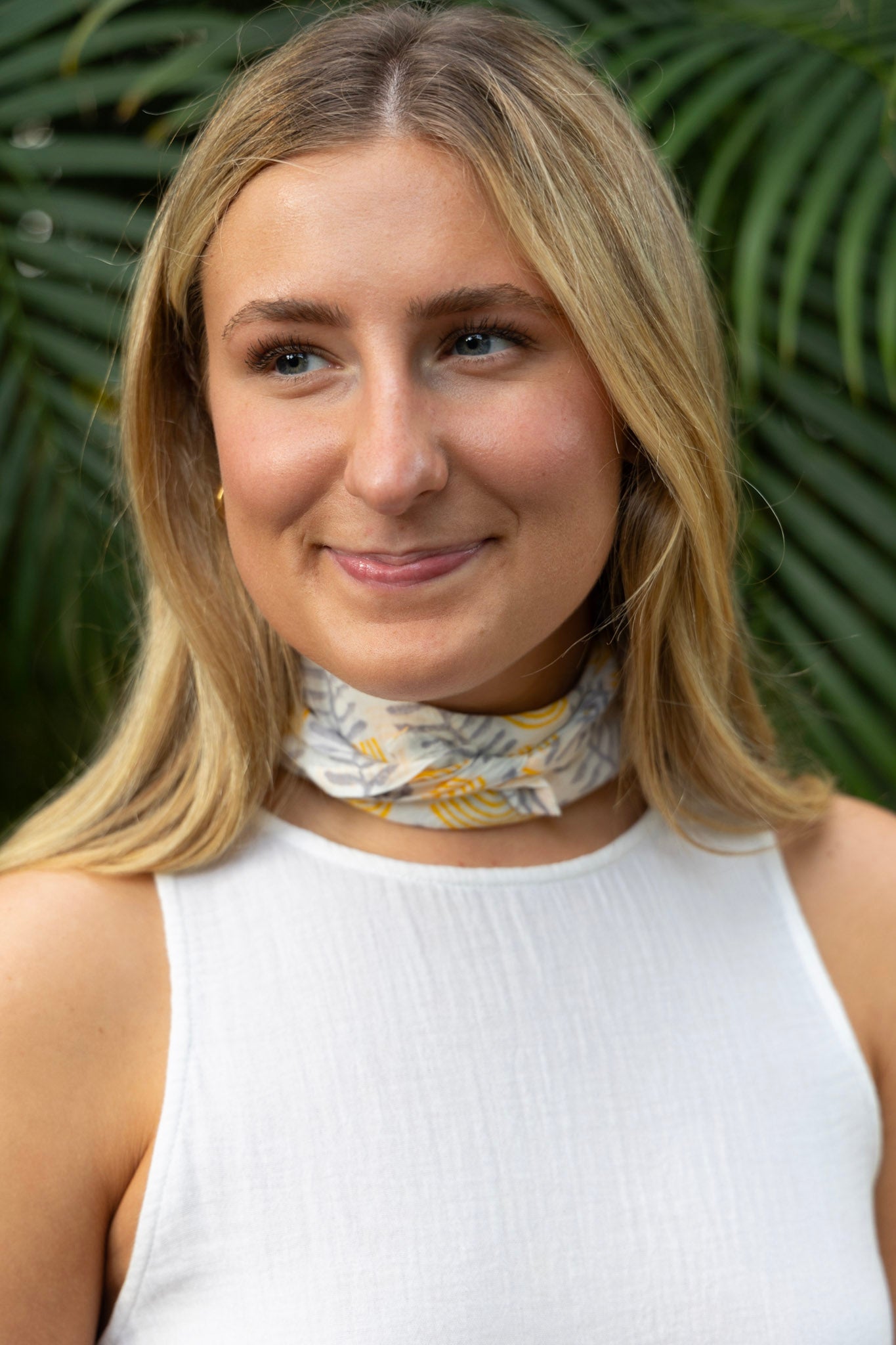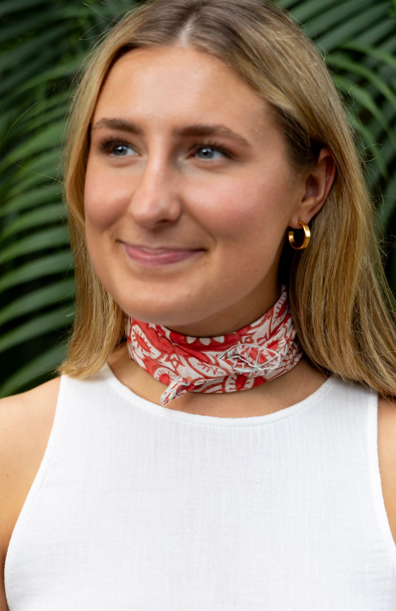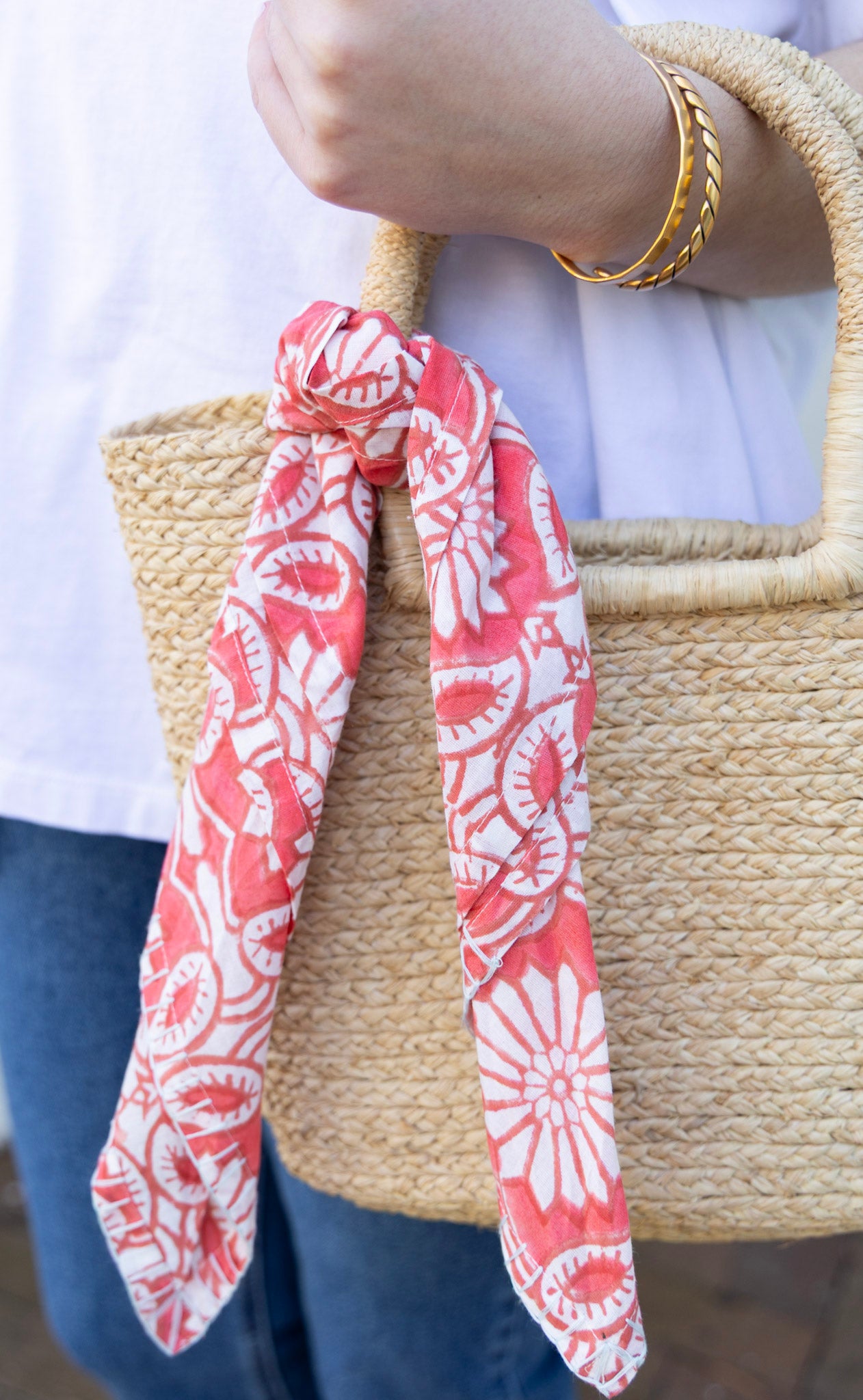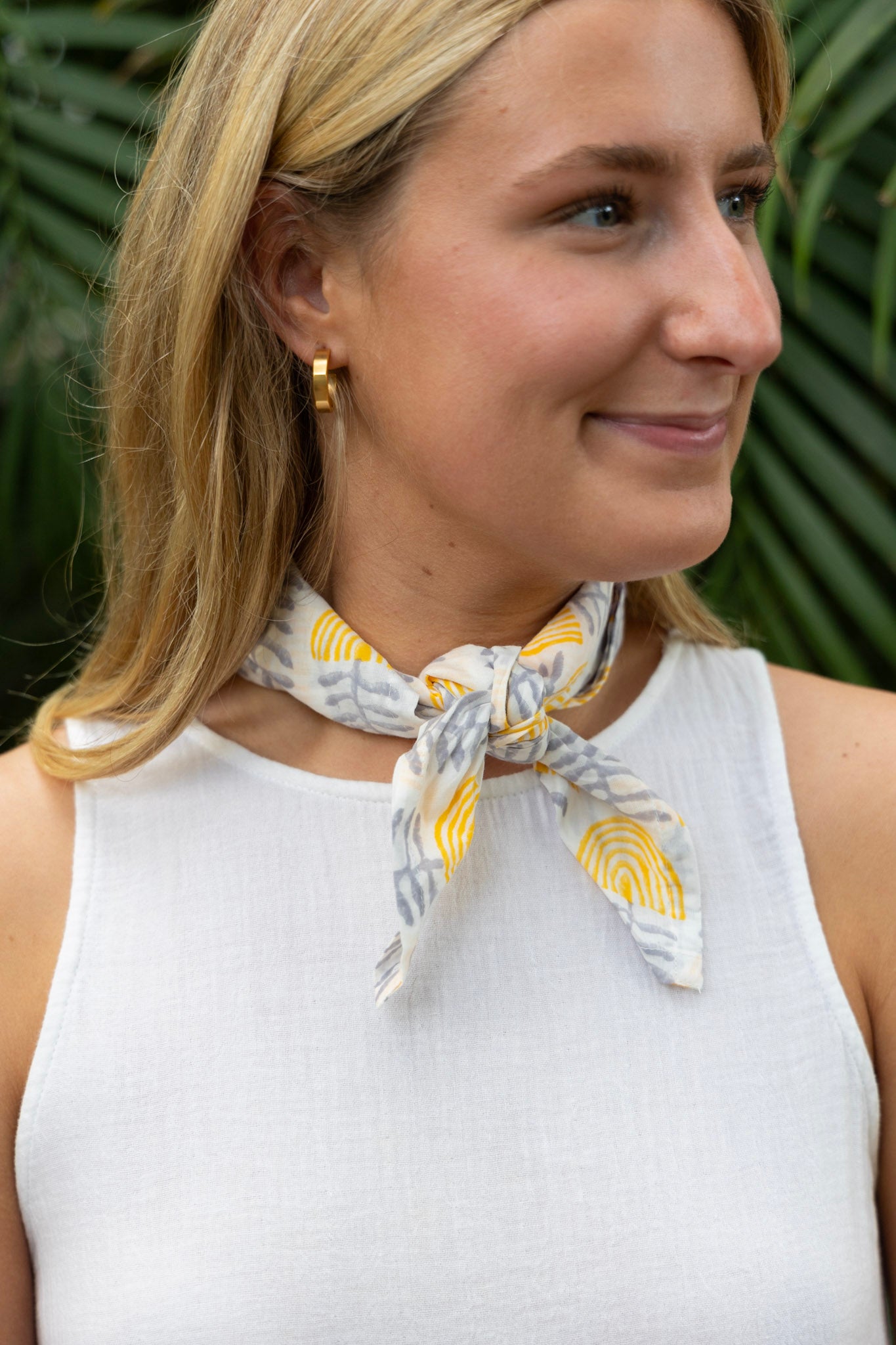 This cotton hand block print bandana features a blanket stitch detail. Can be worn around the neck or tied to a tote bag to add a pop of color!