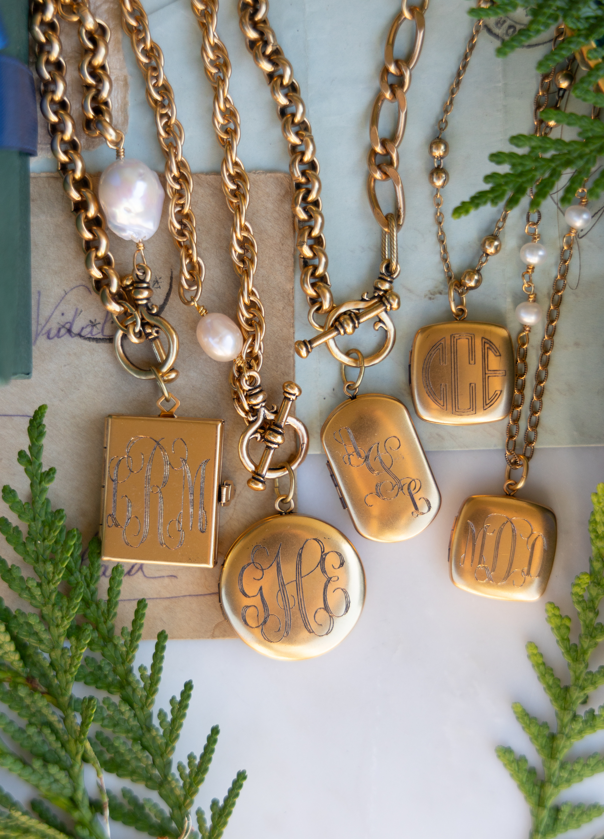 • 18" necklace featuring a gold chain with a protective matte finish and your choice of plain gold chain or with fresh water pearls and a square locket.