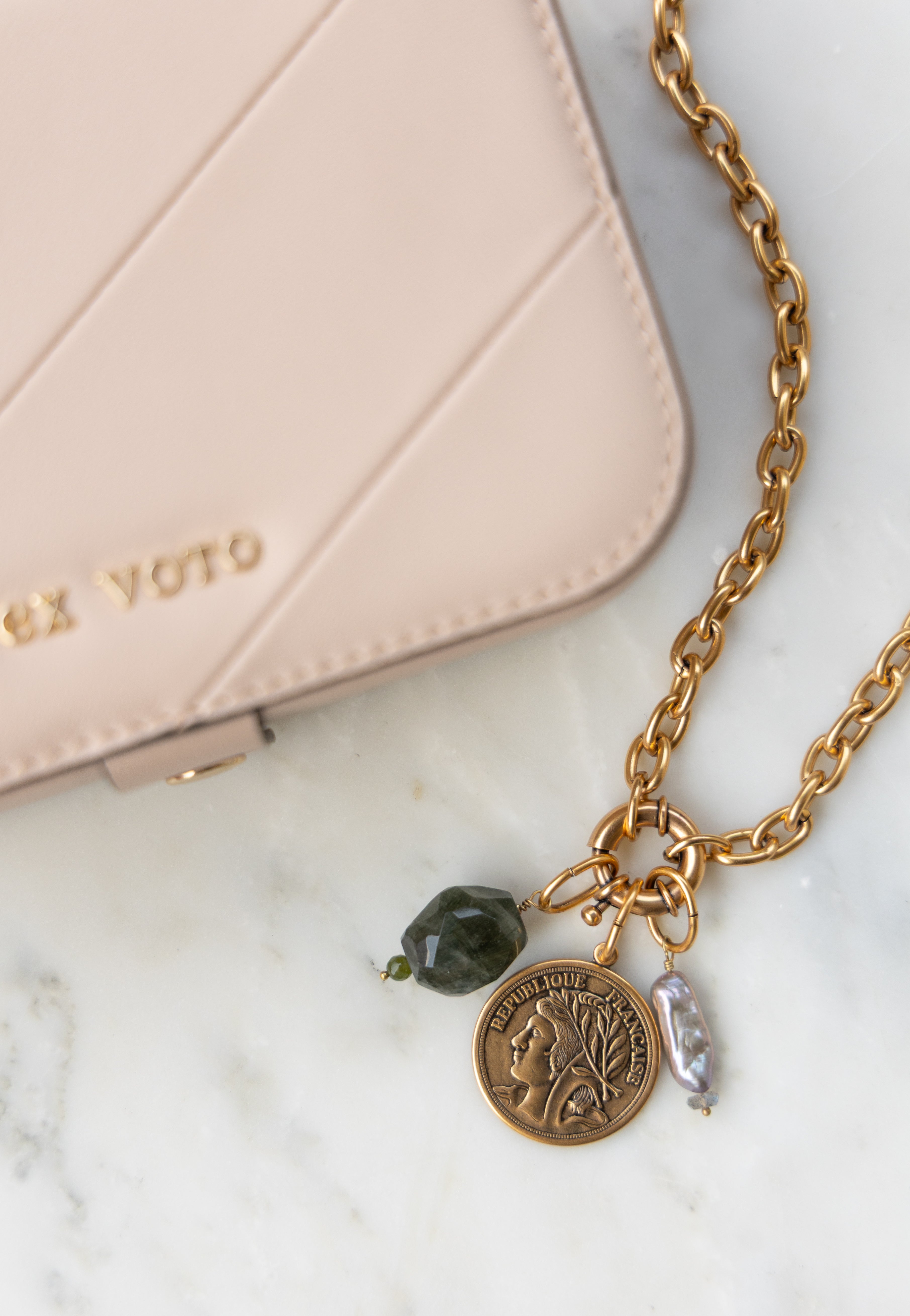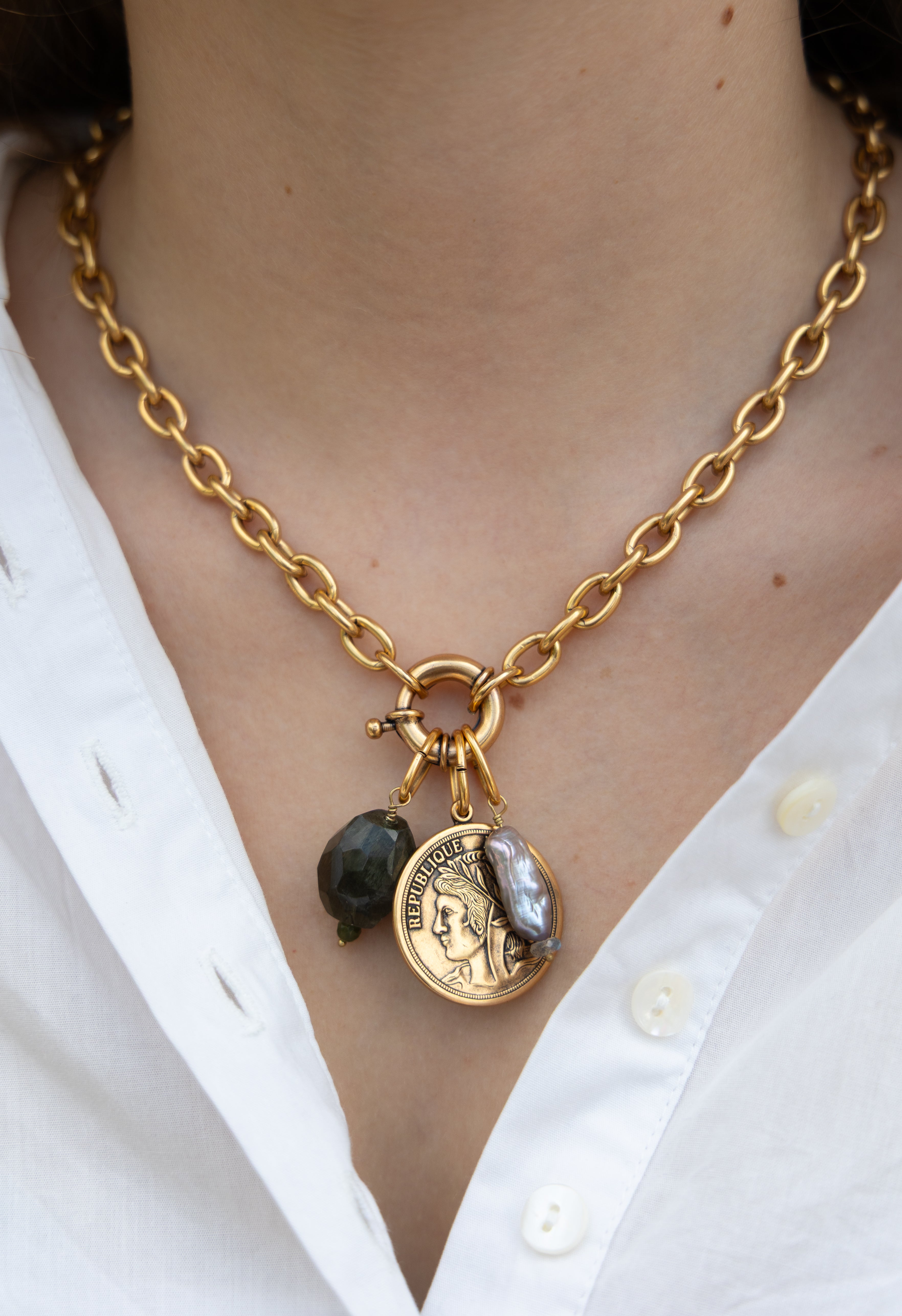 Discover the Fall Getaway Set, featuring three charms made from vintage components, freshwater pearl, and semi precious stones. This set includes the 18" Jenny Necklace in Gold Plated, Large French Coin Pendant, Lodalite & Jade Charm, and Grey Stick Pearl Charm.