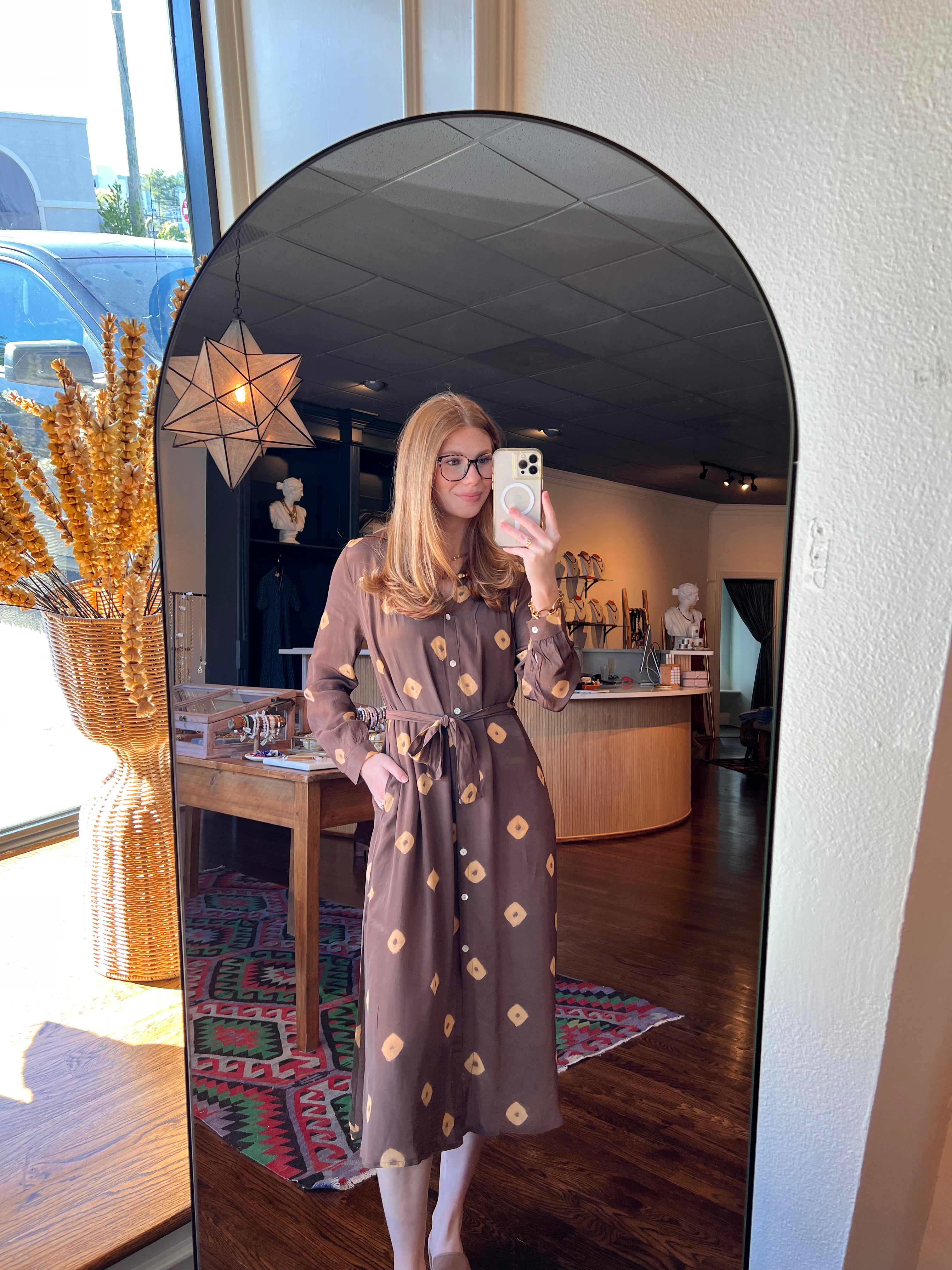 STYLE TIP: STYLE TIP: The Ari Blouse is now available as a Midi Dress! Made from soft, elegant cupro crepe fabric, this dress features a flattering shape in a soft cocoa shade that pairs well with black or deep brown. It includes a removable tie sash belt to highlight the waist.