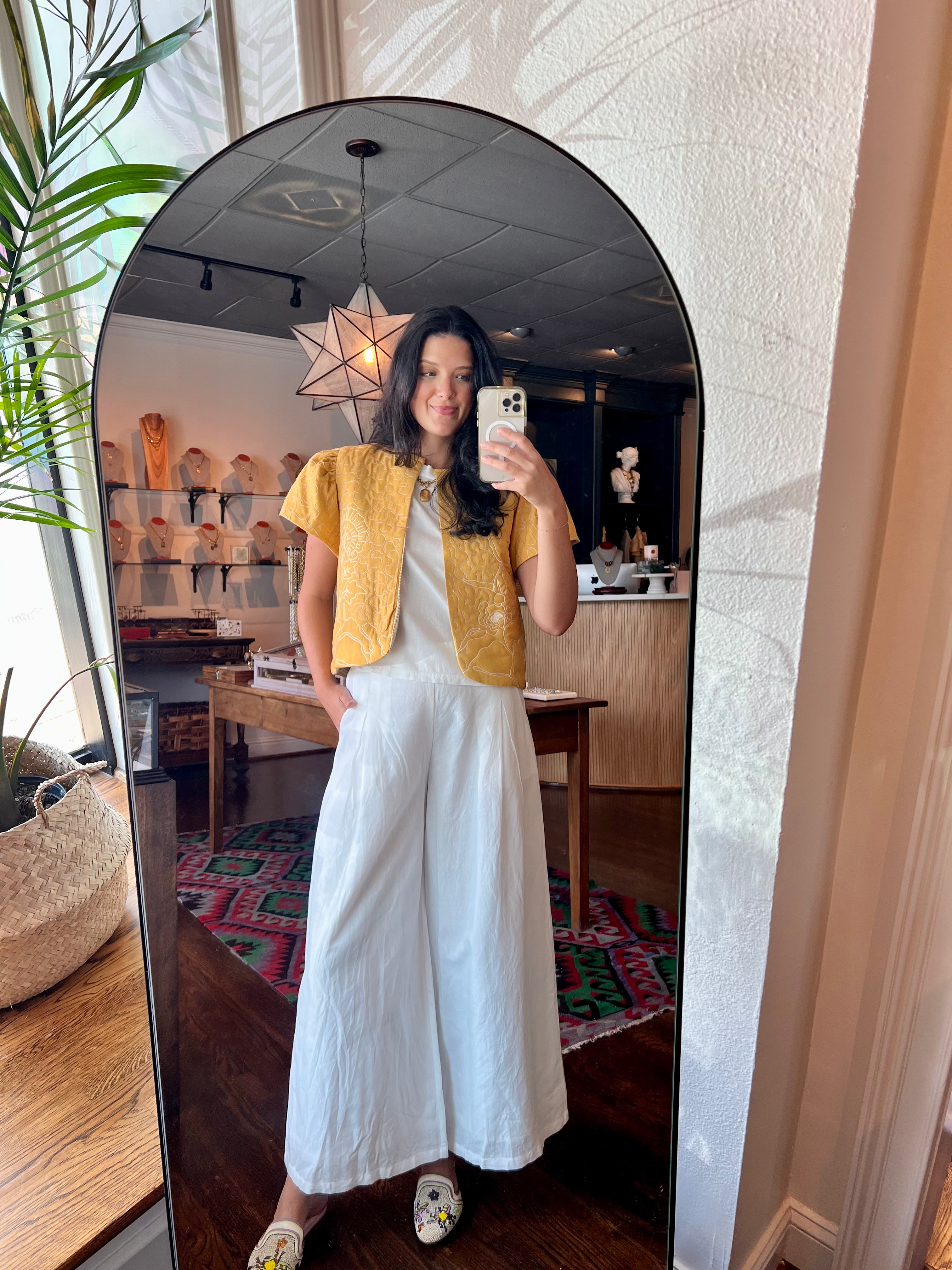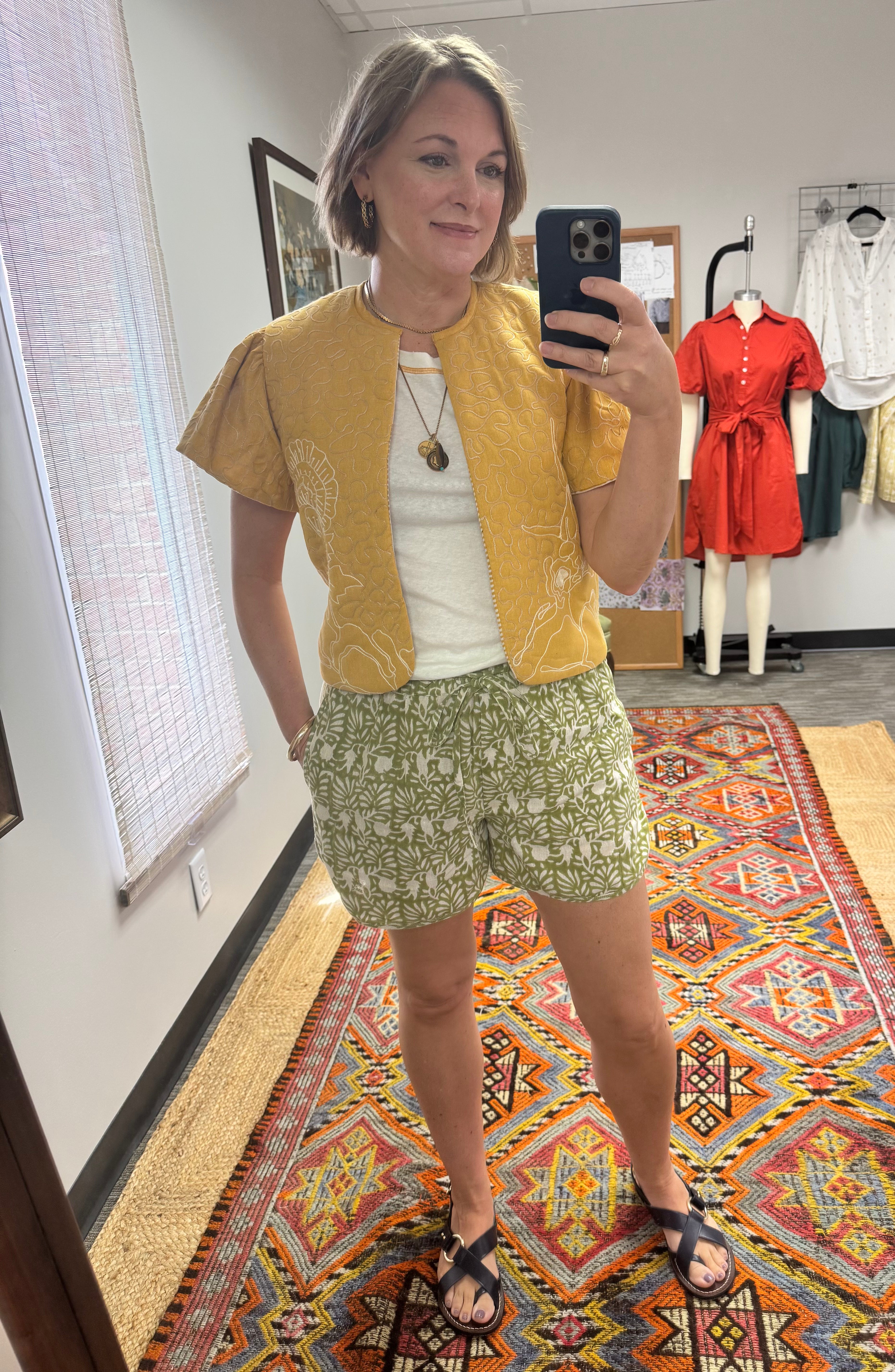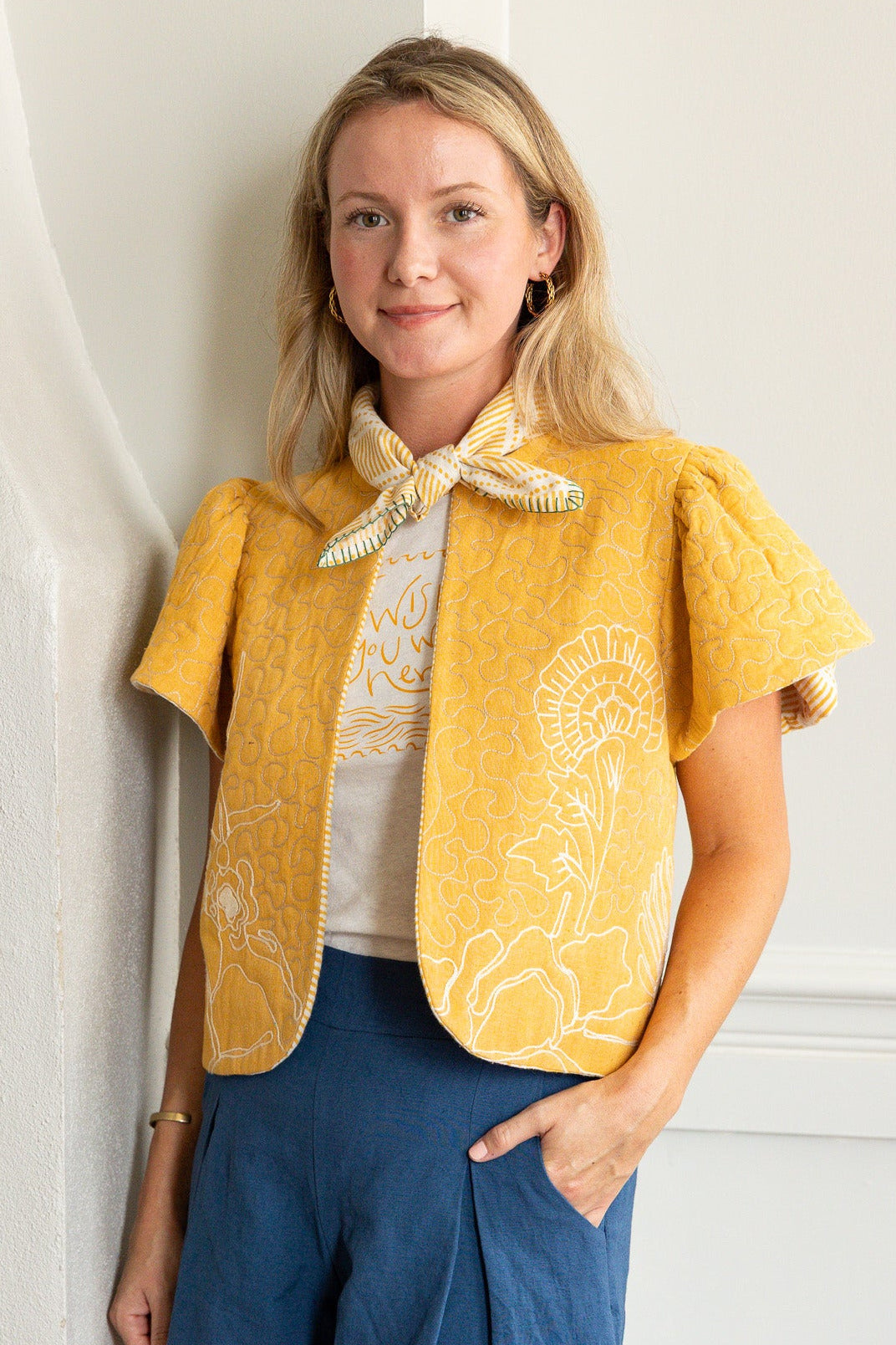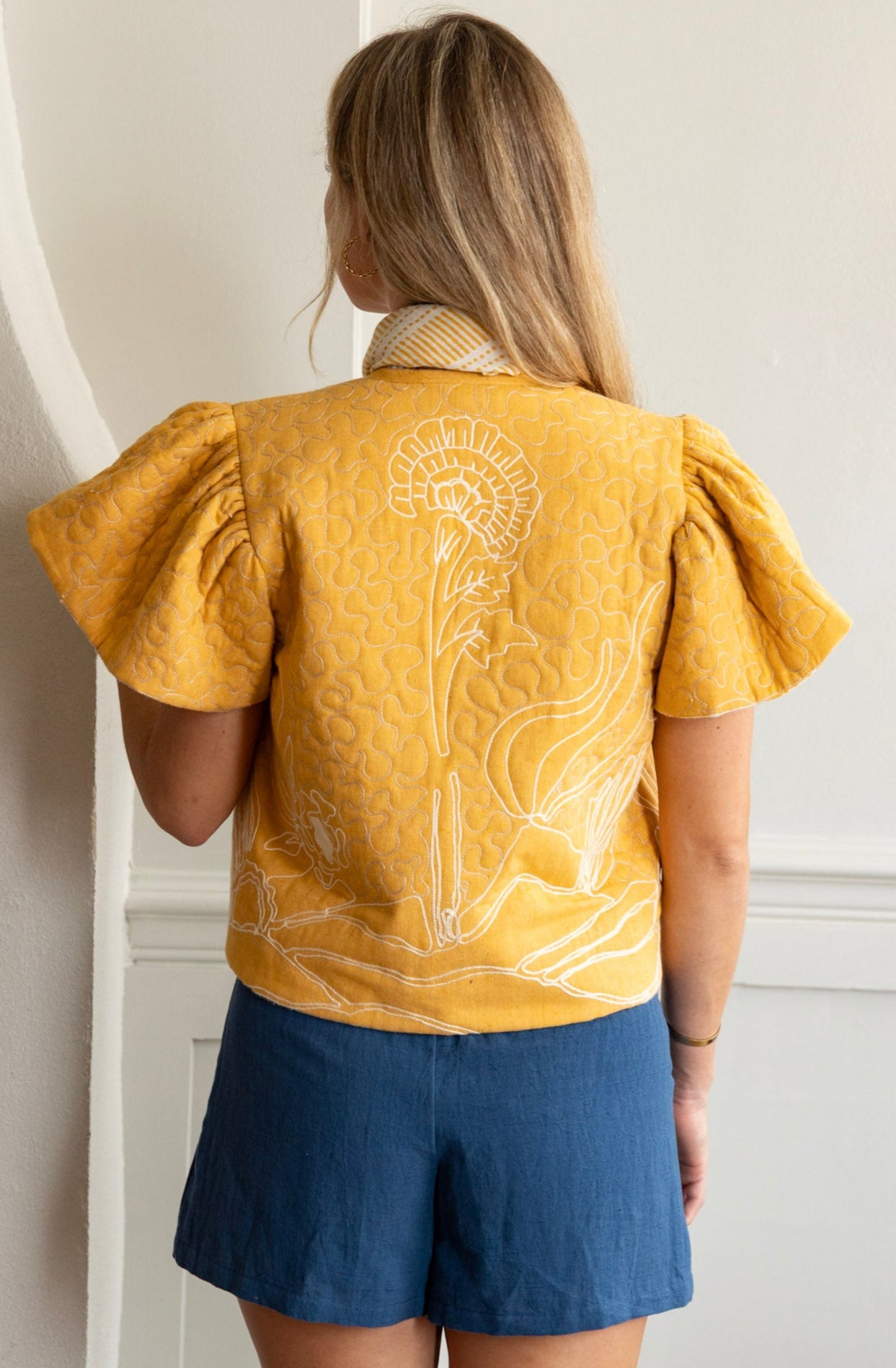 STYLE TIP: Discover the Darby vest, a fun versatile layering piece for your wardrobe. This vest is inspired by a vintage piece discovered by our Designer Elizabeth Adams. Crafted from soft amber yellow cotton, it has two styles: one side with embroidered flowers and the other with a handblock print of lines and dots. It includes flutter sleeves and reaches hip length, perfect for layering over a tank or long sleeve. This vest easily moves from fall to spring and summer wear, style it your own way!