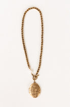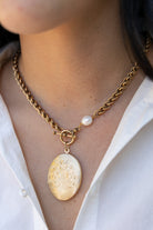 - 18" necklace features plated 18k gold chain with a protective matte finish, a freshwater pearl, and our Exclusive ExVoto Vintage toggle at front
